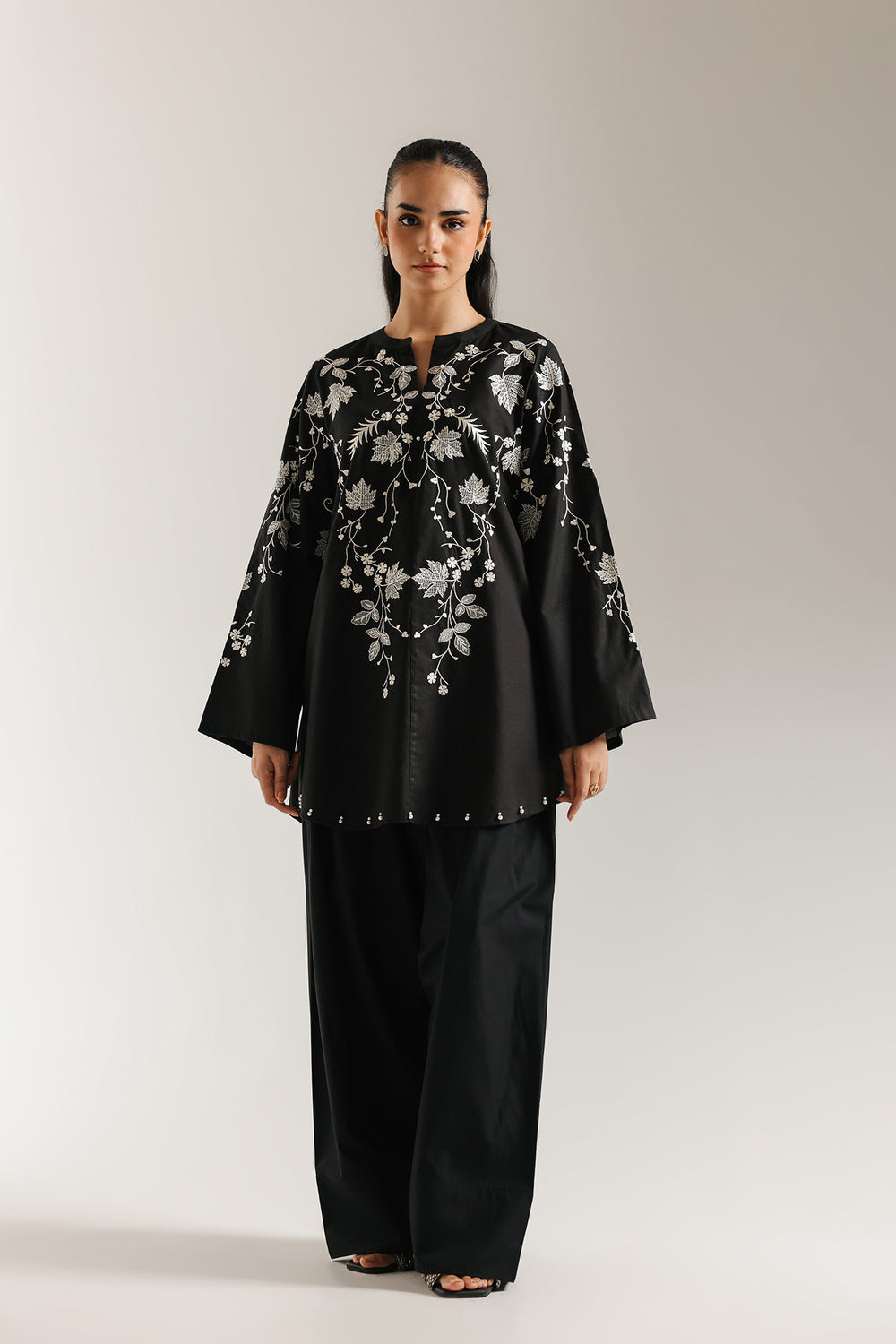 Dramatize your wardrobe with this striking white embroidered shirt. This short, relaxed-fit shirt is crafted from a deep black fabric, creating a perfect canvas for the intricate work. It features gorgeous white thread embroidery in a dense floral and vine pattern across the yoke, shoulders, and sleeves. The ban neckline has a subtle V-slit, and the voluminous, long sleeves are finished with a neat cuff.