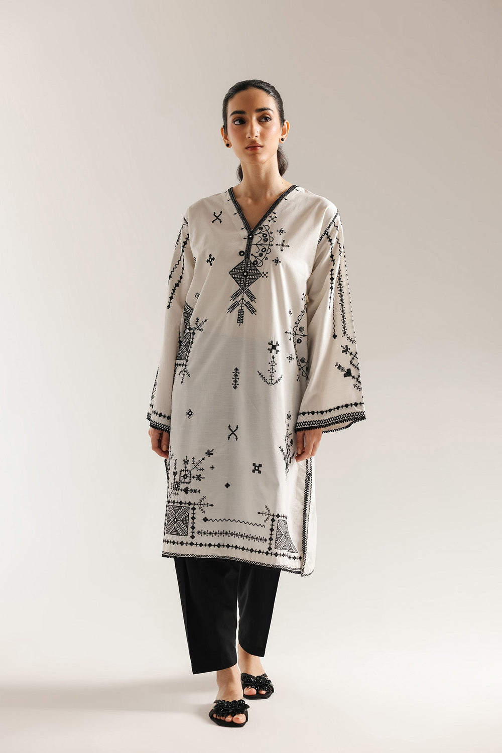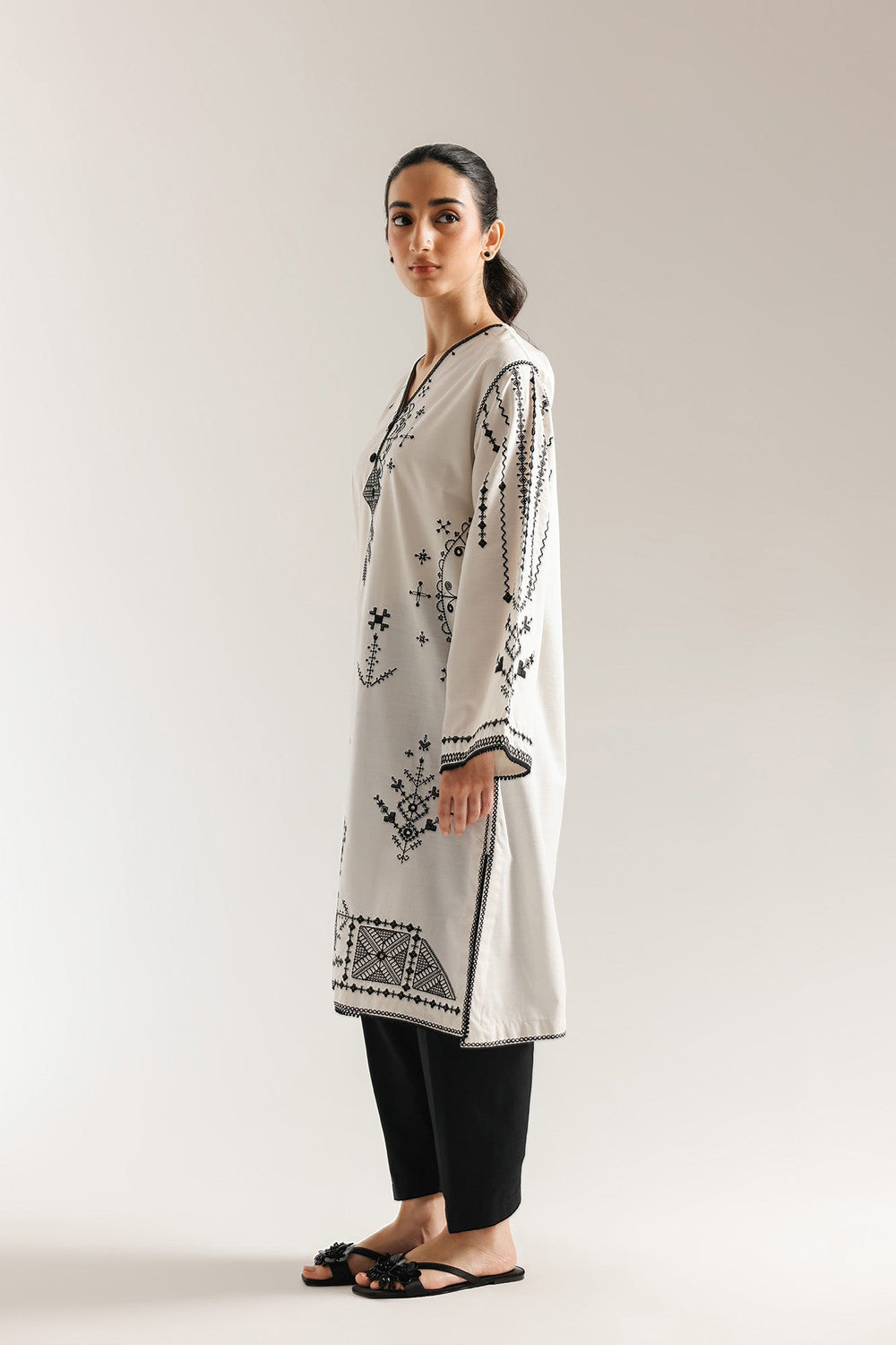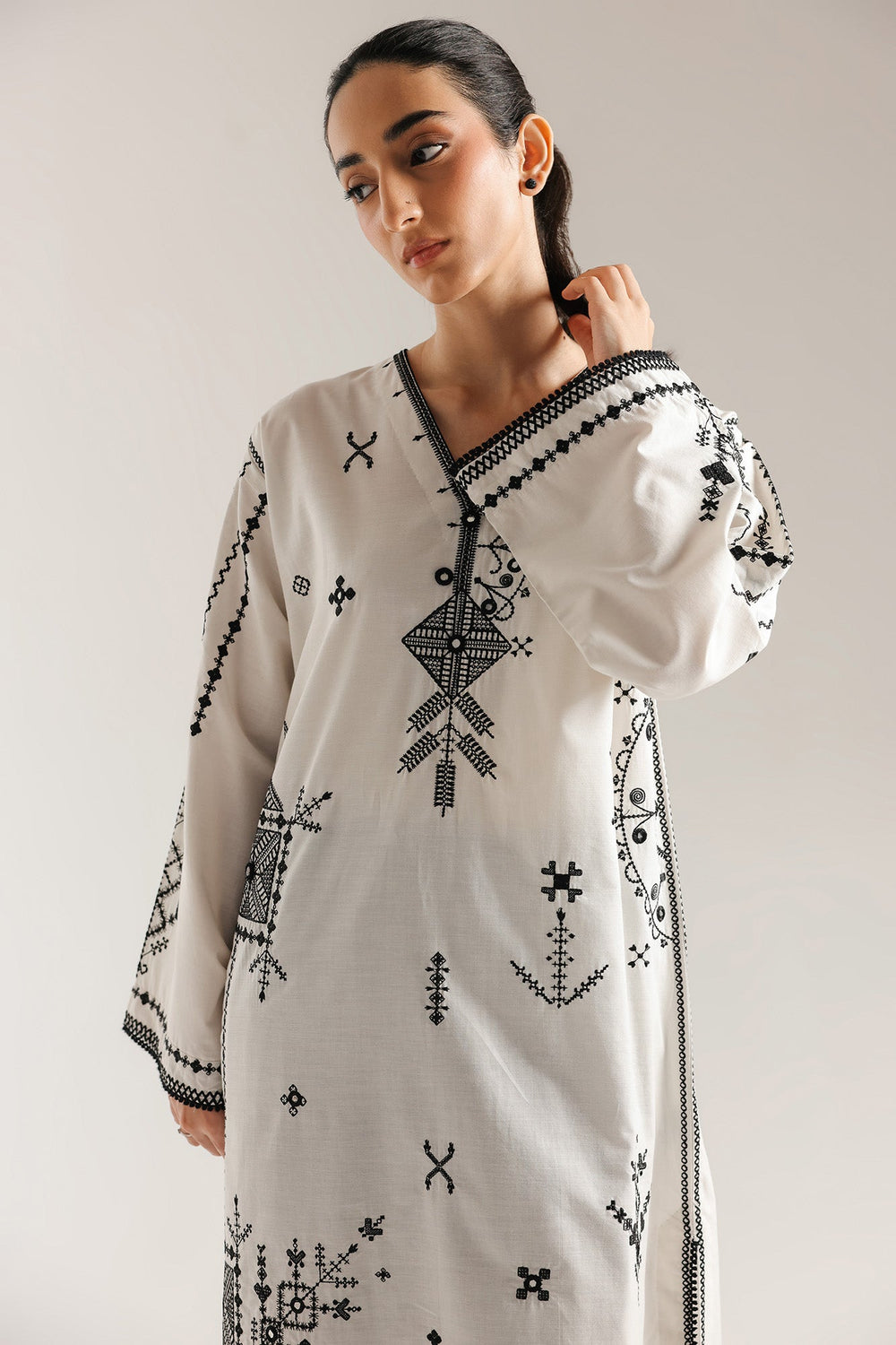 Emmbrace the artistry of monochrome with this striking embroidered shirt. This long white shirt features a comfortable, straight fit silhouette. It is adorned with intricate black and white geometric patterns and subtle embroidery throughout, creating a look that is both modern and elegant. The shirt has a classic V-neckline and full sleeves. With its relaxed fit and unique design, this shirt is perfect for making a sophisticated statement at any event.