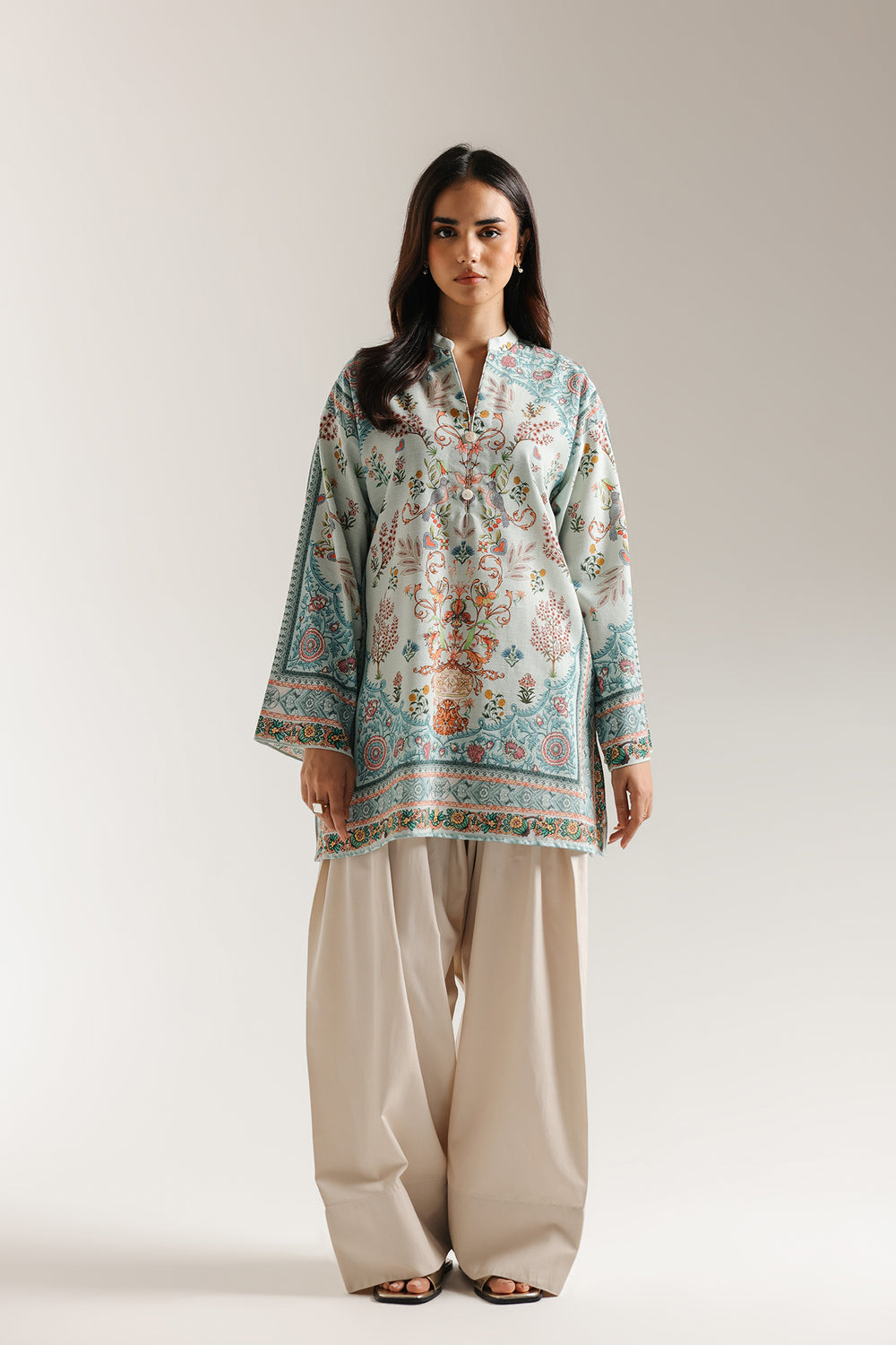 Capture the refreshing artistry of spring with this delightful ice-blue printed shirt. This short, relaxed-fit shirt is crafted from a cool, light fabric and features an exquisite all-over ornamental print. The print showcases elaborate floral and stylized motifs, including central decorative elements in shades of rust, sage green, and muted teal. The neckline is detailed with small buttons, and the long sleeves and hem are beautifully finished with coordinating borders. This shirt is perfect for everyday wear.