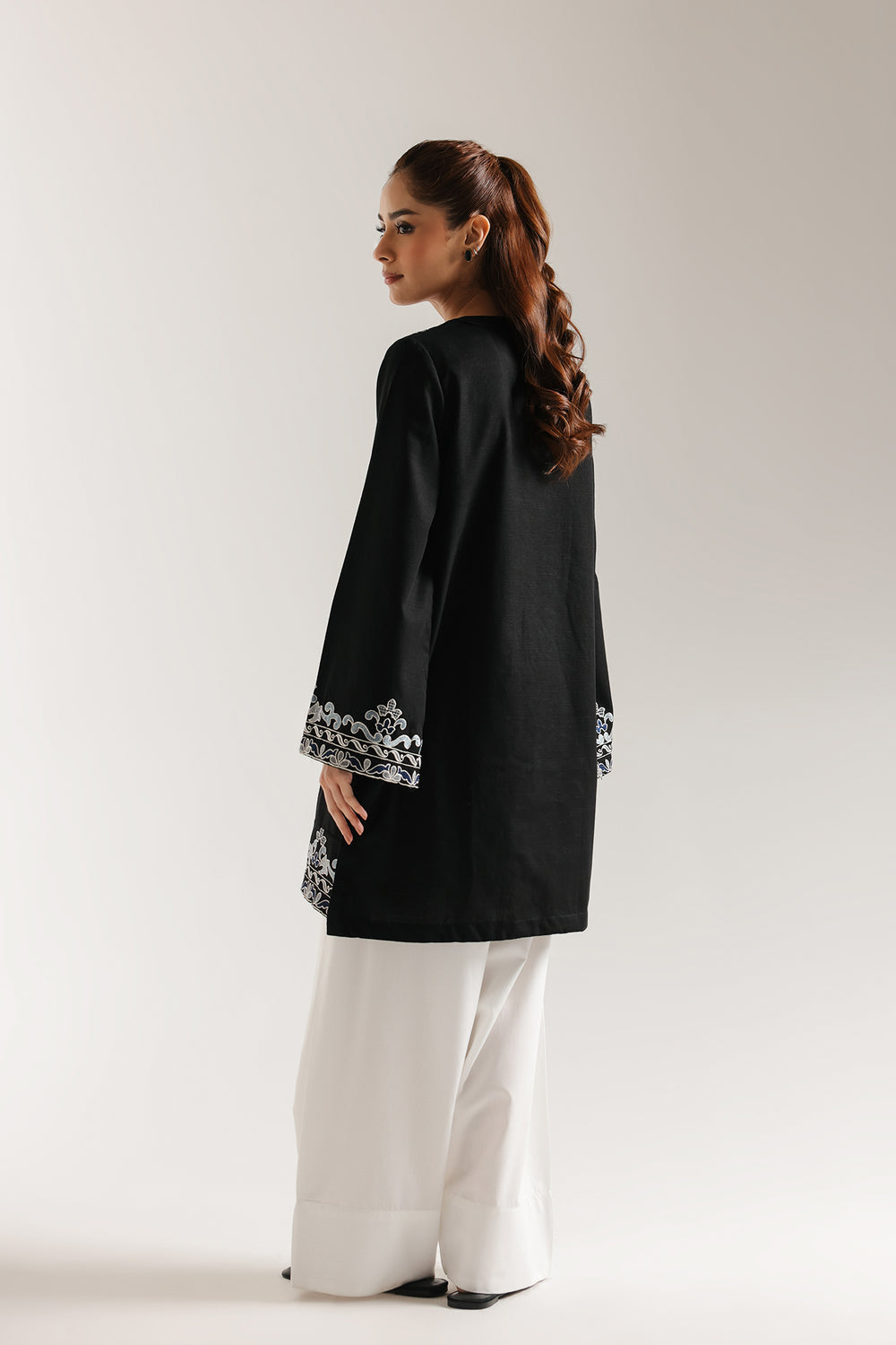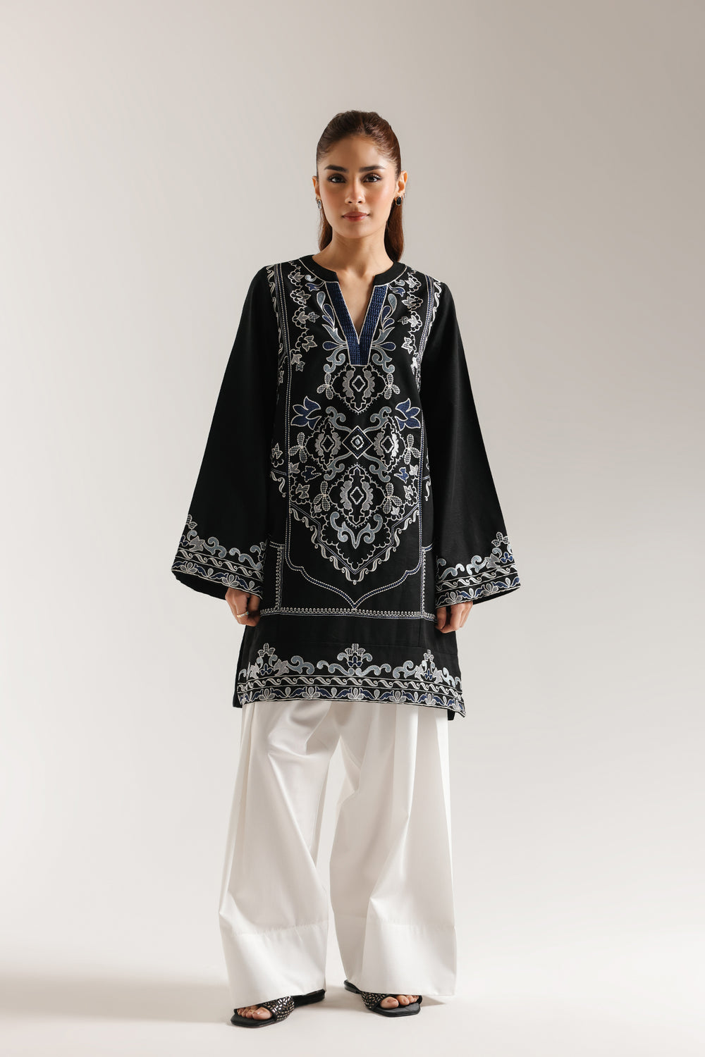 Crafted from premium black fabric, this sophisticated embroidered shirt showcases meticulously detailed floral motifs in white, light blue and deep blue tones. The refined hemline and tailored silhouette create an understated elegance that transcends seasonal trends. An investment piece that seamlessly transitions from formal occasions to elevated everyday wear, offering versatile styling possibilities for the discerning wardrobe.