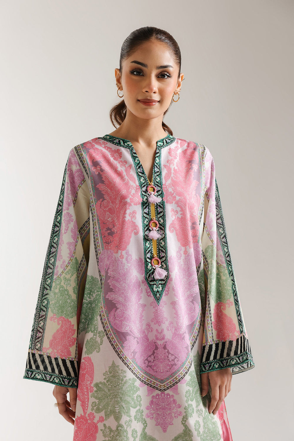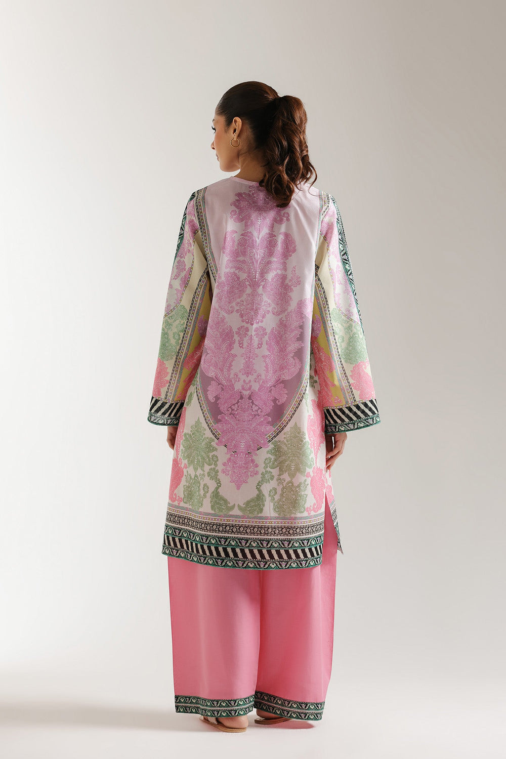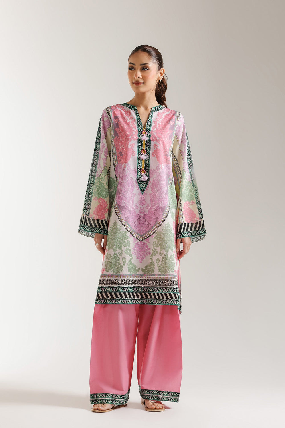 Float into a world of soft elegance with this outfit. Rose-tinted classy shalwar meet a contemporary shirt where dreamy paisley patterns in blush and sage dance across the fabric. A touch of sparkle graces the neckline, while bold geometric borders add a modern twist. Perfect for adding a chic touch to your summer wardrobe.