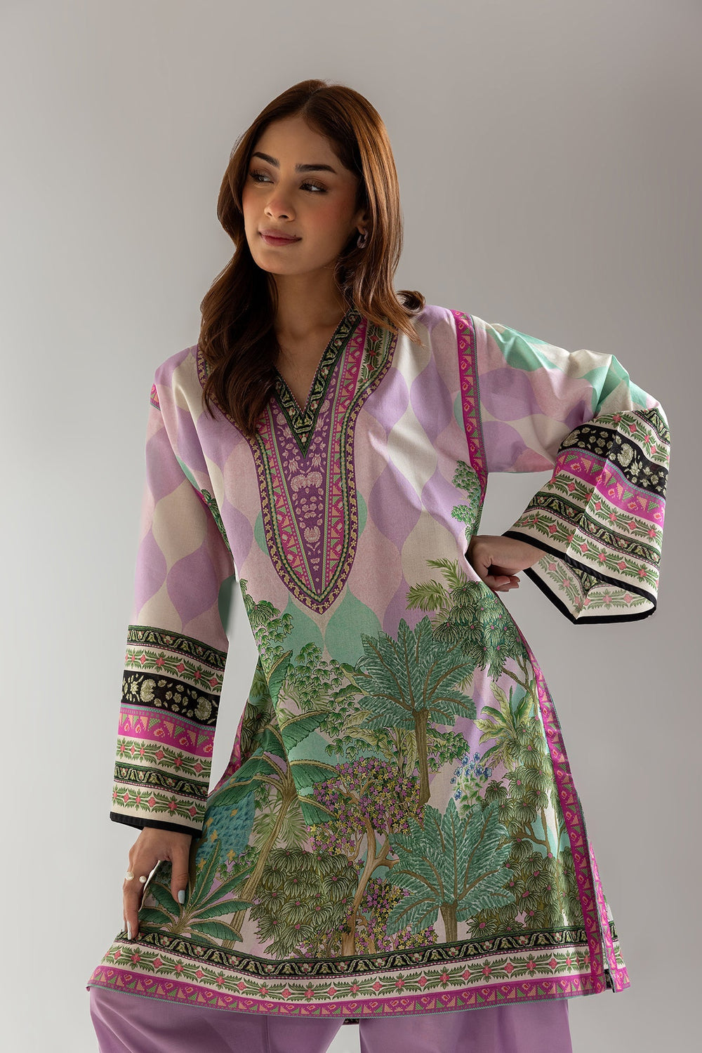 Step into a dreamy escape with this enchanting ensemble. Soft lilac straight-cut trousers set a serene base for the statement kurti, where pastel tones, intricate geometric patterns, and a whimsical tropical scene come together. Delicate florals and swaying palm trees are framed by bold black and vibrant pink borders, while a geometric motif highlights the V-neckline with a hint of traditional charm. This look blends artistry with elegance, perfect for those who embrace subtle sophistication in their style.