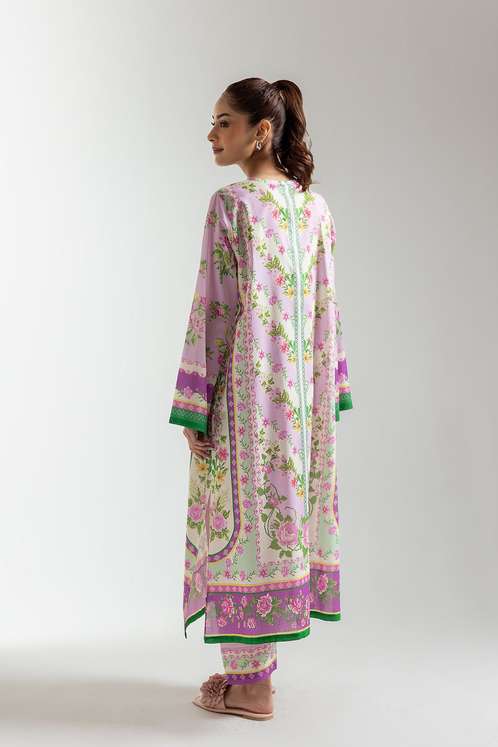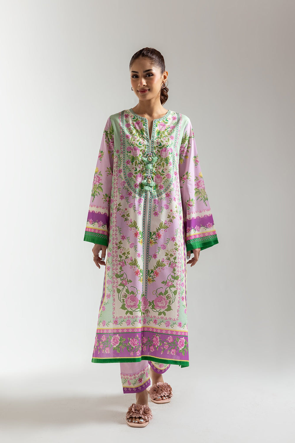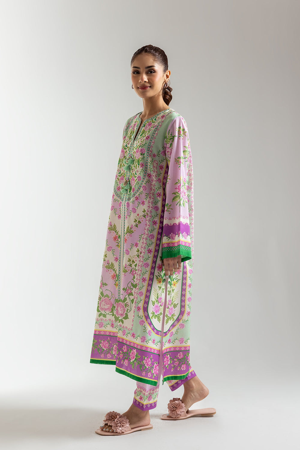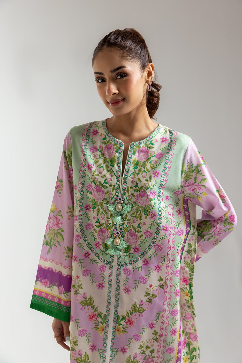 Immerse yourself in a floral fantasy with this enchanting outfit. The straight-cut shirt, in a soft ice pink hue, is a canvas for a vibrant tapestry of flowers and leaves. The intricate design is further enhanced by contrasting green borders on the sleeves and hem of both the shirt and the narrow shalwar, creating a cohesive and stylish look. This outfit is a celebration of nature's beauty, perfect for adding a whimsical touch to your wardrobe.