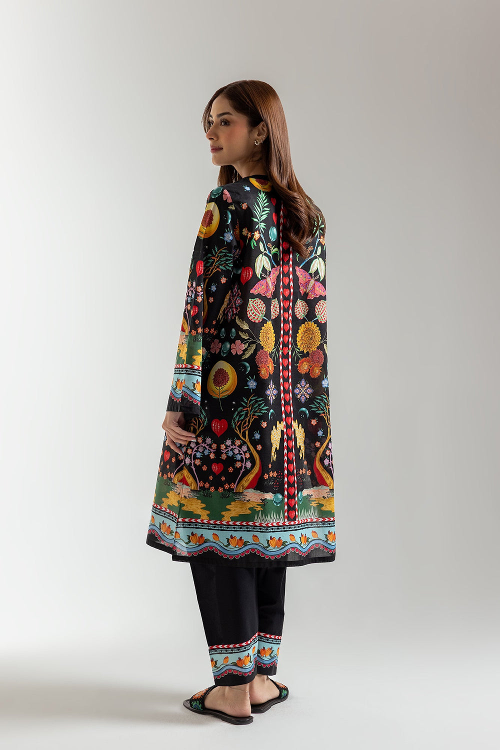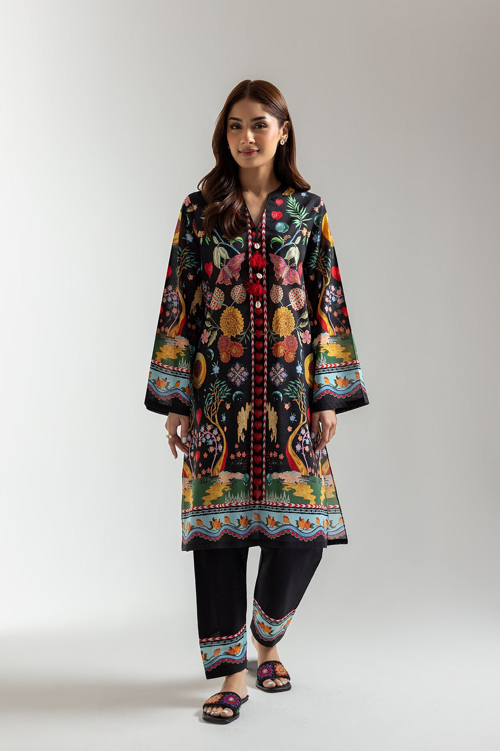 Dive into the vibrant world of this captivating outfit. This ensemble features a striking black shirt adorned with a mesmerizing tapestry of colorful floral, butterfly, and scenic motifs. The intricate detailing extends to the cuffs and hem, creating a cohesive and artistic look. The shirt is paired with matching black trousers that echo the detailed patterns at the hem, completing the outfit with a touch of elegance. This outfit is a celebration of art and fashion, perfect for making a bold style statement.