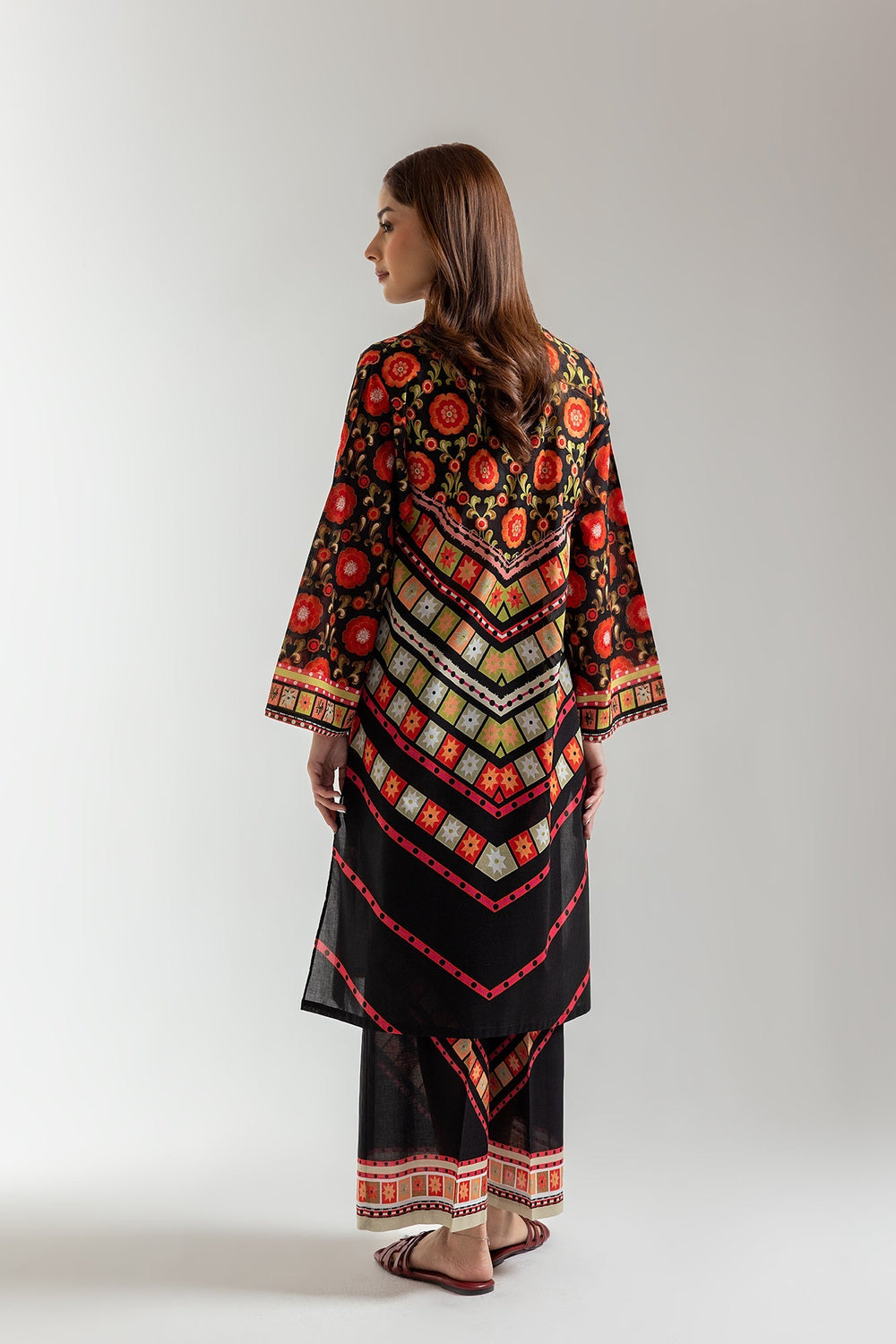 Make a striking statement in this vibrant black ensemble, featuring a classy shirt adorned with eye-catching floral motifs and intricate geometric patterns in rich shades of red, orange, and olive green. The V-neckline and flared sleeves add a touch of elegance, while the chevron placement print enhances the silhouette with dynamic symmetry. Paired with matching wide-leg culotte trousers bordered in coordinating patterns, this ensemble merges tradition with modern flair — perfect for festive gatherings or chic everyday style.