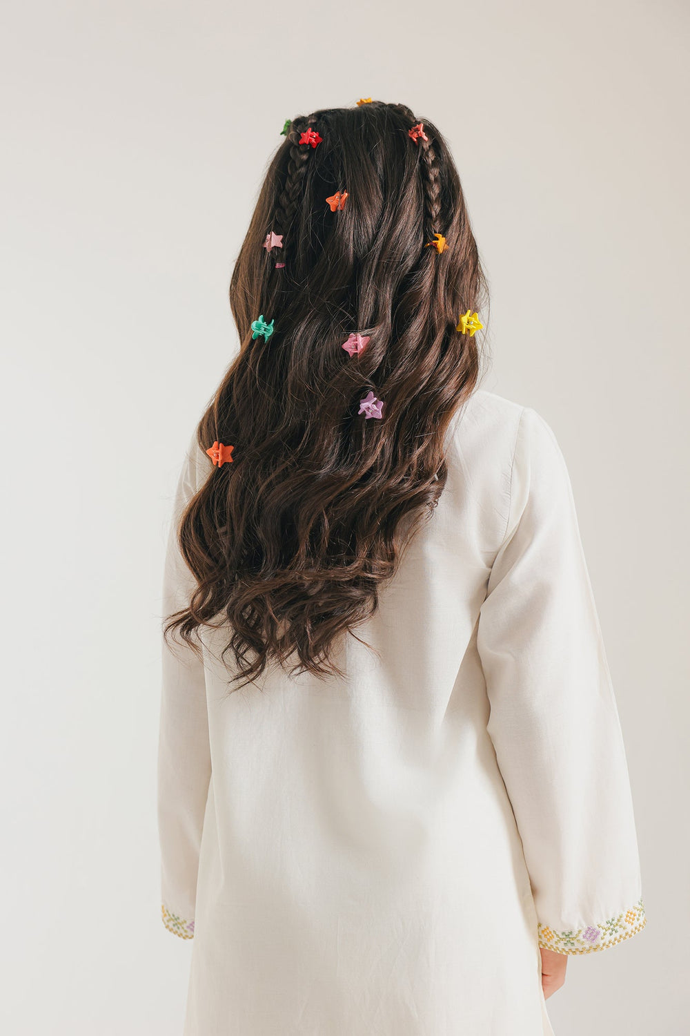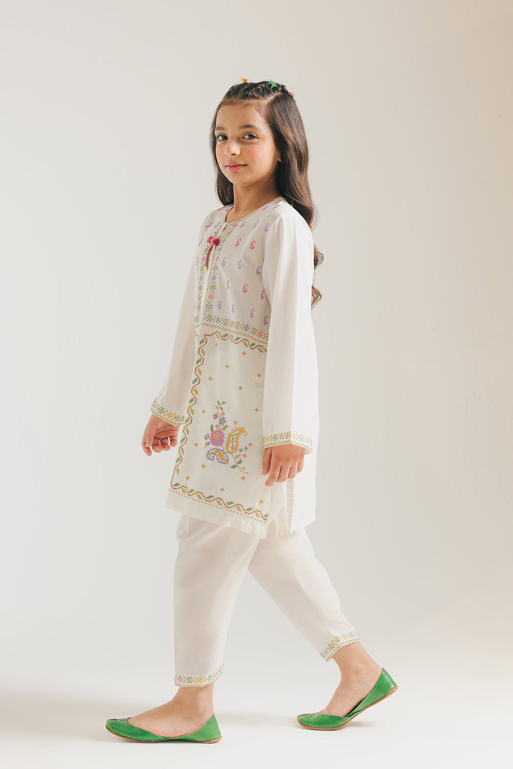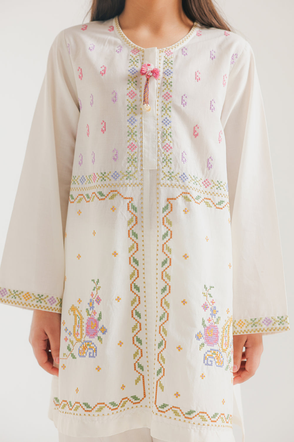 A contemporary composition crafted in a trendy silhouette shirt beautifully adorned with captivating floral designs embroidered in vibrant colors illustrating traditionally rich elements. Paired with a classy embroidered shalwar, this style statement outfit is a perfect option for your girls to embrace at fun occasions.