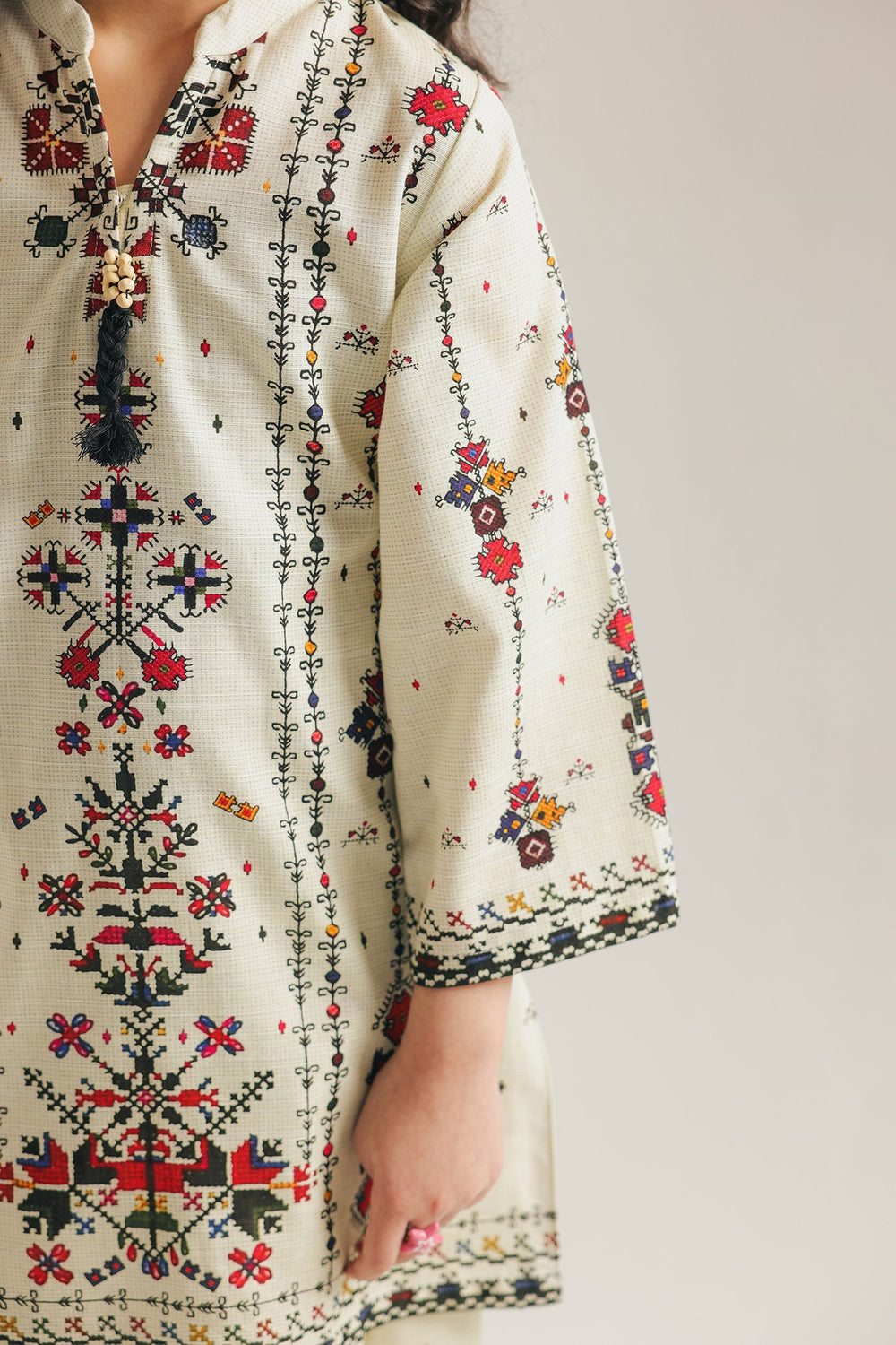 Dress her in this elegant off-white printed suit. This beautiful two-piece set features a kurti with an intricate, multi-colored geometric and floral pattern, creating a sophisticated and artistic look. The suit is completed with matching shalwar that have a scattered print, making this a perfect ensemble for a festive occasion or a stylish day out.