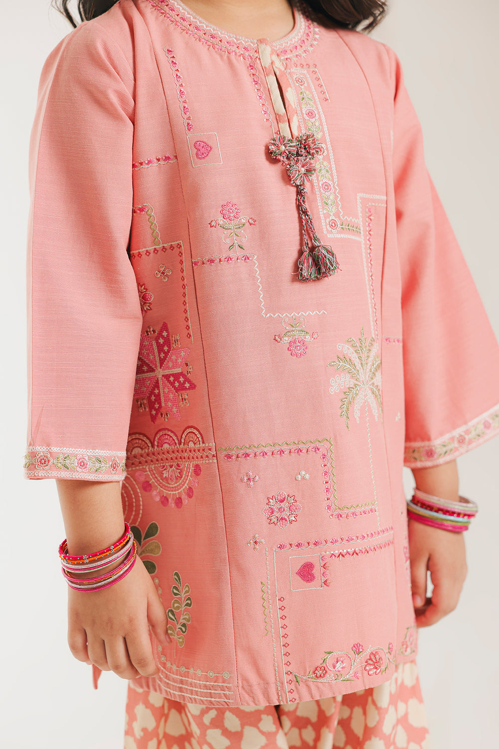 Sprinkle some playful charm into their collection with this delightful pink embroidered suit. The short, straight fit kurti is rendered in a soft coral pink fabric and features short sleeves. The front of the top is embellished with intricate multi-colored thread embroidery in various geometric and stylized palm tree motifs. A fun tassel accent hangs from the rounded neckline. The set is completed with comfortable, gathered shalwar featuring an all-over cream and pink spotted/dot print. This bright, coordinated look is perfect for celebrating special moments in comfortable style.