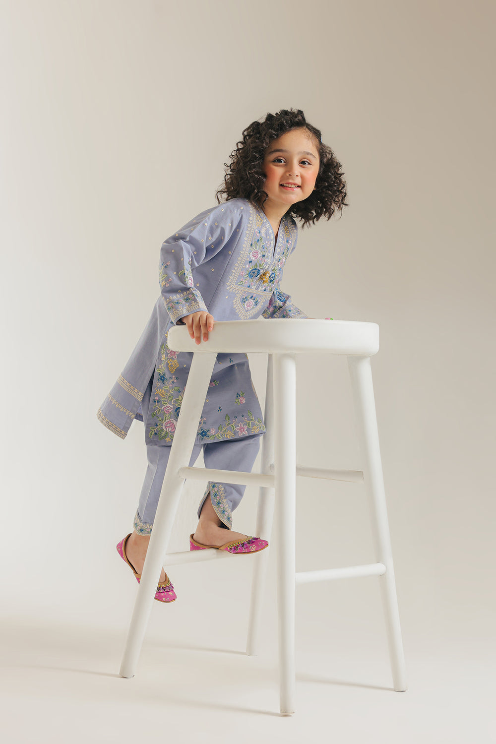 Dress your little darling in the sweet serenity of this beautiful embroidered suit. The charming lilac-blue kurta is richly embellished with delicate floral and butterfly embroidery in shades of pink, blue, and green, which cascade down the front and adorn the sleeves. The neckline is a centerpiece of intricate floral work, complete with a tiny decorative tassel. The ensemble is perfectly completed with comfortable shalwar in a matching solid color, featuring complementary embroidery at the hem for a cohesive and enchanting traditional look.