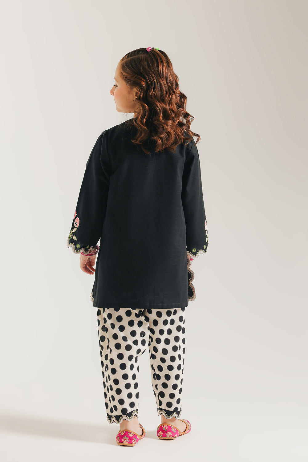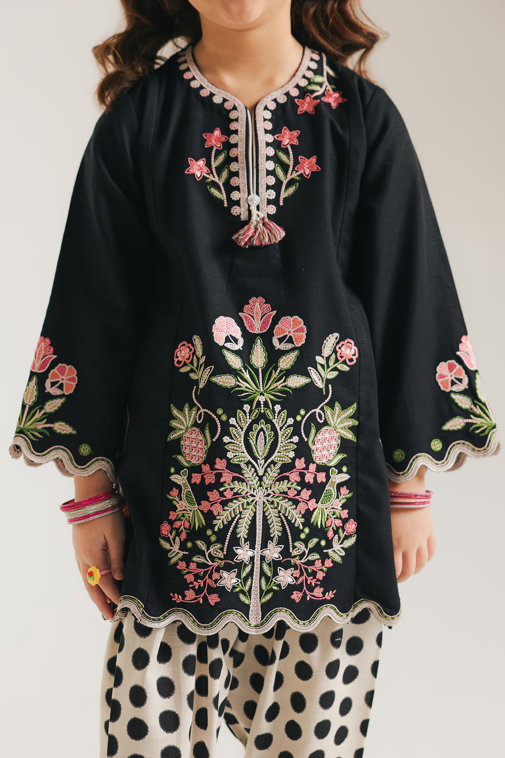 Elevate your wardrobe with this sophisticated embroidered suit featuring a striking black shirt adorned with intricate embroidery at the neckline and front panel. The garment showcases delicate scalloped detailing along the hem and sleeves, adding refined texture and movement. Paired with a coordinating polka dot shalwar, this ensemble delivers a perfect balance of traditional craftsmanship and contemporary style. Ideal for formal occasions, celebrations, or when you desire an elevated everyday look that commands attention through meticulous detail work and thoughtful design.