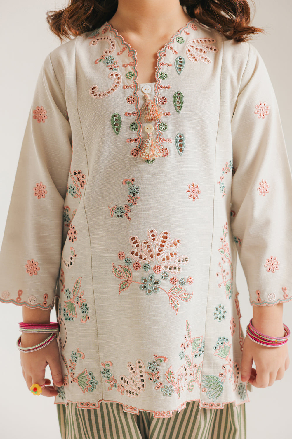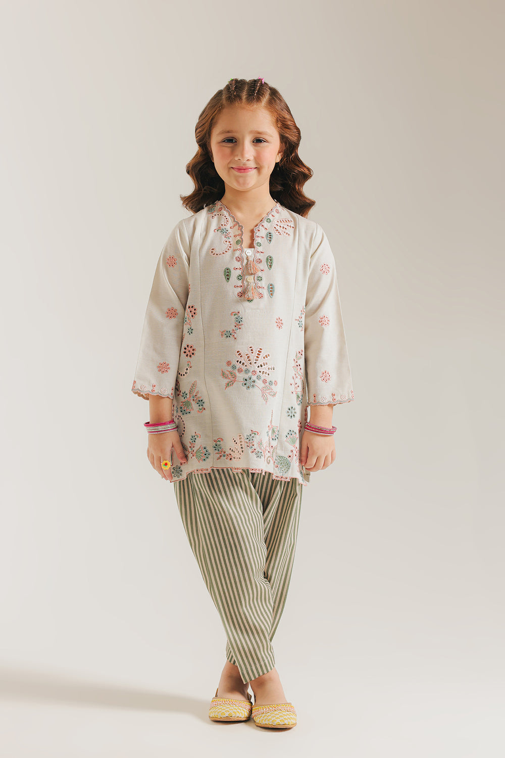 Elegant vanilla ice suit designed for kids, featuring intricate embroidery work paired with a flattering V-neckline. The ensemble features a sophisticated printed diagonal line pattern across the shalwar, adding visual interest and a contemporary appeal. Crafted with meticulous attention to detail, this piece seamlessly combines traditional embroidered elements with modern design sensibilities, making it an ideal choice for special occasions, celebrations, or everyday wear. The thoughtful color palette and refined embellishments ensure your child looks polished and stylish while maintaining comfort and ease of movement.