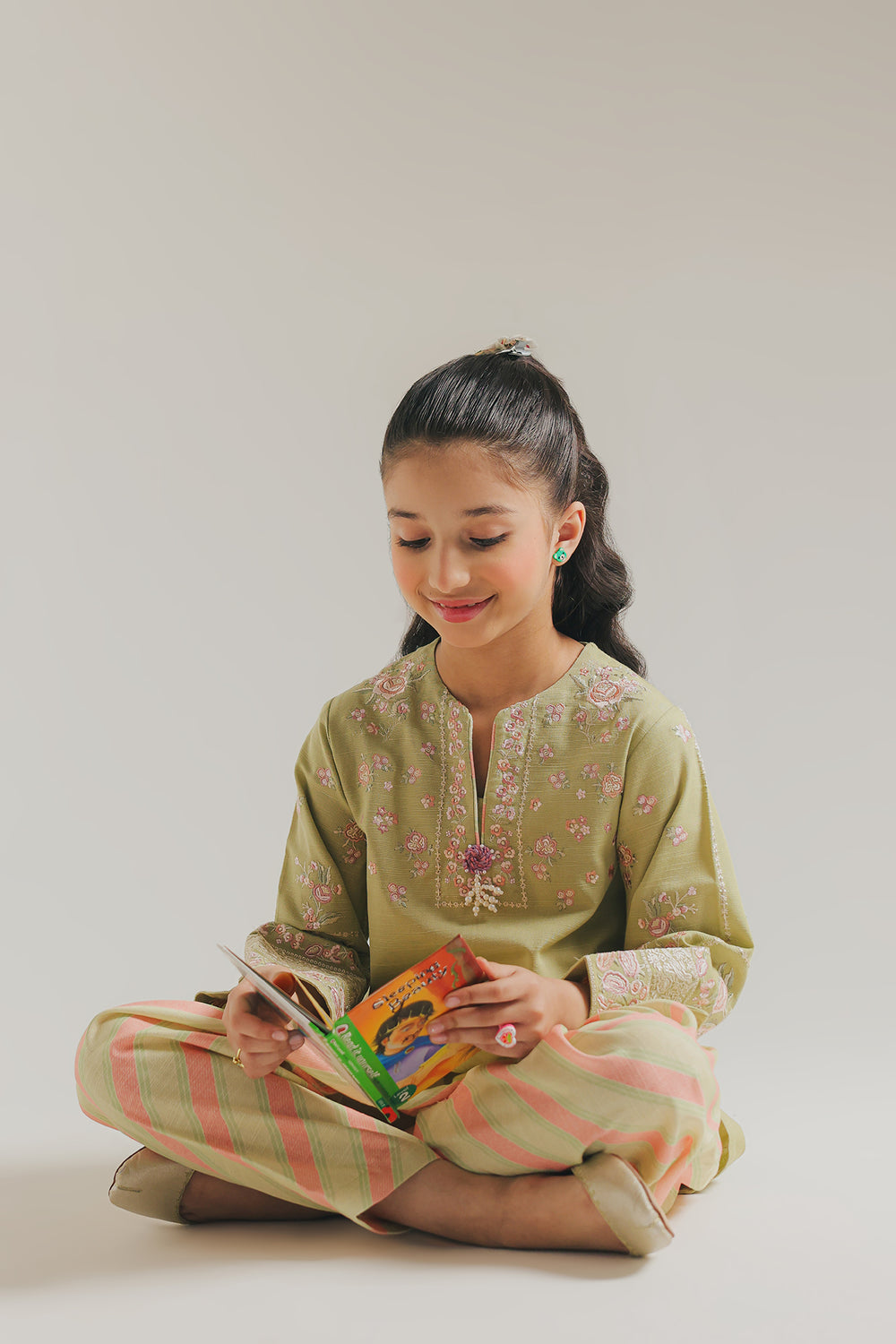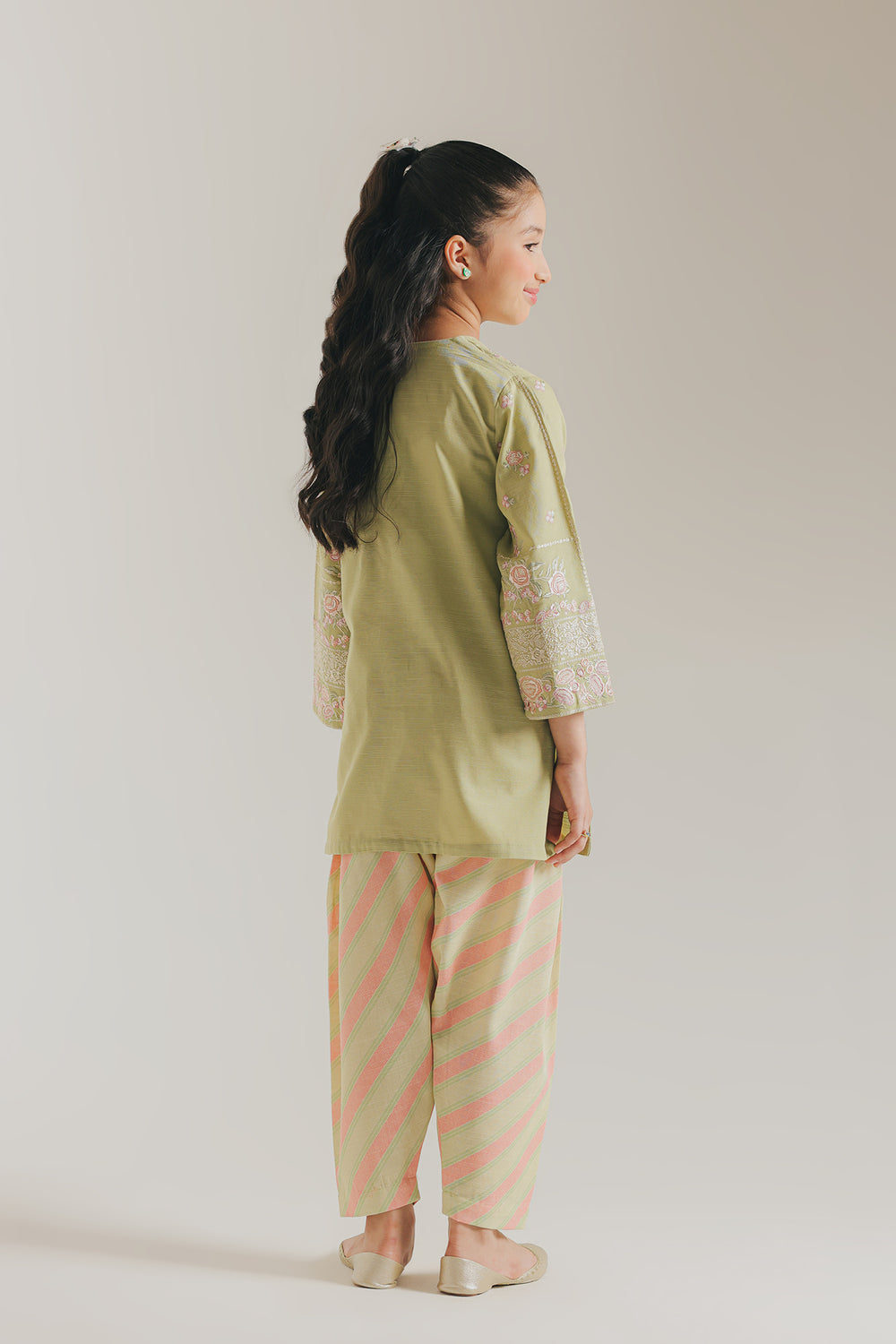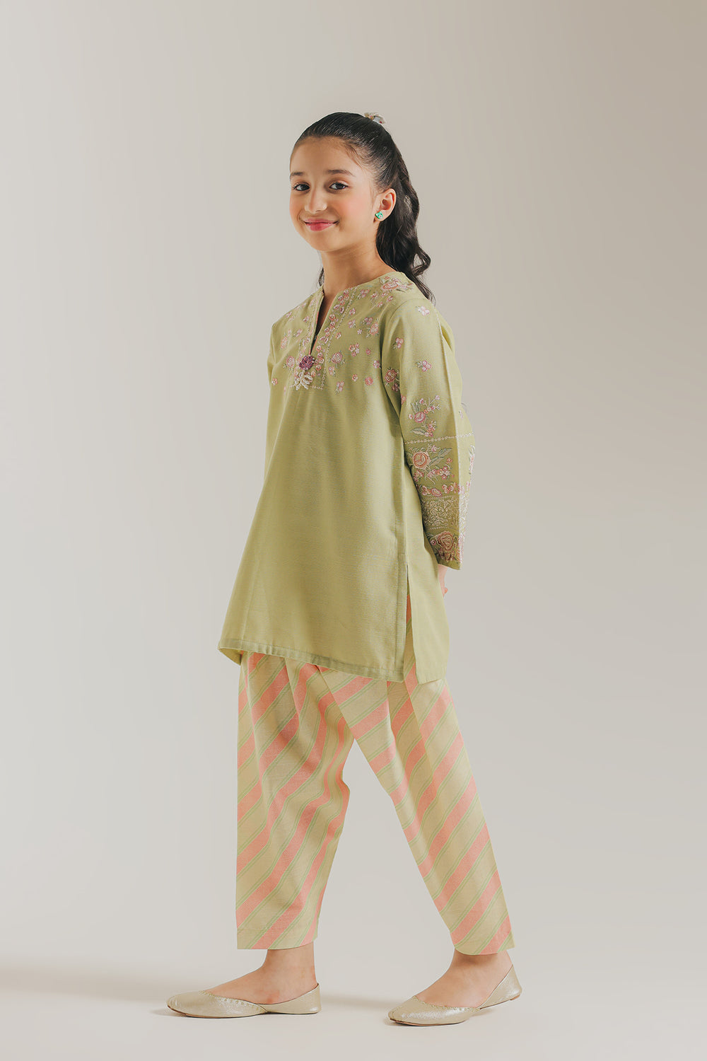 Apple green kids shalwar kameez featuring a sophisticated design with diagonal line detailing throughout. The kameez showcases intricate embroidery adorning the sleeves and neckline, adding traditional elegance to this classic silhouette. Crafted for comfort and style, this ensemble is perfect for special occasions or everyday wear.