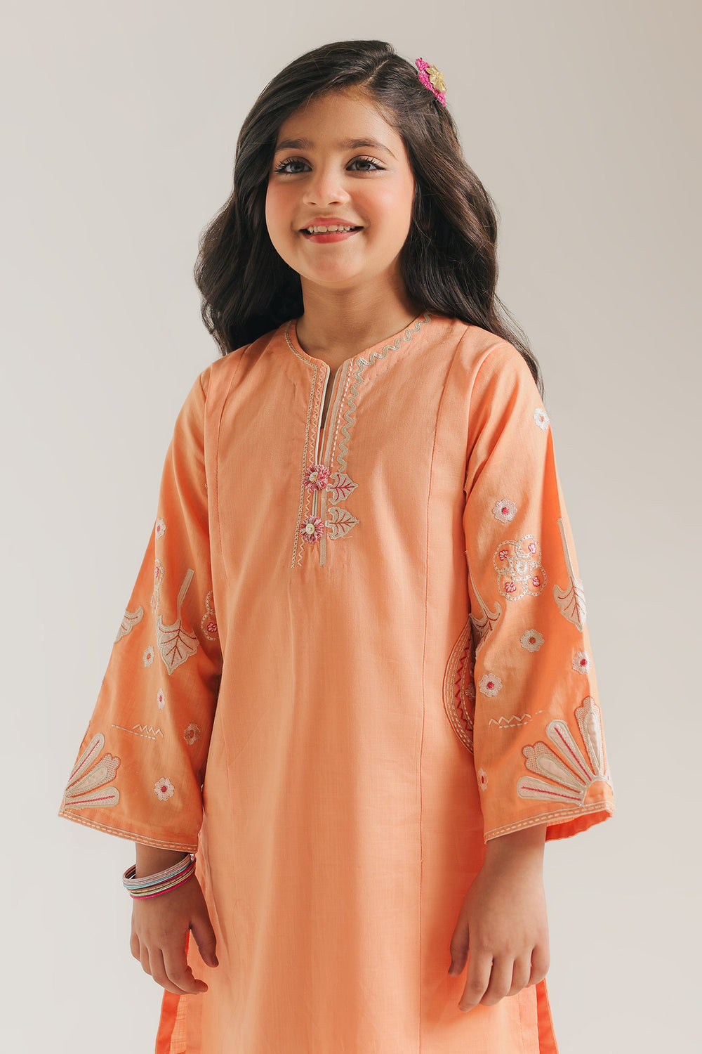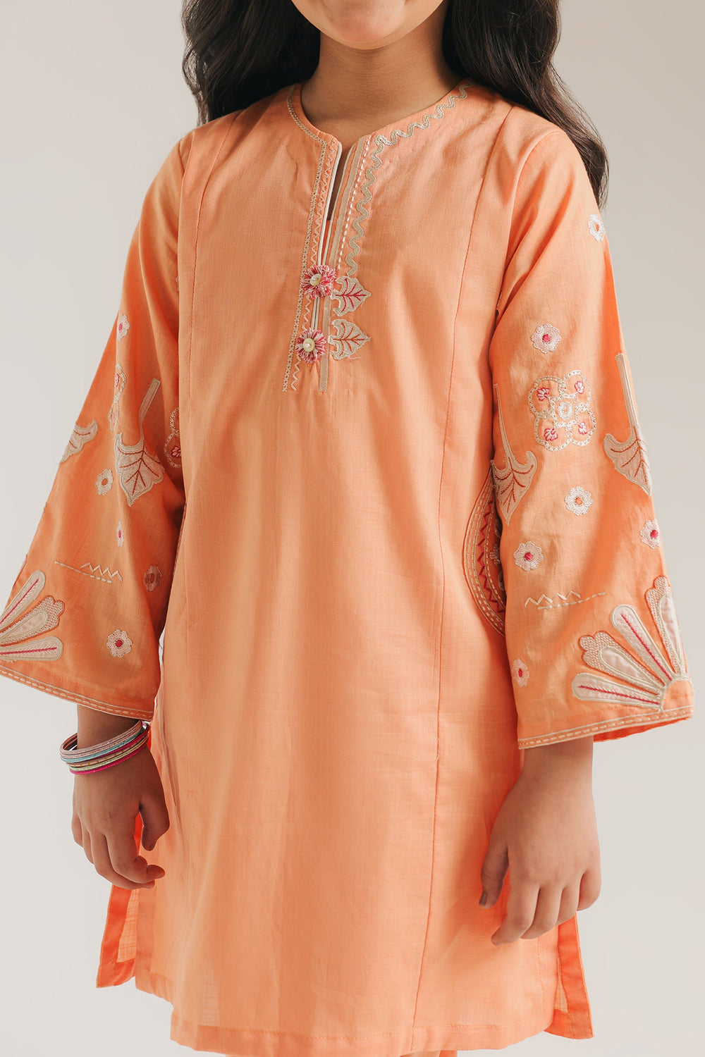 Brighten up her wardrobe with this charming pale orange two-piece set, designed for both style and play. The shirt features a clean, simple silhouette elevated by whimsical white and pastel embroidery on the flared sleeves and a sweet floral button detail at the neckline. It is paired with matching straight-cut trousers that boast unique, scalloped laser-cut hemlines for a modern, artistic touch. Lightweight and airy, this ensemble is the perfect choice for family celebrations where she wants to look her best while staying completely comfortable.