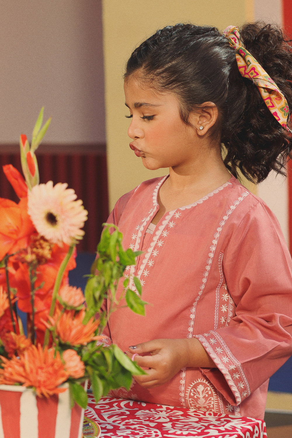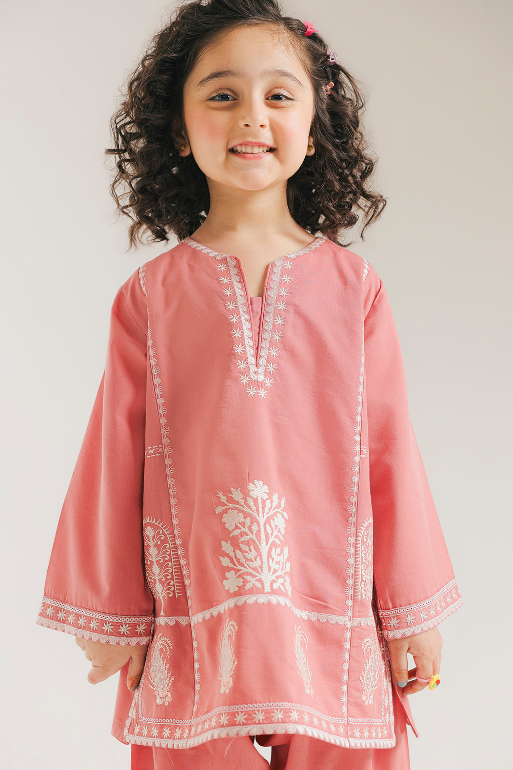 Bring a touch of soft radiance to your little one's wardrobe with this two-piece pink embroidered suit. The tunic features a delicate V-neckline and is adorned with intricate white threadwork, including a central floral motif and traditional paisley patterns. Finished with matching solid shalwar and beautifully detailed borders on the sleeves and hem, this ensemble offers a perfect blend of sweetness and festive charm.