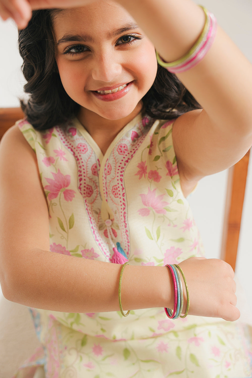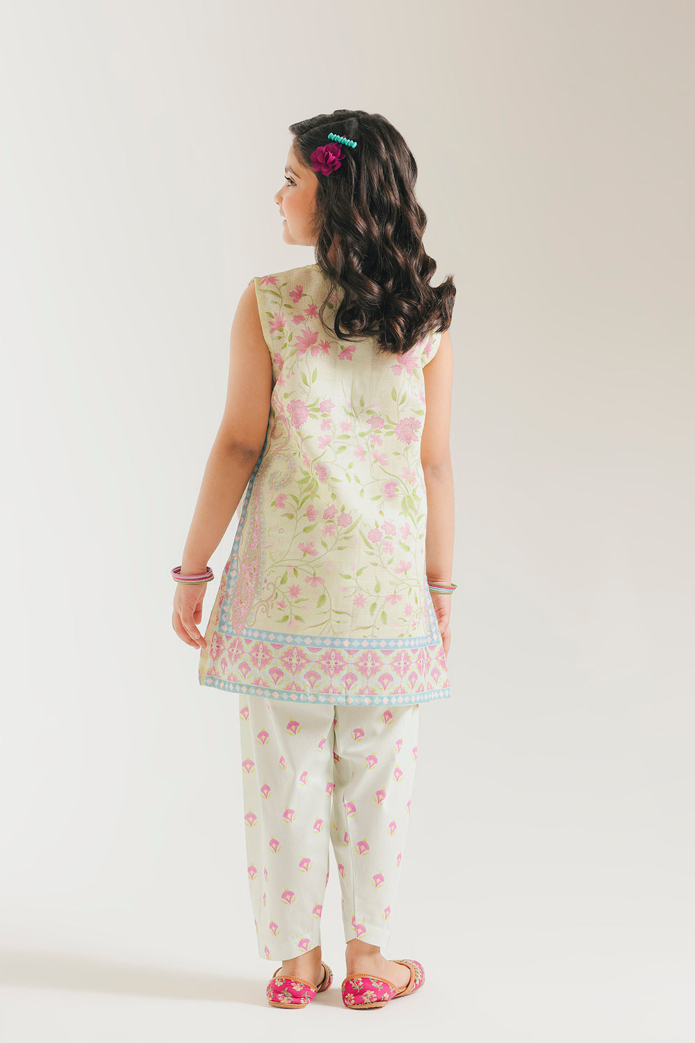 A refreshing blend of soft pastels and traditional craftsmanship, this pale yellow girls' two-piece suit is a radiant choice for sunny festivities. The sleeveless shirt is tailored from premium fabric in a delicate lemon-custard hue, featuring an intricate V-split neckline adorned with fine lavender and pink embroidery. The design is further enhanced by subtle floral motifs across the bodice and a decorative border along the straight hemline, finished with a playful pink tassel. Paired with coordinating straight-cut shalwar that feature matching floral embroidery at the ankles, this ensemble offers a breezy, polished look that ensures she stays comfortable and stylish throughout the day.