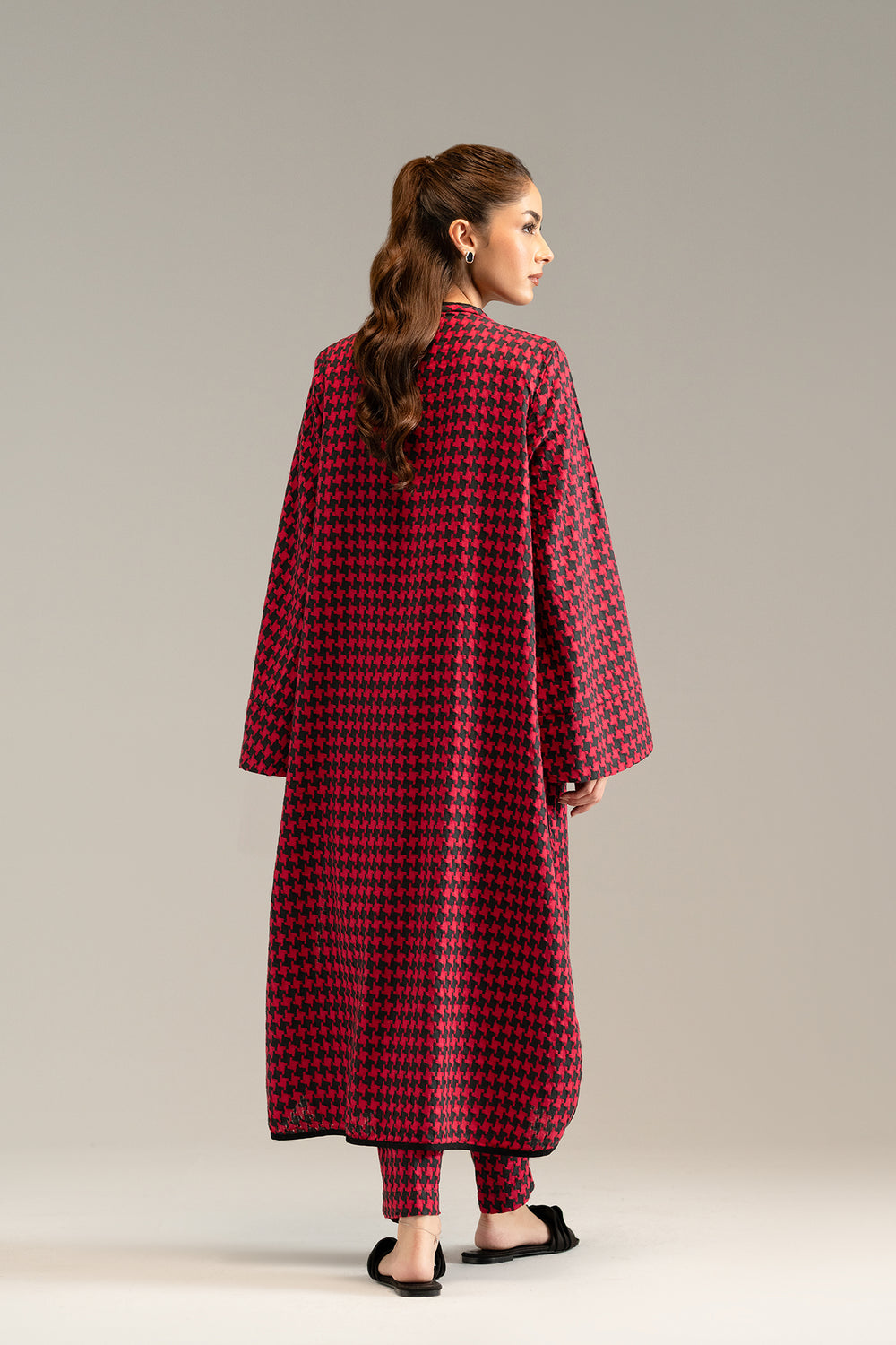 This gorgeous outfit offers fascinating elegance on a textured canvas. It features a 2 piece design with artistic hounds tooth pattern portrayed in hot pink and black color layered on a contemporary silhouette shirt adorned with round opening. It is paired with a trendy matching trouser, for a stylish modern look.