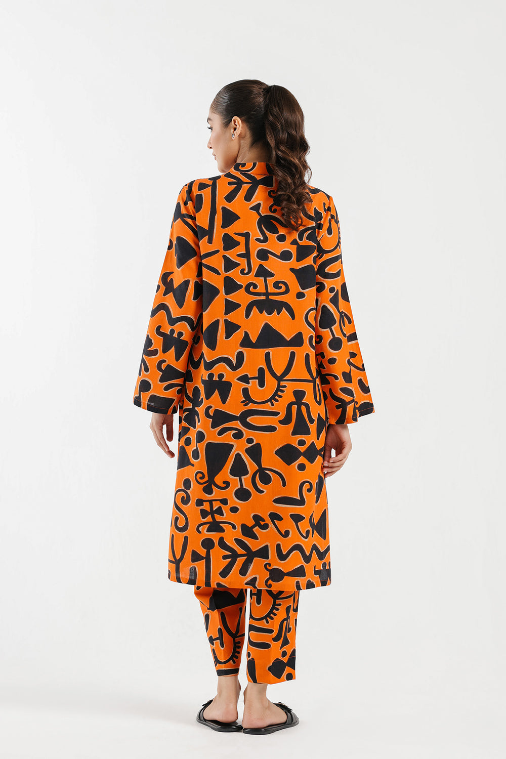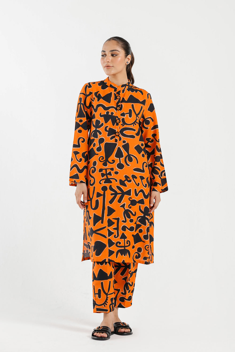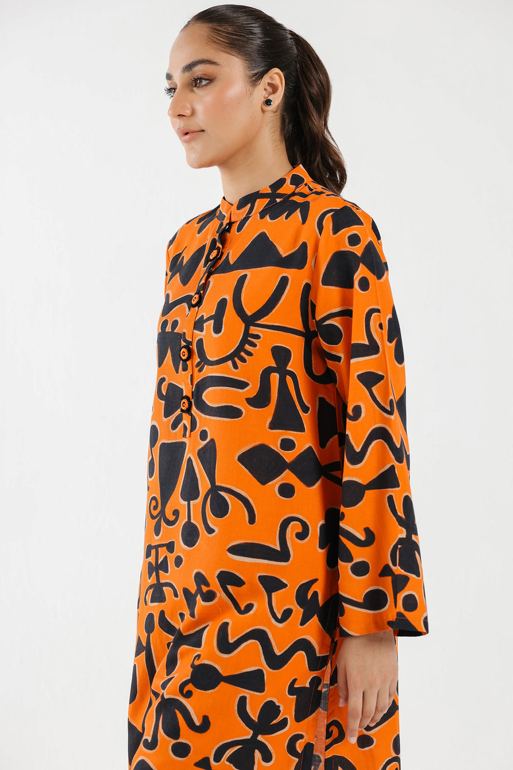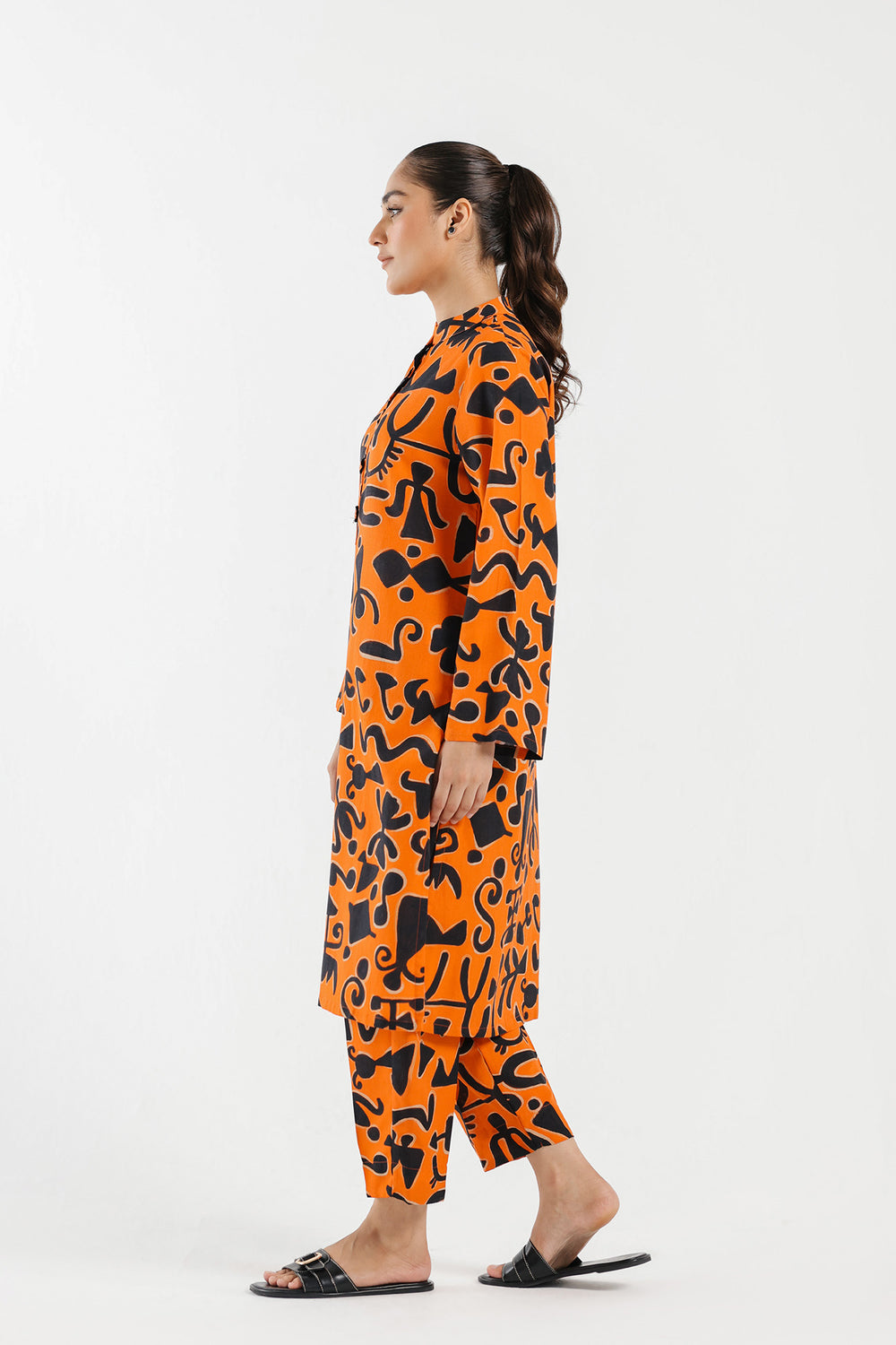This gorgeous outfit offers fascinating elegance on a gleaming orange canvas. It features a 2 piece design with abstract artistic pattern printed in deep black and ivory white shade. The contemporary shirt is accentuated by trendy add ons at front and is completed with a matching trouser, for a stylish modern look.