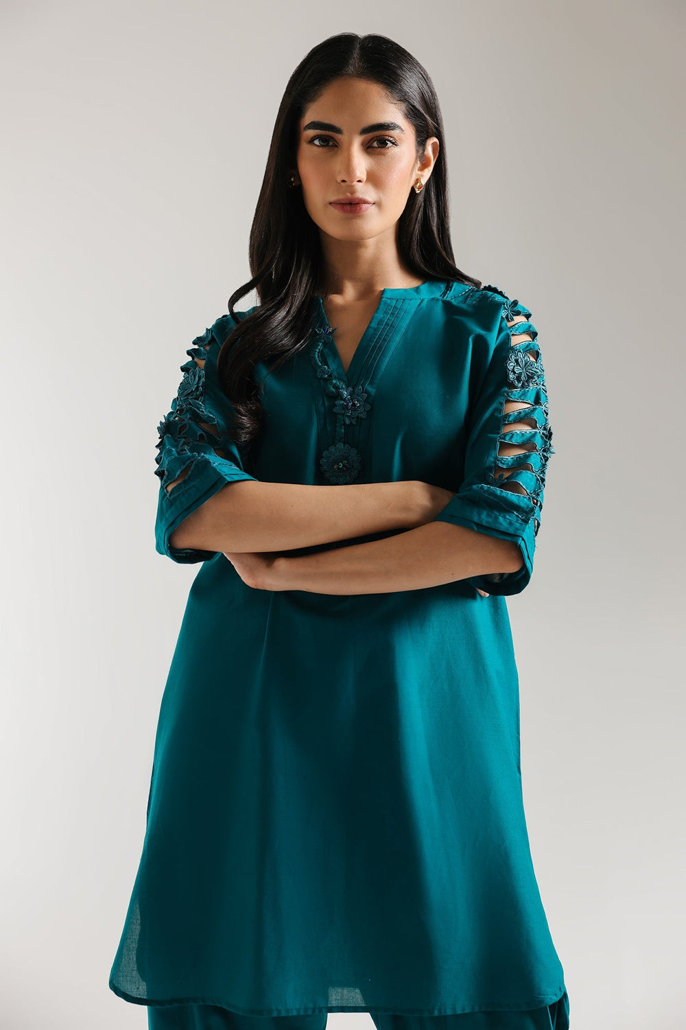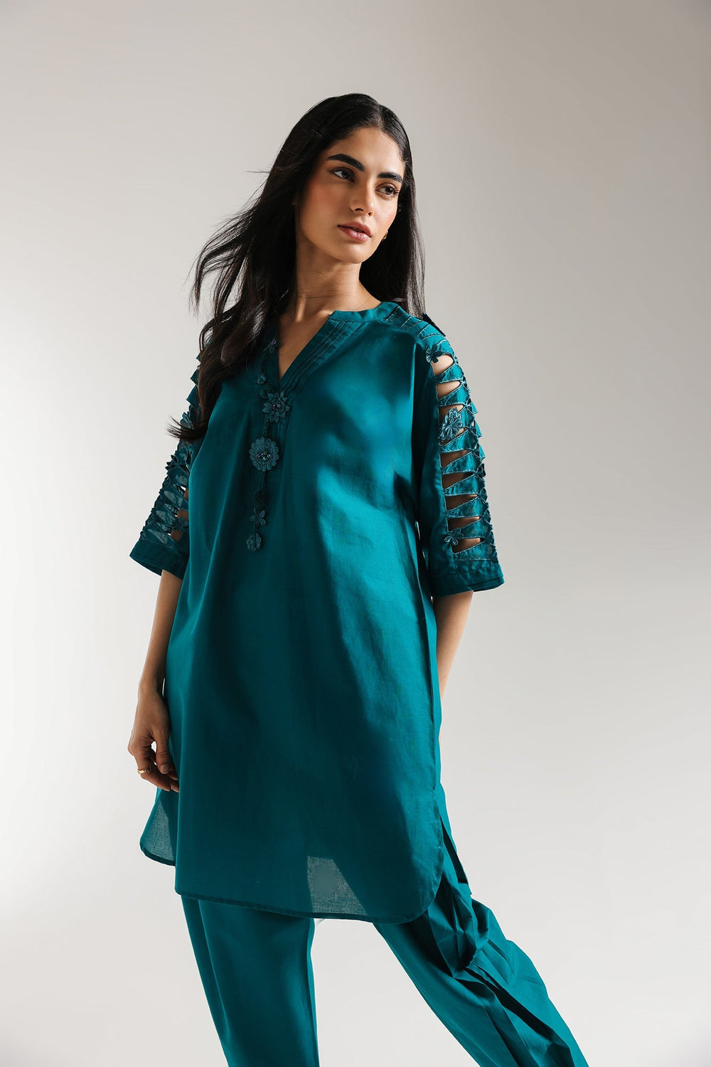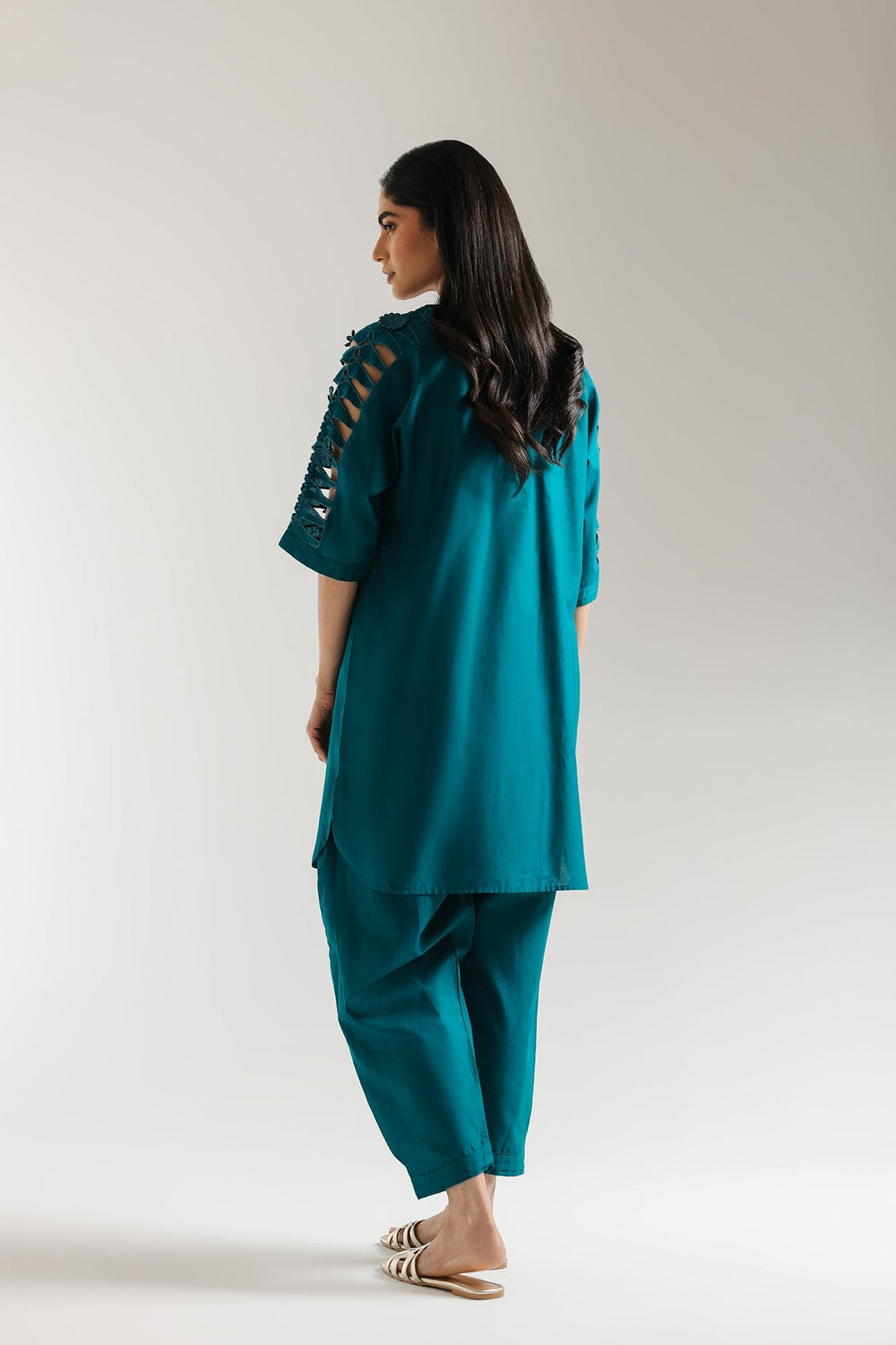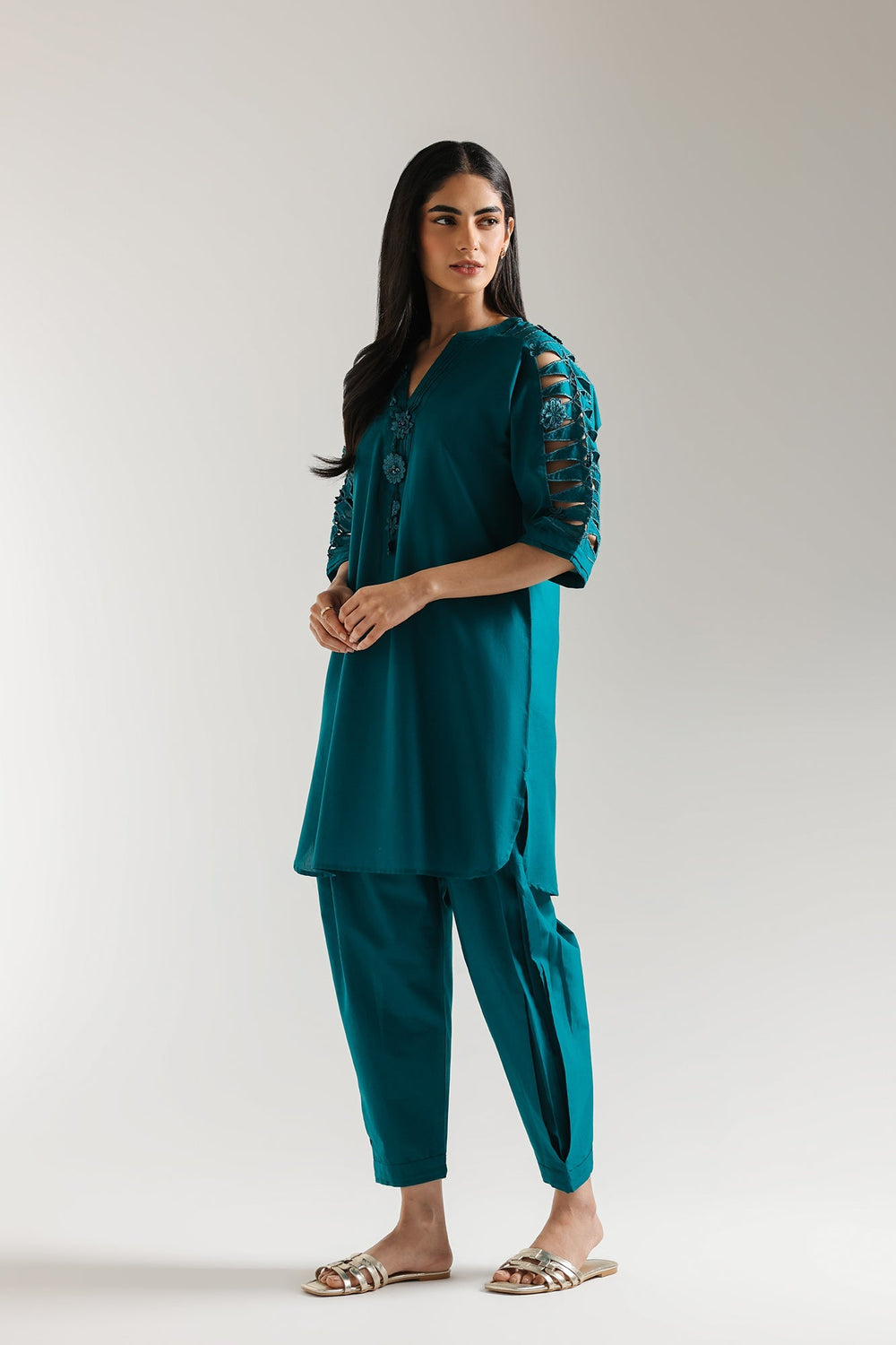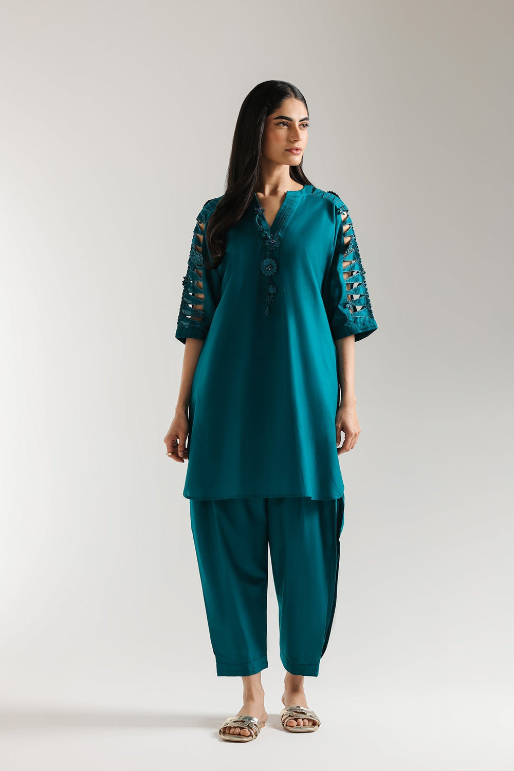 Command attention in our vibrant teal outfit, a celebration of bold color and unique detailing. The short, artfully cut sleeves showcase striking cutwork patterns, creating a modern yet timeless silhouette. Paired with a matching shalwar this outfit is a perfect choice for those who dare to stand out with effortless grace.