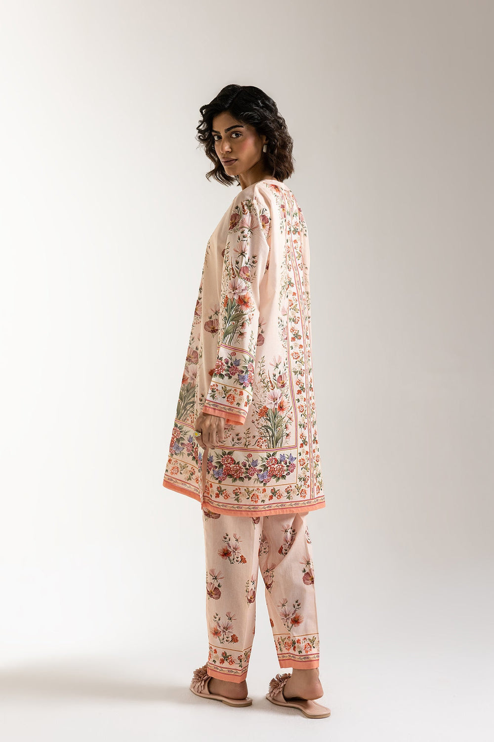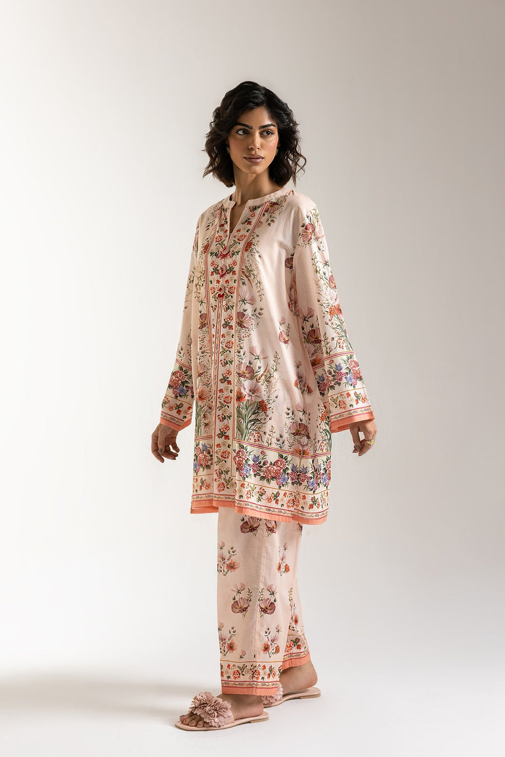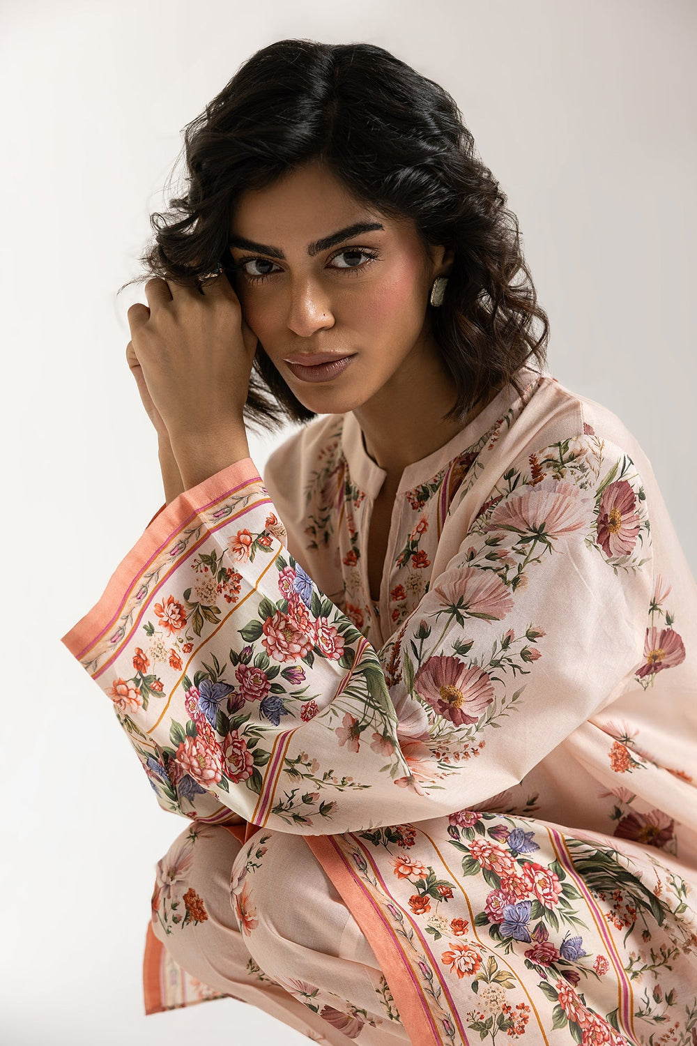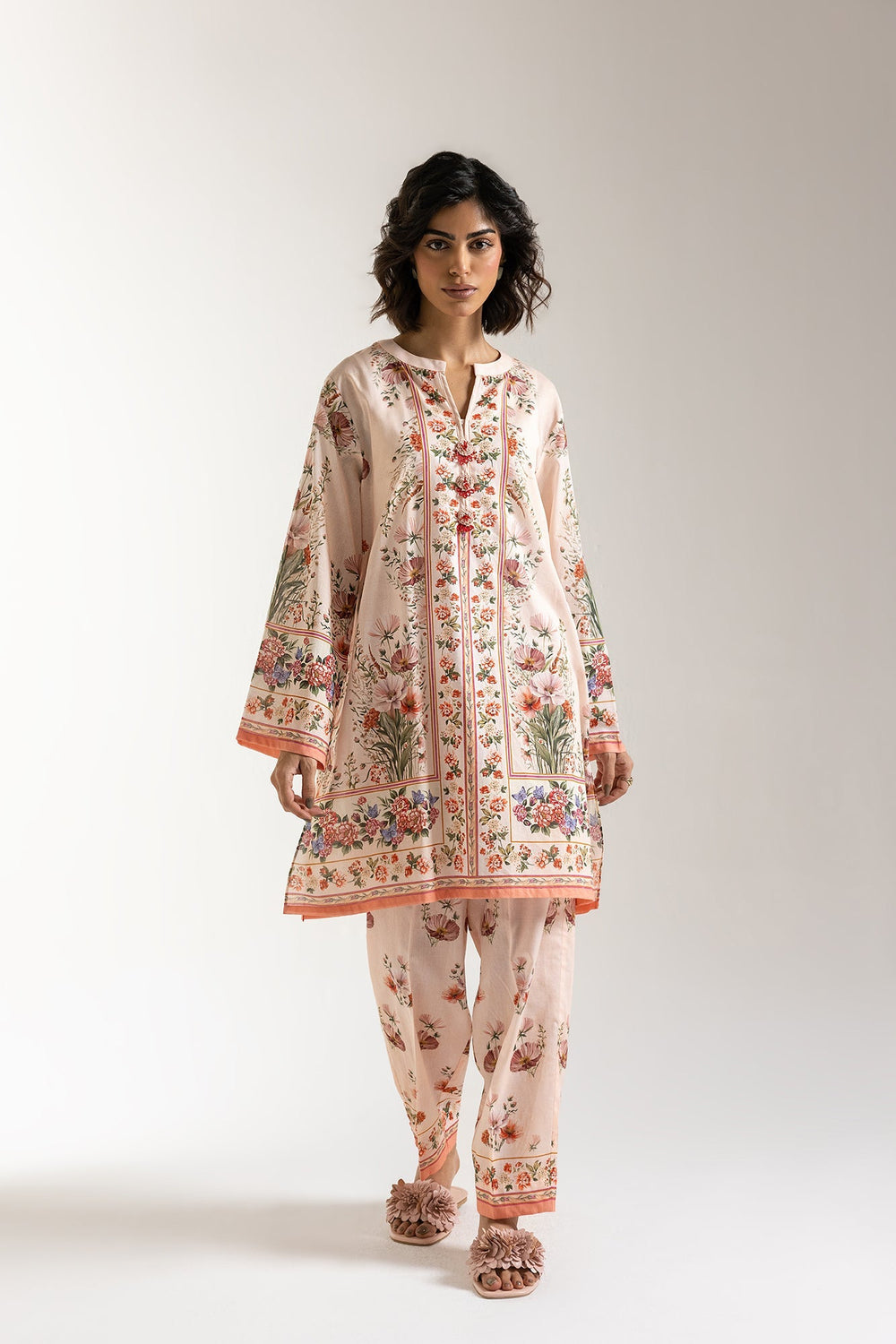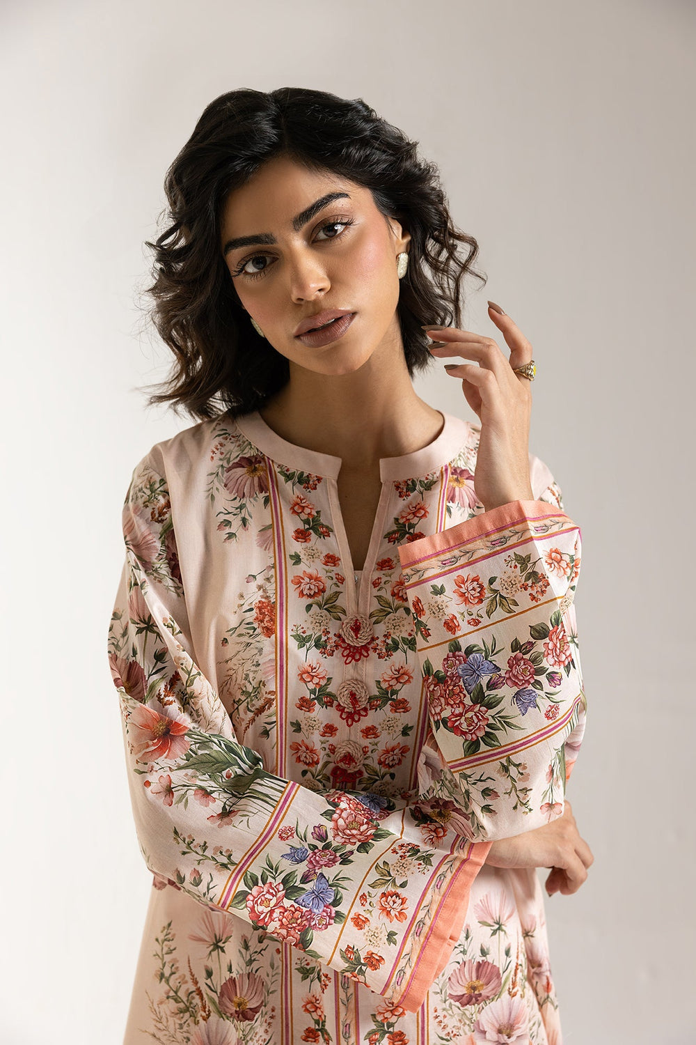 Step into a vision of delicate beauty with our petal whisper ensemble. This enchanting two-piece set is a symphony of soft peach and blush tones, adorned with an exquisite, finely detailed floral print. The kurta, with its gracefully flowing silhouette, showcases intricate botanical motifs and subtle border accents in harmonious shades of green, red, and rose. Complemented by perfectly matching printed shalwar, this outfit exudes a timeless charm and gentle sophistication. Ideal for sun-drenched garden parties, elegant daytime events, or simply embracing graceful comfort, this ensemble invites you to radiate an understated yet captivating allure.