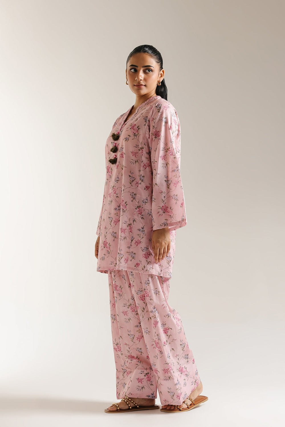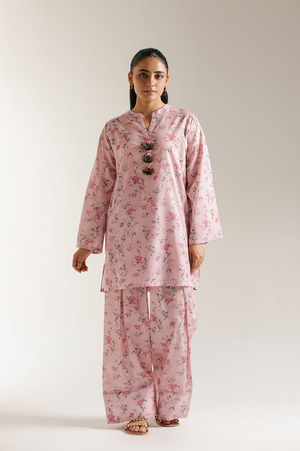 Step into a realm of feminine charm with this delightful two-piece outfit, a harmonious blend of delicate beauty and effortless comfort. Adorned with a sweet, all-over floral print in varying shades of pink and subtle hints of blue, set against a soft blush background, this ensemble captures the essence of a blossoming garden. The gracefully tailored shirt features a flattering neckline, accented with charming decorative tassels. Complementing the shirt is a perfectly matching shalwar, which carry the same enchanting floral print, creating a cohesive and visually appealing outfit.