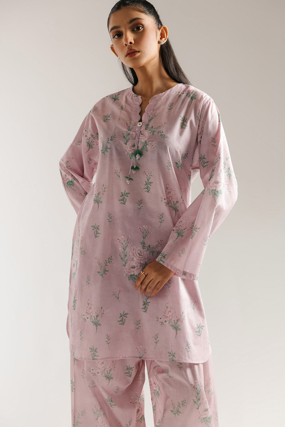 Drift into dreamy elegance with this beautiful light pink ensemble, adorned with a delicate all-over print of subtle green florals. The serene kurta features a refined round collar with a charming button detail, while the matching printed shalwar complete this exquisitely soft and feminine look. It’s an ideal choice for a relaxed yet polished appearance.