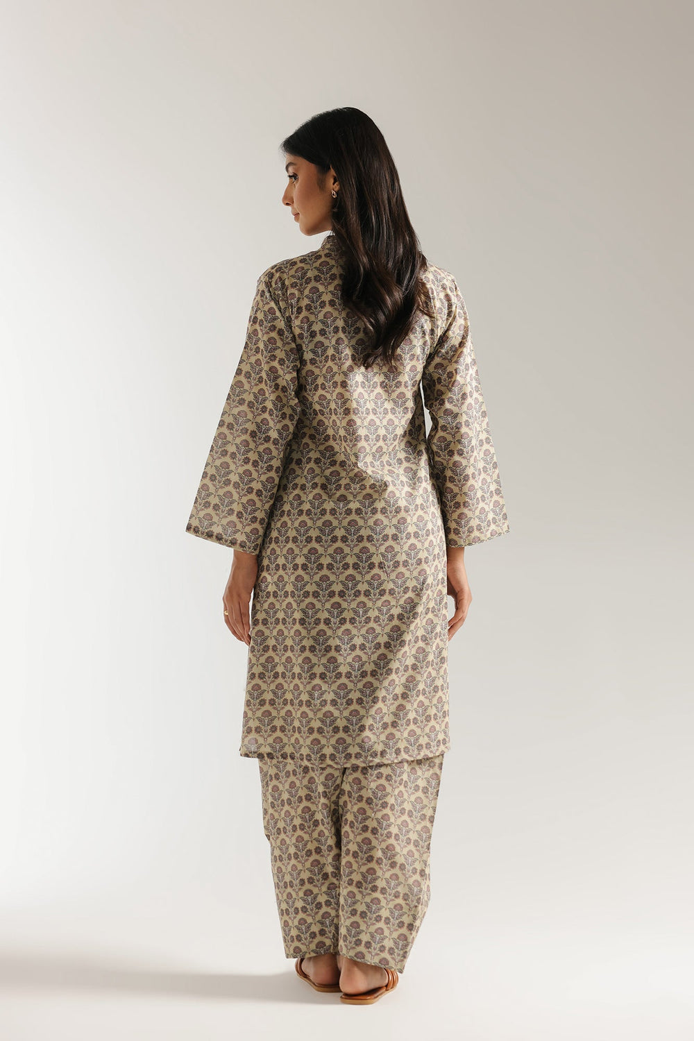 Discover unique allure in this distinctive beige outfit, adorned with an intricate all-over print of rich, deep floral motifs. The kurta showcases a stylish V-neck accented with vibrant green beaded tassels, adding an unexpected touch of charm. Complemented by matching printed shalwar, this ensemble exudes an earthy sophistication, making it a perfect choice for those who appreciate refined, nature-inspired style.