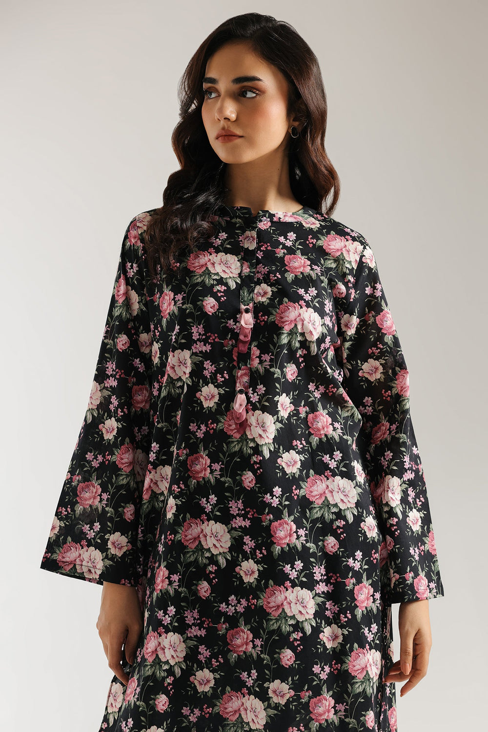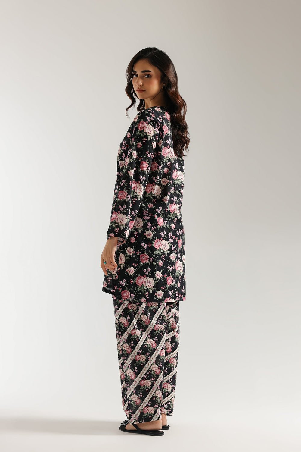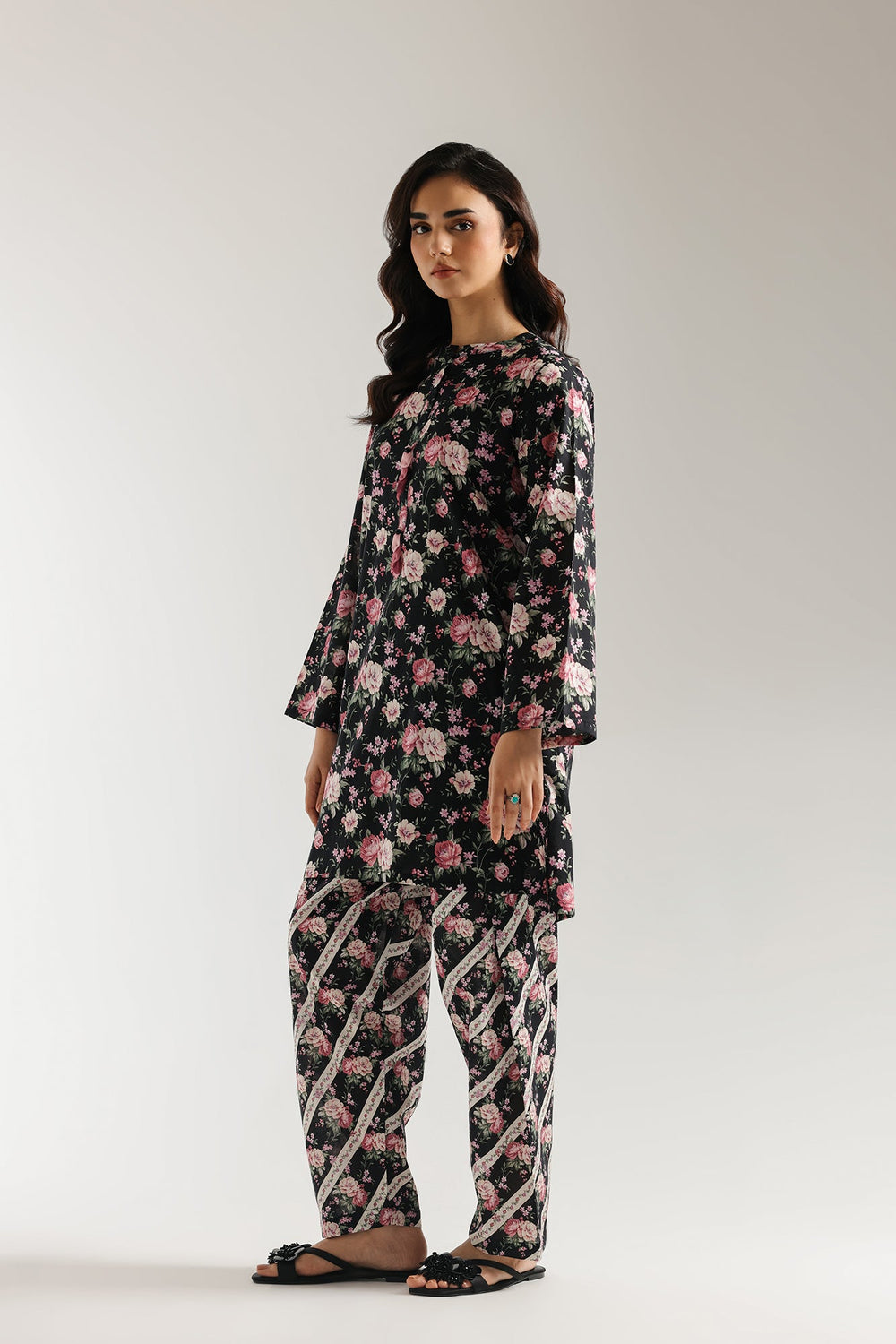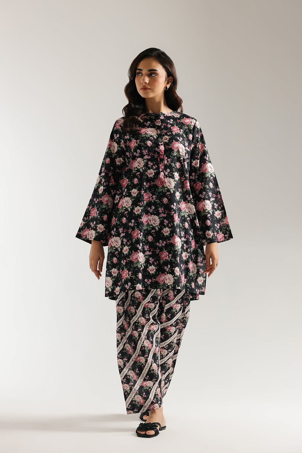 Step into a garden of elegance with this captivating black floral printed set, a timeless ensemble that blossoms with sophisticated charm. The rich black long-sleeve tunic features a classic ban neckline and is adorned with an exquisite all-over print of blooming pink roses and lush green foliage, creating a romantic and vibrant visual. Completing this harmonious set is a perfectly tailored shalwar, continuing the delicate floral motif and accented with a striking geometric stripe print, adding a modern twist. Ideal for stylish gatherings, festive occasions, or simply adding a touch of refined beauty to your everyday, this set promises both comfort and undeniable allure.