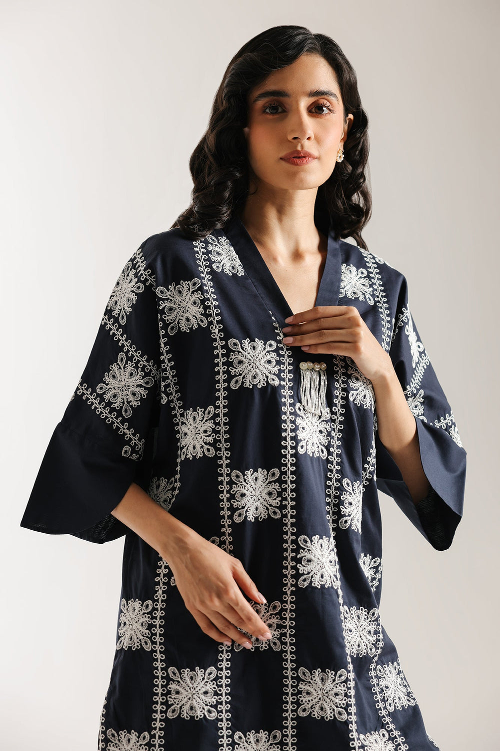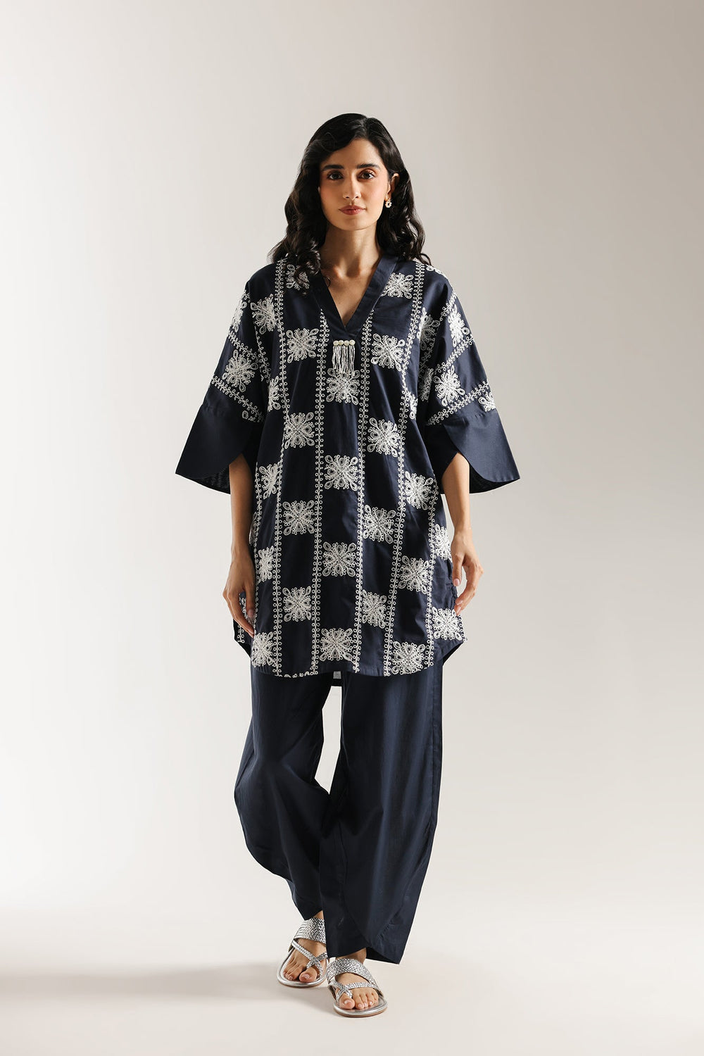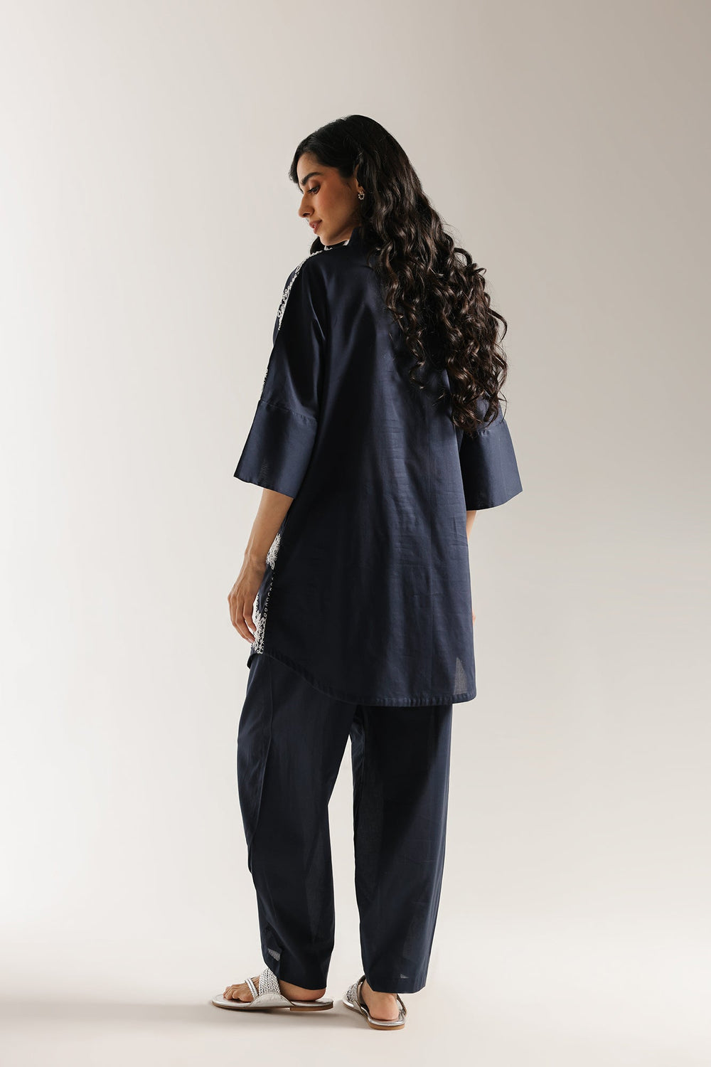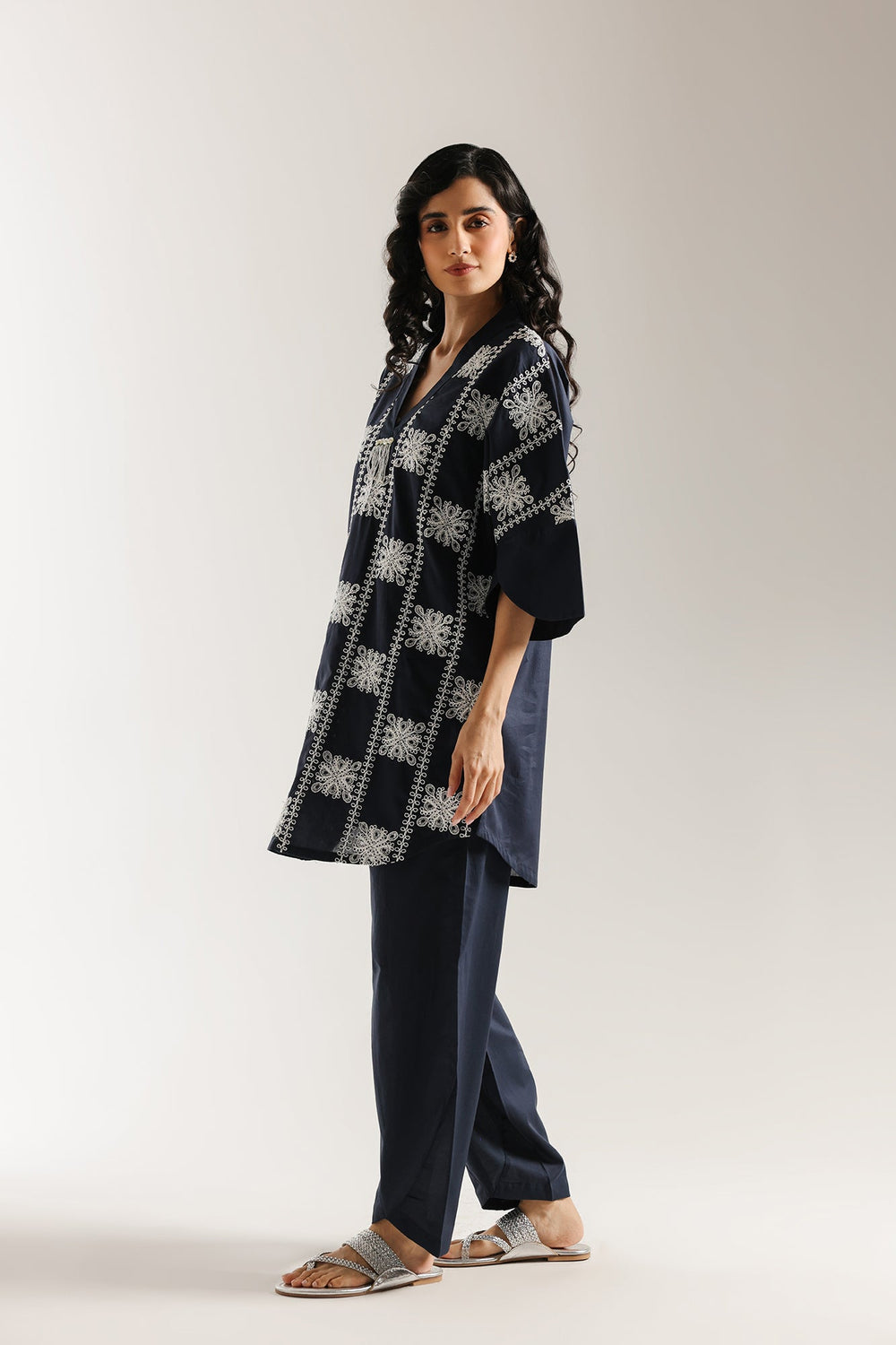 Step out in striking style with this captivating embroidered suit. This two-piece ensemble features a rich navy blue kurta, beautifully adorned with an intricate white embroidered pattern that creates a stunning visual contrast. The relaxed, flowing silhouette of the kurta, paired with coordinating navy blue shalwar, offers both comfort and elegance. This suit is a timeless choice, perfect for making a sophisticated statement.
