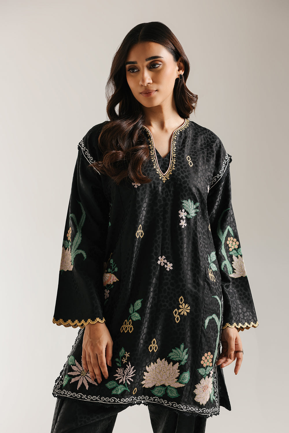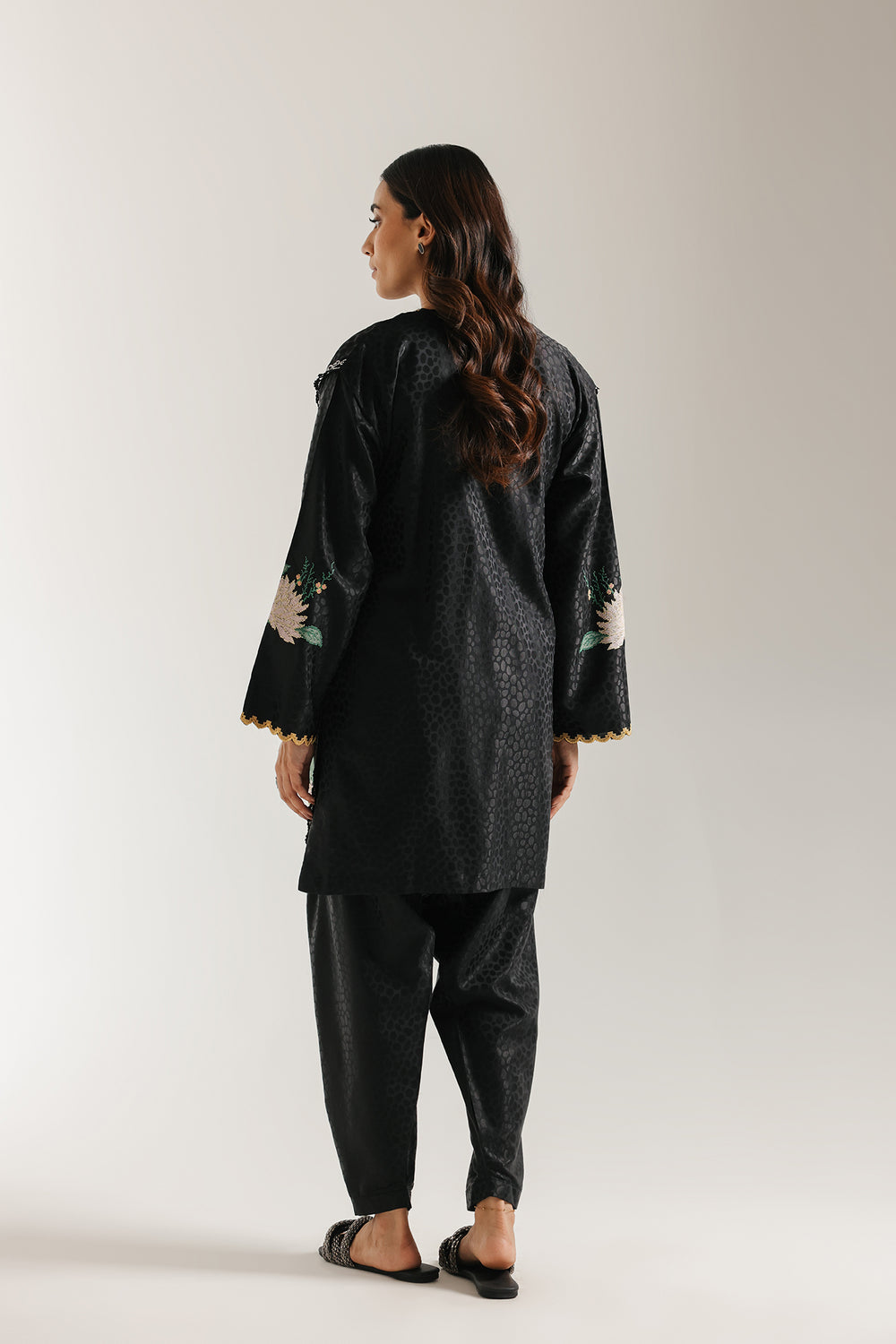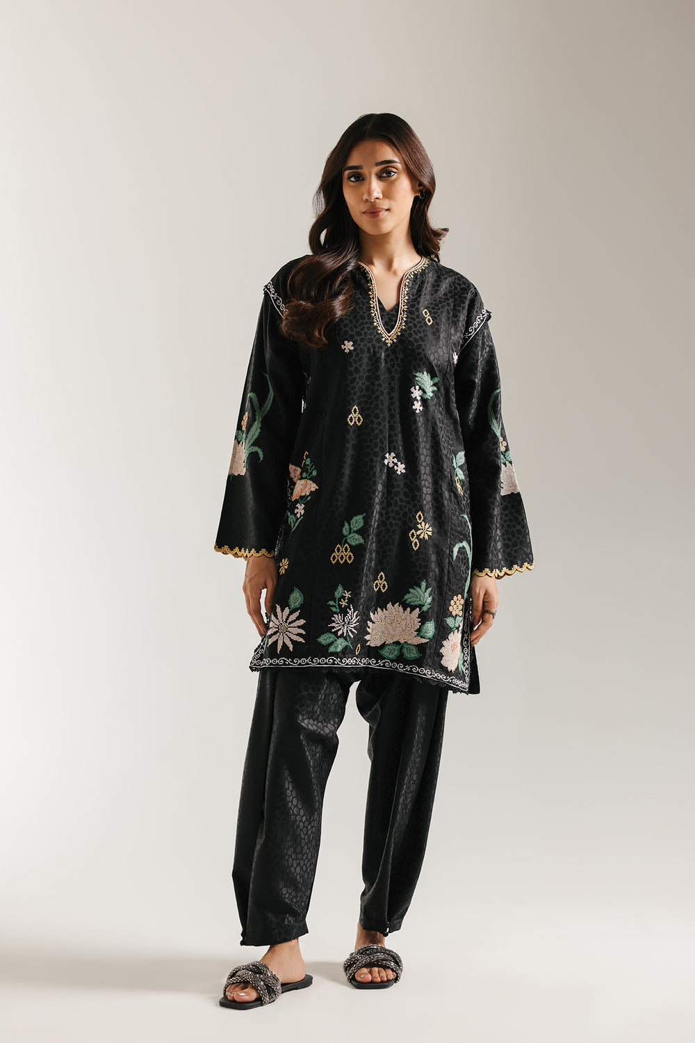 Elevate your style with this sophisticated black embroidered suit. The short, straight-cut kurta is crafted from a black jacquard fabric featuring a subtle, tonal leopard spot pattern. It is beautifully embellished with colorful floral thread embroidery in soft green, pink, and yellow hues. The round neckline has a V-slit, and the wide sleeves are finished with delicate scalloped border. The ensemble is completed by coordinating black shalwar trousers in the same textured jacquard fabric, creating a comfortable yet refined traditional look.