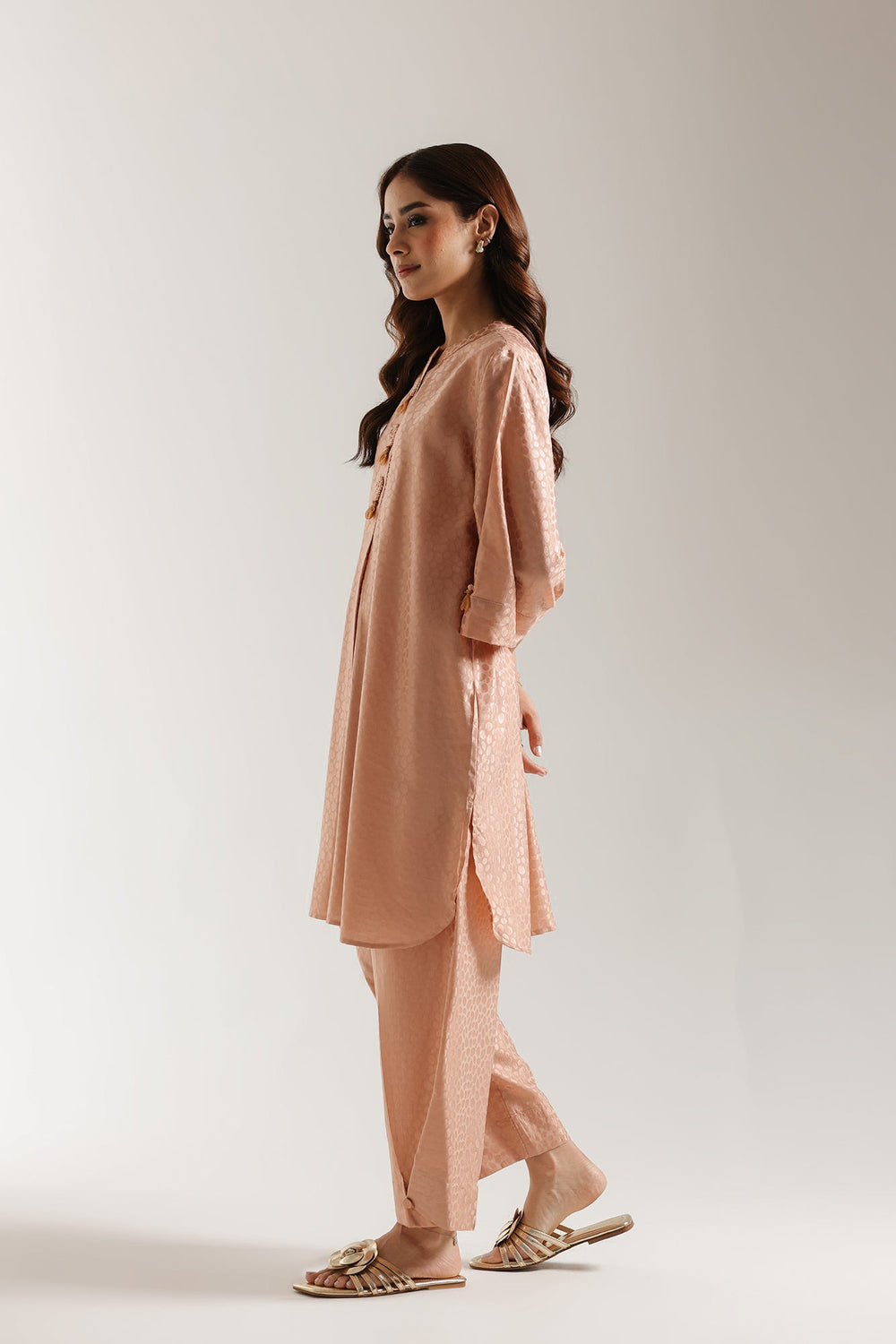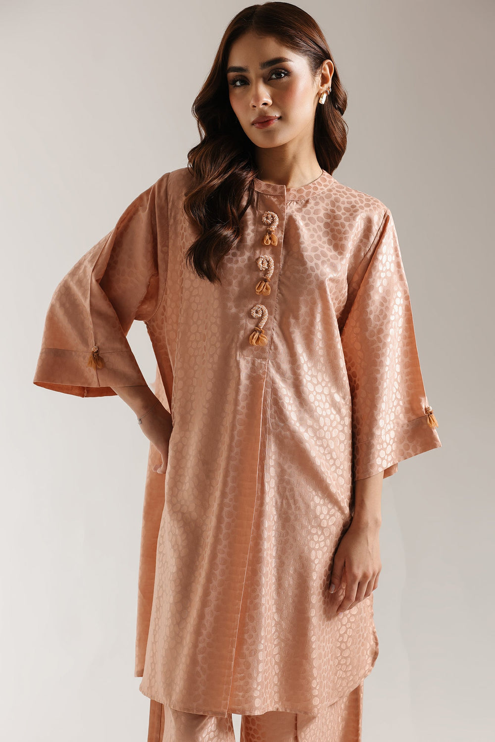 Elevate your everyday elegance with this sophisticated ensemble that seamlessly blends traditional craftsmanship with modern sensibility. Featuring a medium-length kurti and coordinating shalwar in embossed fabric, this ensemble showcases meticulous embellishments at the front placket and sleeves. The shirt's refined ban collar creates a flattering silhouette, while subtle peanut color creates a mesmerizing look. Paired with a slouchy-fit trousers, this statement outfit is perfect for those who appreciate understated luxury and contemporary monotone aesthetics.