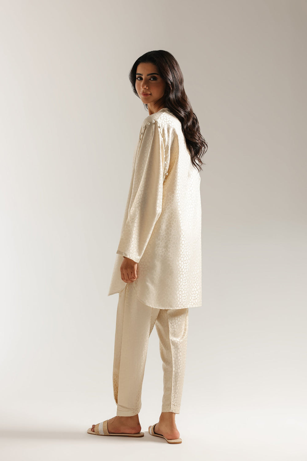 Drift into an aura of refined elegance with this exquisite self jacquard suit. Crafted from a luxurious, luminous fabric in a soft champagne hue, the ensemble features a subtle jacquard pattern for a touch of texture. A deep V-neckline is accented with a line of matching accents, while the wide, graceful sleeves are adorned with tiny bead and tassel embellishments on the shoulders. This suit is the epitome of understated luxury, perfect for making a stylish statement at any special event. Paired with matching textured shalwar to complete the look.