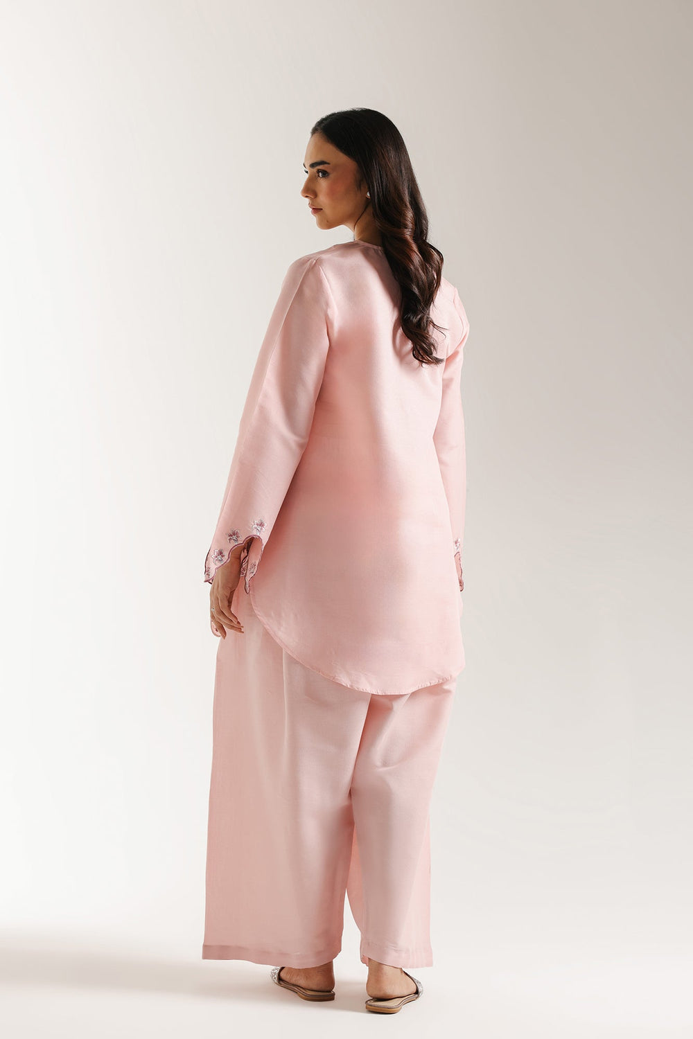 Capture delicate charm in pure blush with this beautiful embroidered suit. The ensemble features a short kurti in a soft, luminous pink fabric that have a subtle sheen. The shirt is elegantly embellished with fine embroidery around the V-neckline, across the front hem, and detailing the wide sleeves. It is perfectly paired with matching, loose fit shalwar for a comfortable yet graceful silhouette. This monochromatic look is ideal for making a subtle, sophisticated statement at any semi-formal occasion.