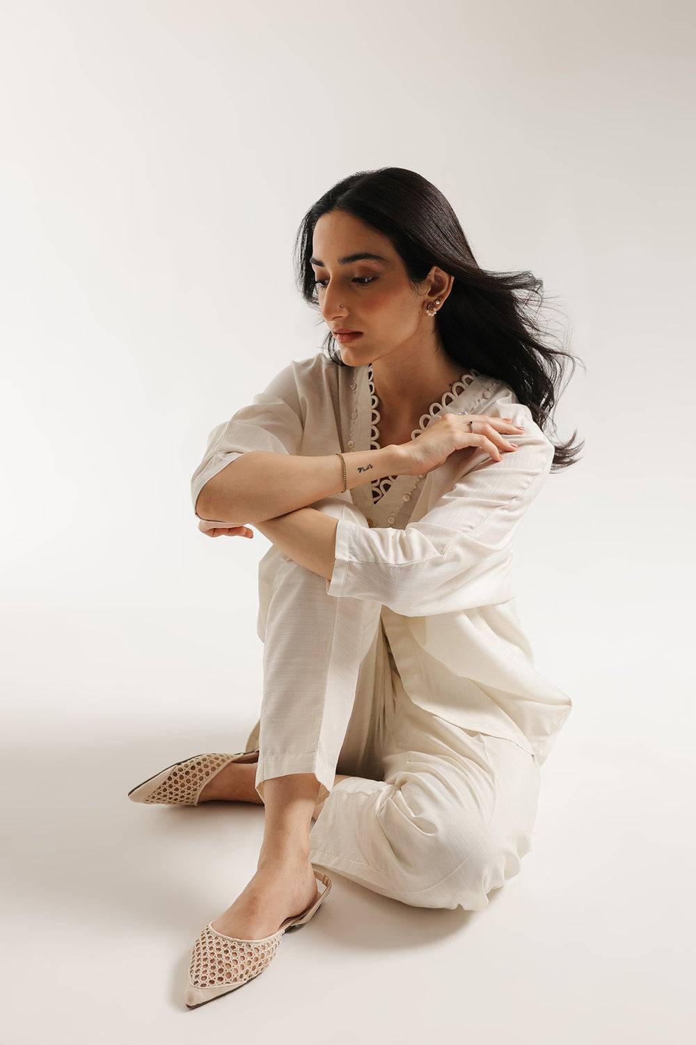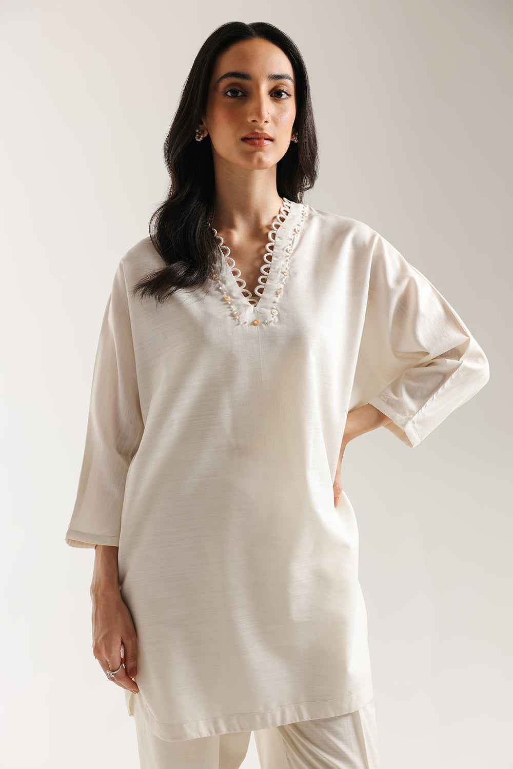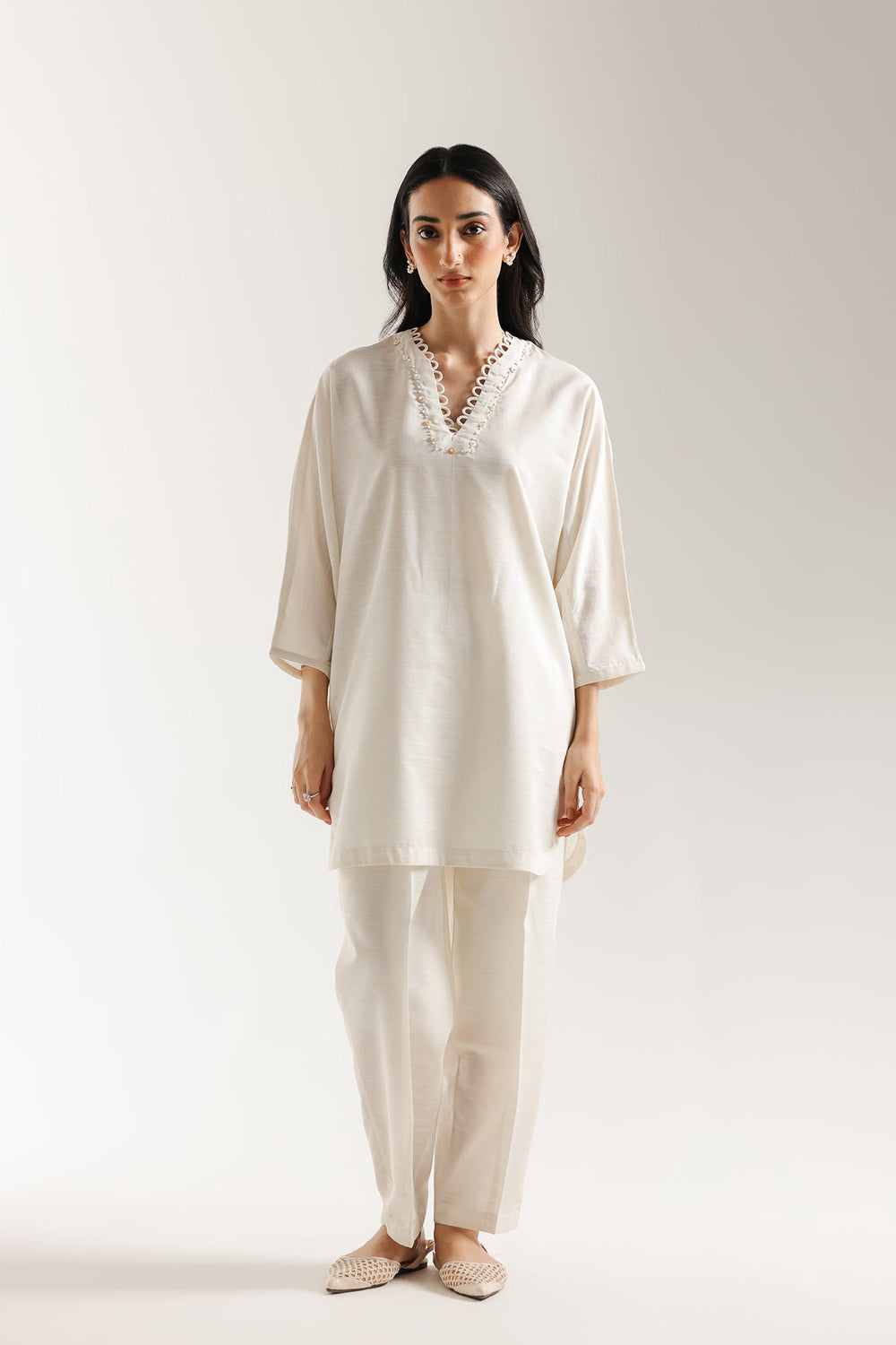 Experience effortless elegance in this serene solid suit. Crafted in a soft, off-white fabric, the ensemble features a straight, relaxed-fit kurta with a graceful V-neckline adorned with delicate, scalloped trim, adding a touch of subtle texture. The kurta has three-quarter sleeves and a streamlined silhouette. It is perfectly matched with complementary straight-cut trousers in the same calming hue, creating a refined and versatile look that embodies understated sophistication.