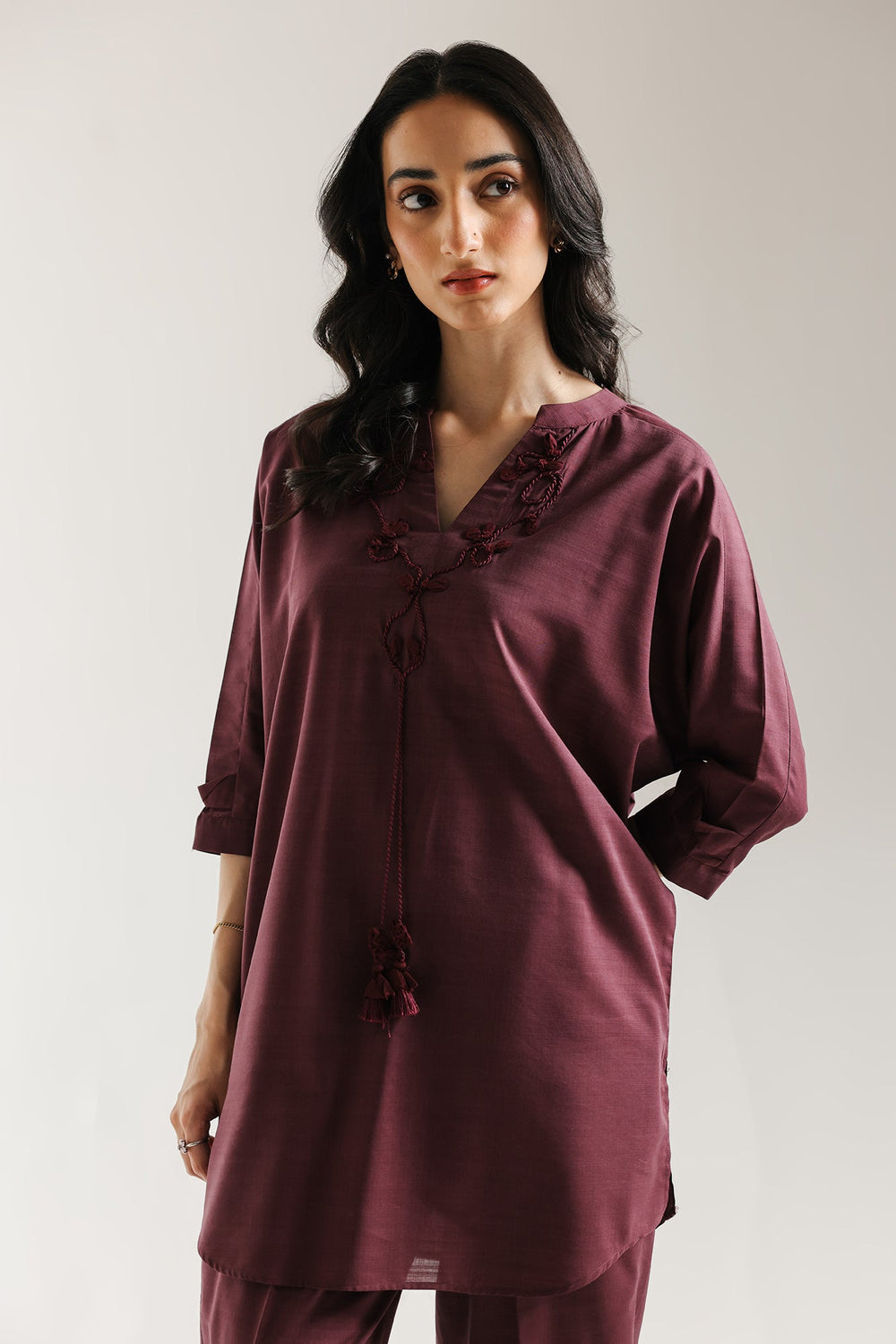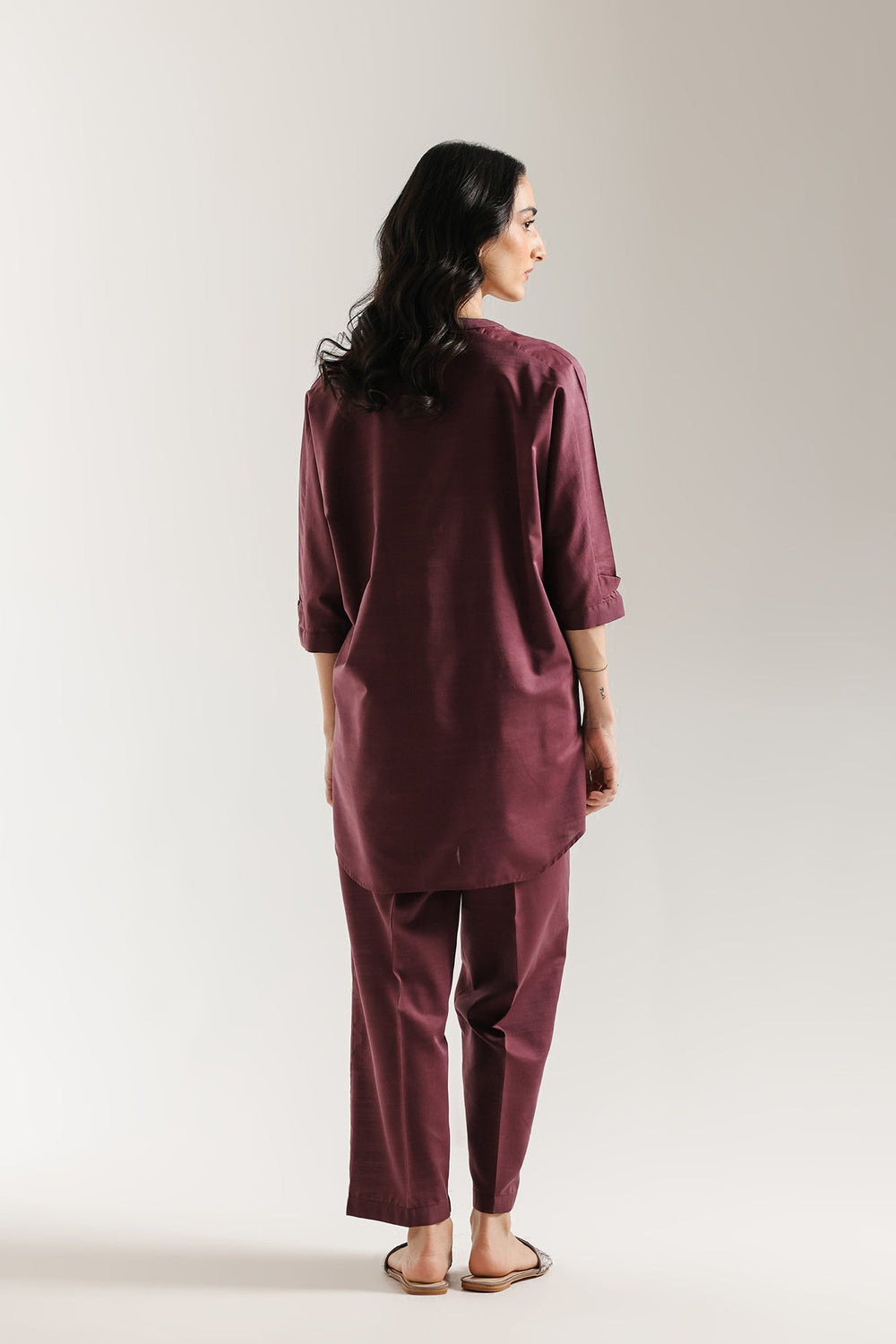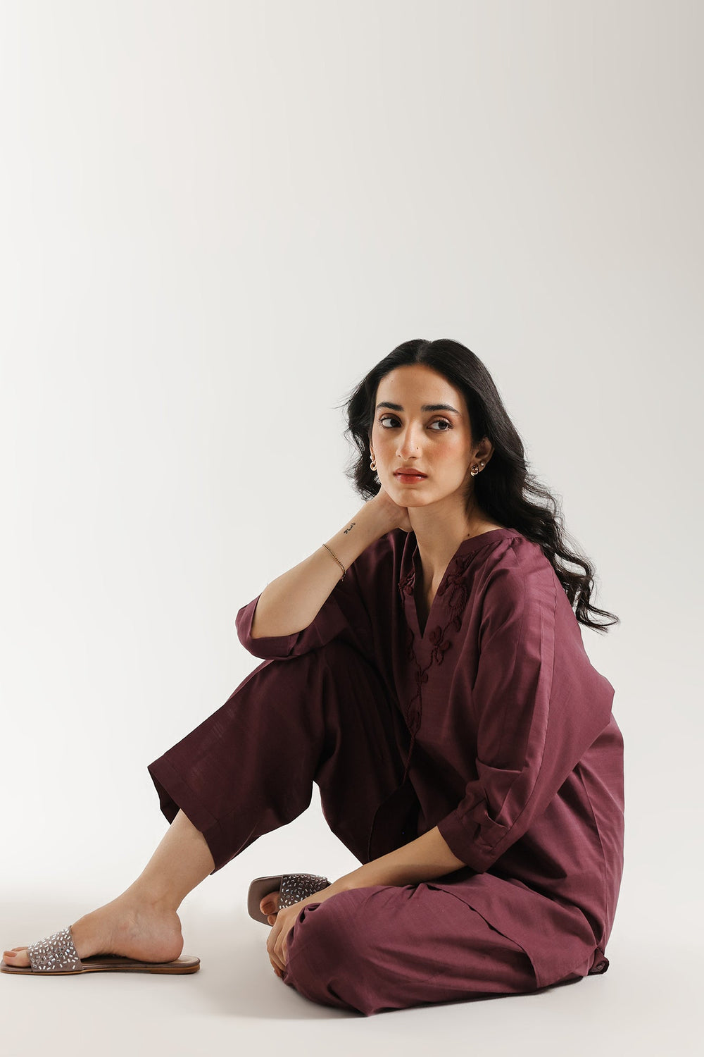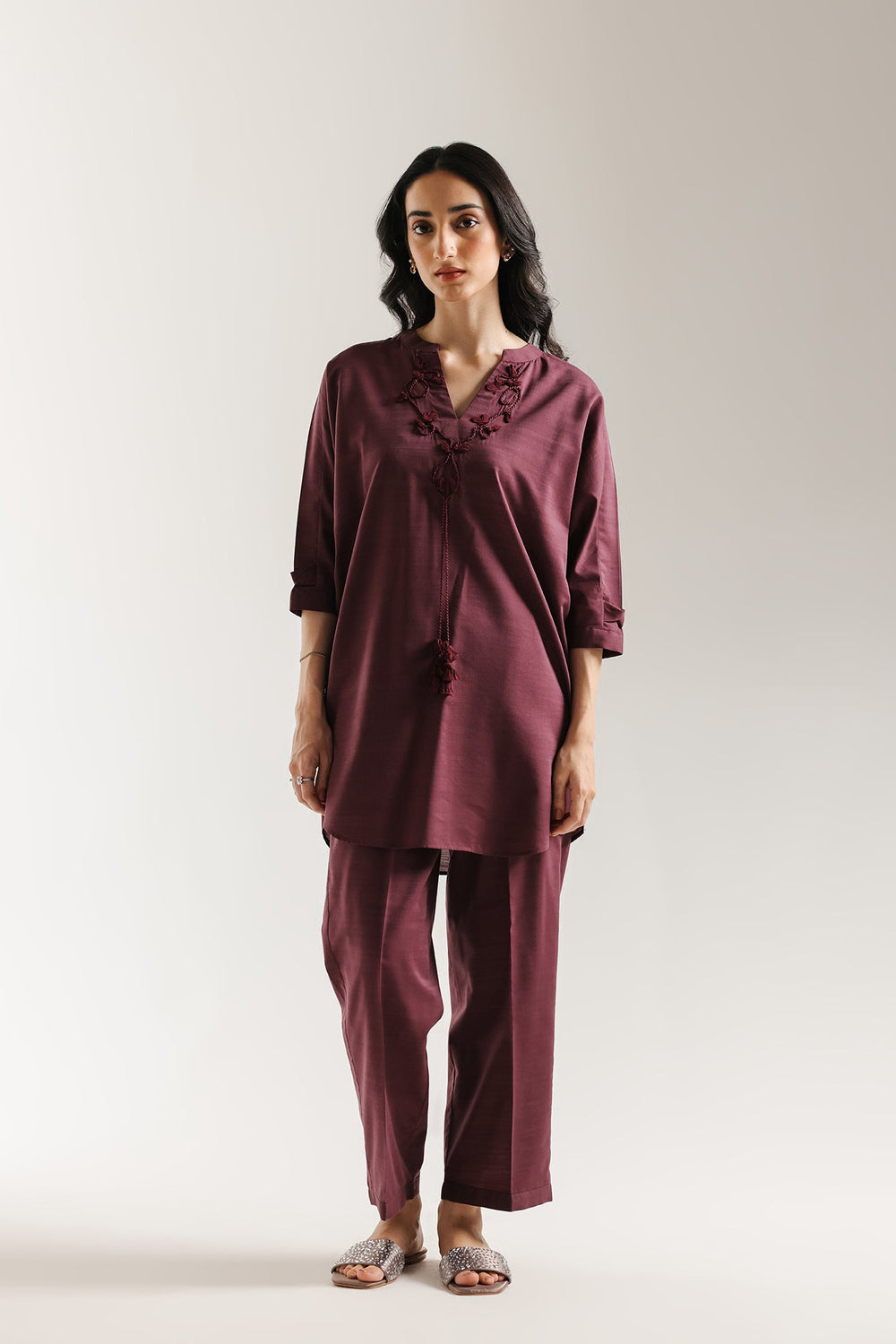 Indulge in the deep, rich tone of this effortlessly chic set. Crafted in a luxurious plum hue, the straight-cut kurta features a flattering V-neckline with delicate floral appliqués and contrasting stitch details, finished with playful tassels. The three-quarter sleeves offer a relaxed silhouette. The ensemble is perfectly matched with tailored, straight-fit trousers in the same sophisticated solid color, creating a monochrome look that is both refined and comfortably modern.