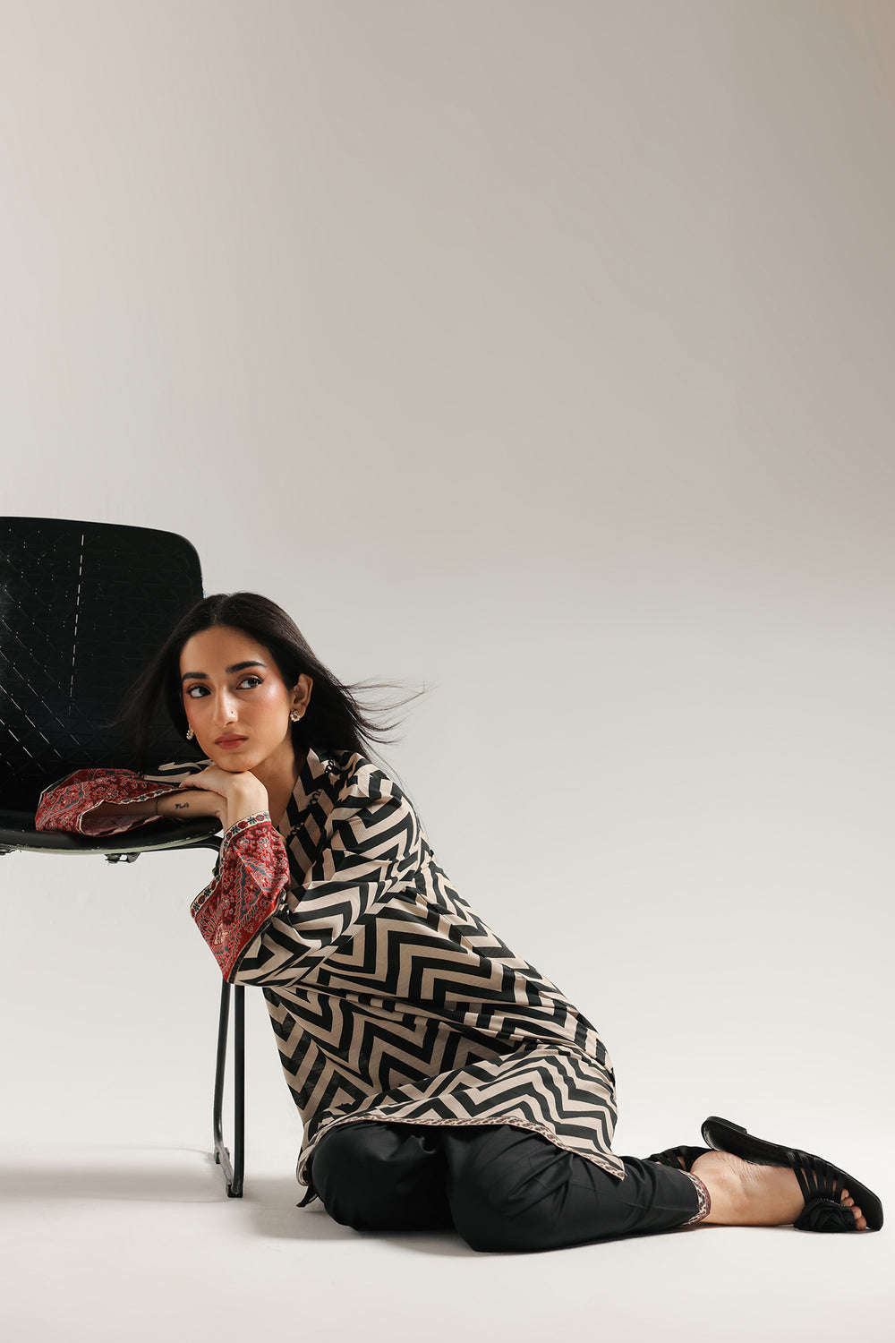 Embrace a bold and modern look with this captivating printed suit. This two-piece ensemble features a classic black and off-white zig-zag pattern throughout the shirt. The sleeves are finished with a contrasting red and black patterned cuff, adding a unique touch to the design. The suit is completed with black shalwar, making it a perfect choice for any occasion.