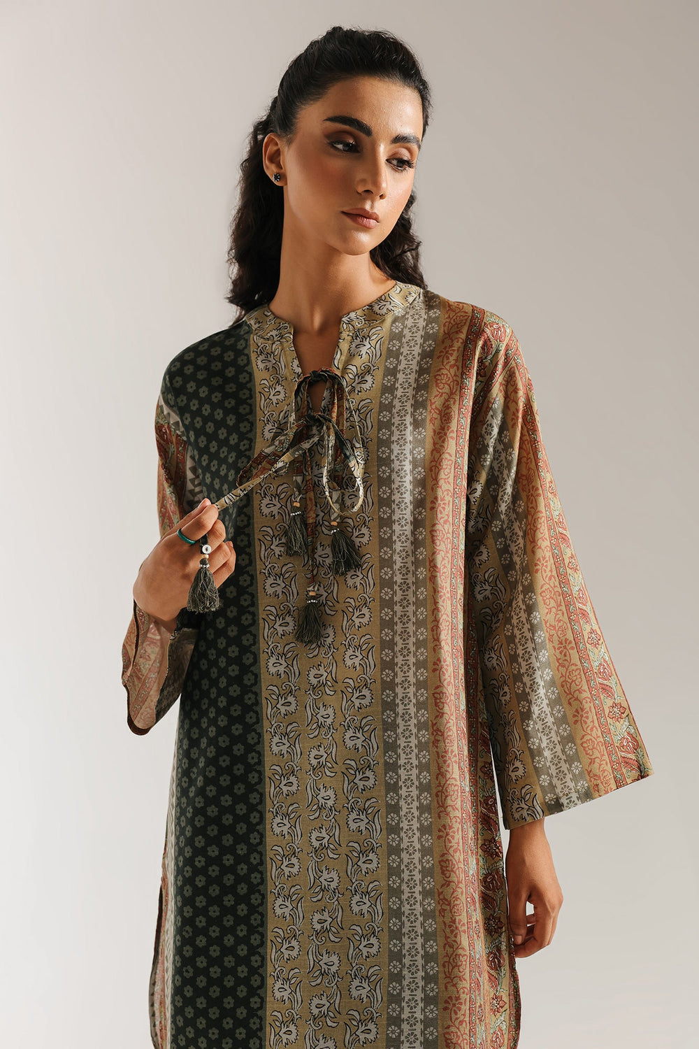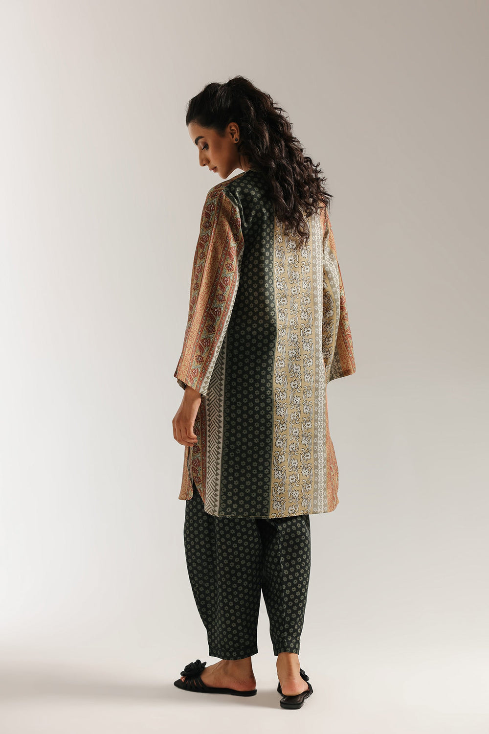 Experience the allure of mixed prints. This captivating printed suit features a unique split design on the shirt, with a blend of elegant botanical prints and geometric patterns in earthy olive and muted gold tones. Paired with coordinating patterned shalwar, the ensemble creates a harmonious and visually interesting look. This suit is a celebration of modern artistry and classic style, perfect for making a distinctive statement.