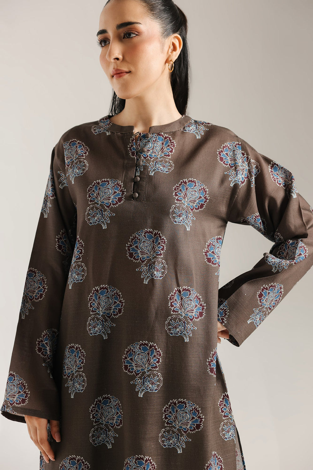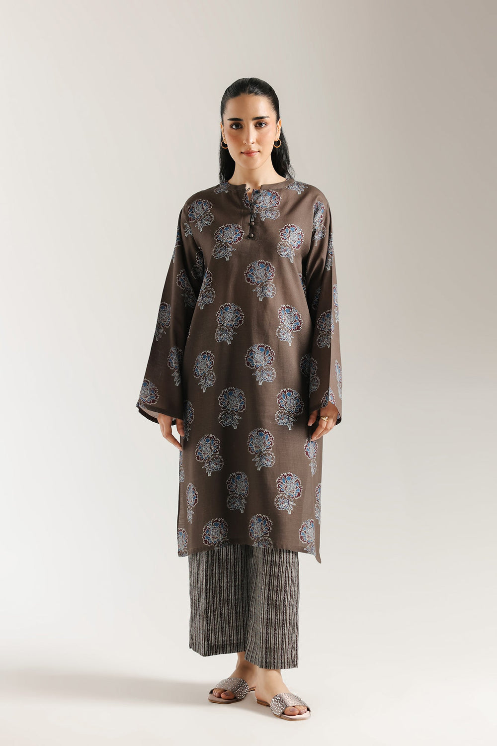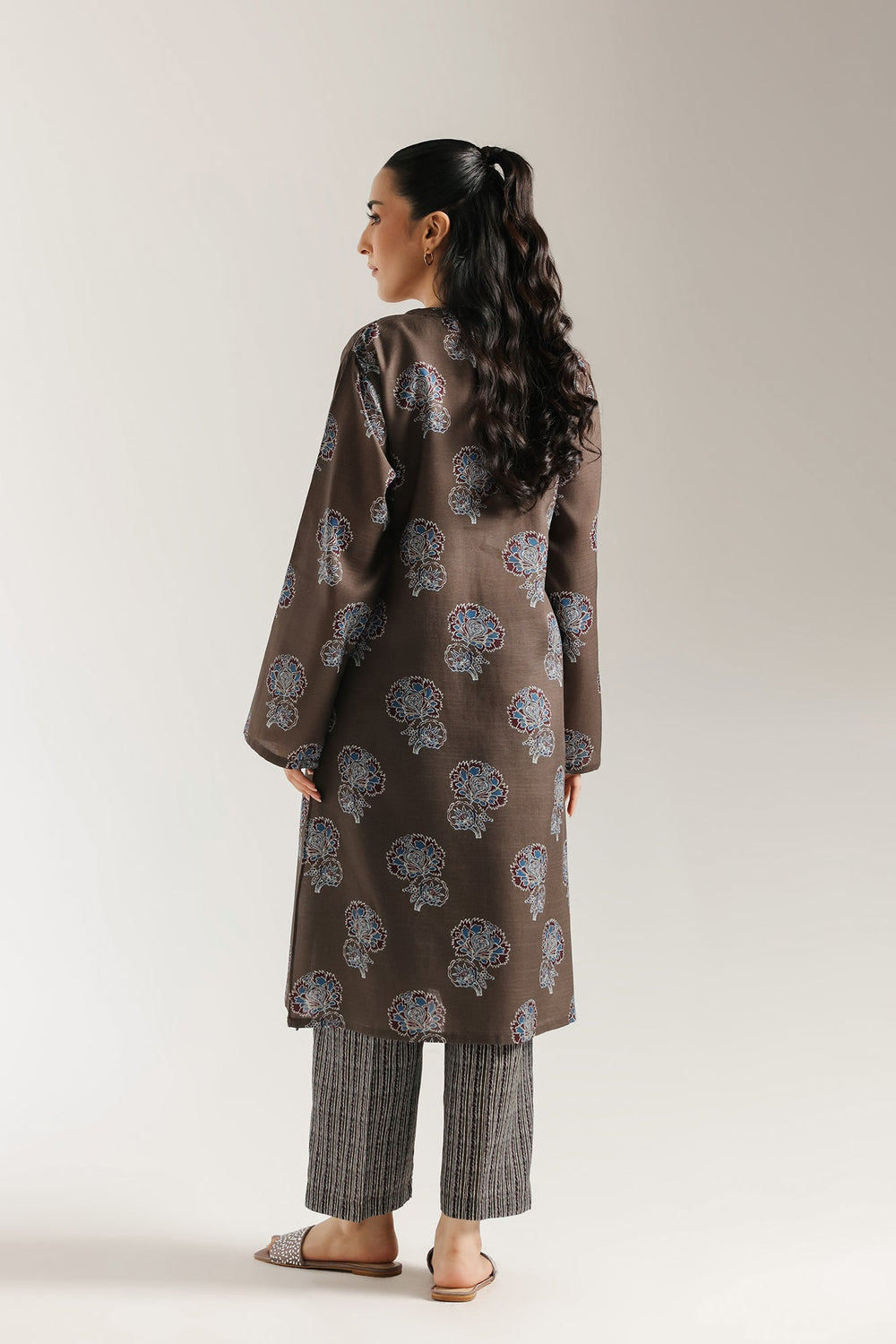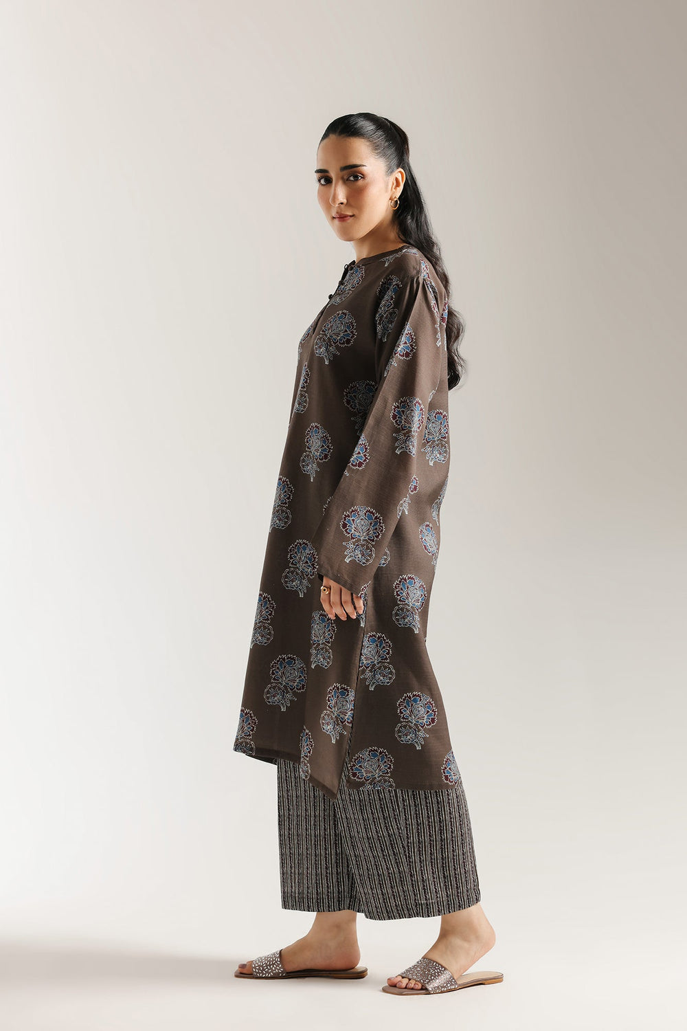 A perfect harmony of earthy tones and delicate patterns. This elegant printed suit features a beautiful, brown shirt adorned with a mesmerizing floral motif in warm hues. The look is completed with a pair of wide-leg trousers that showcase a striking contrasting stripe print. This ensemble is a unique blend of sophisticated colors and artistic designs, perfect for a refined and stylish statement.