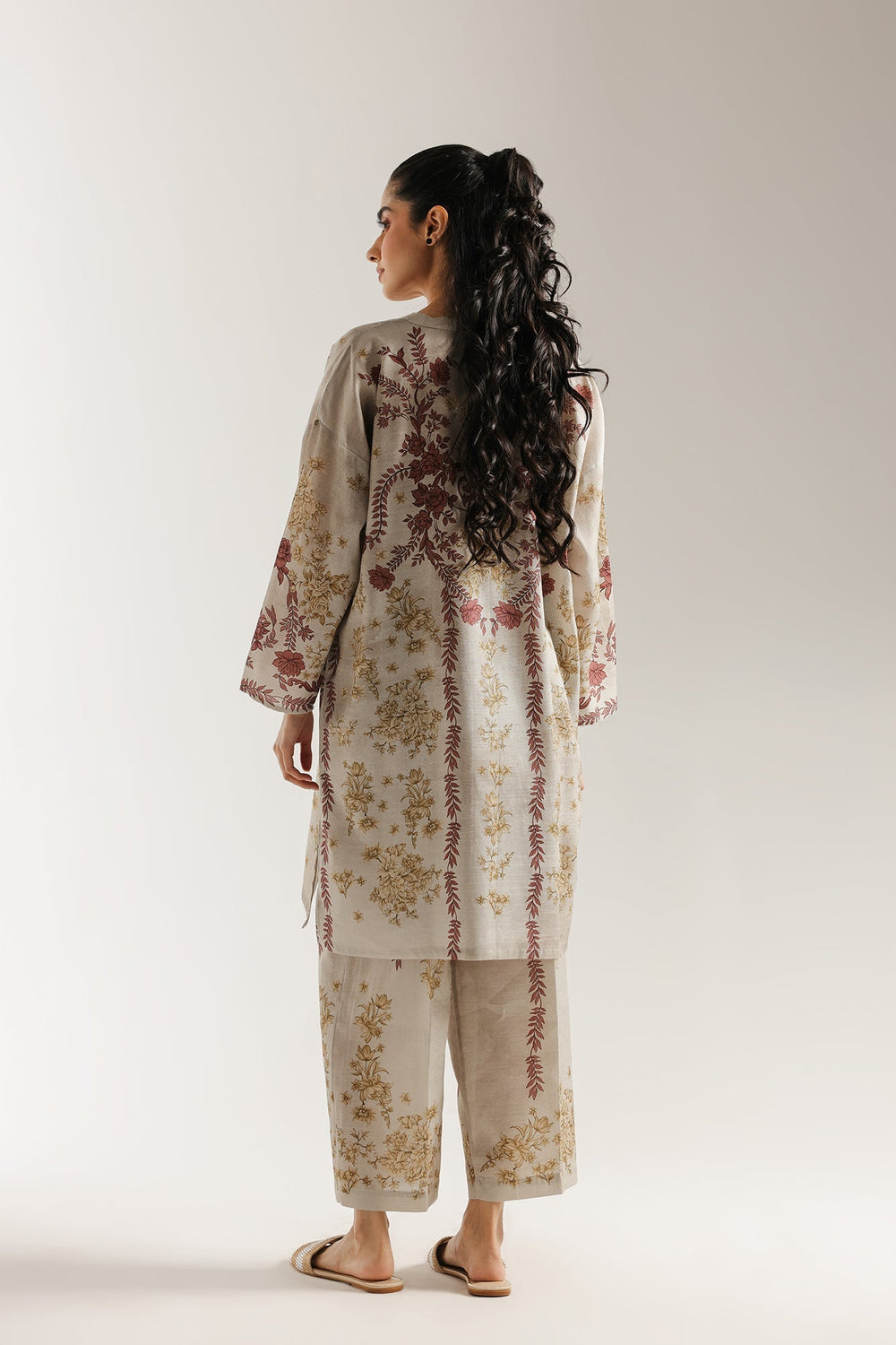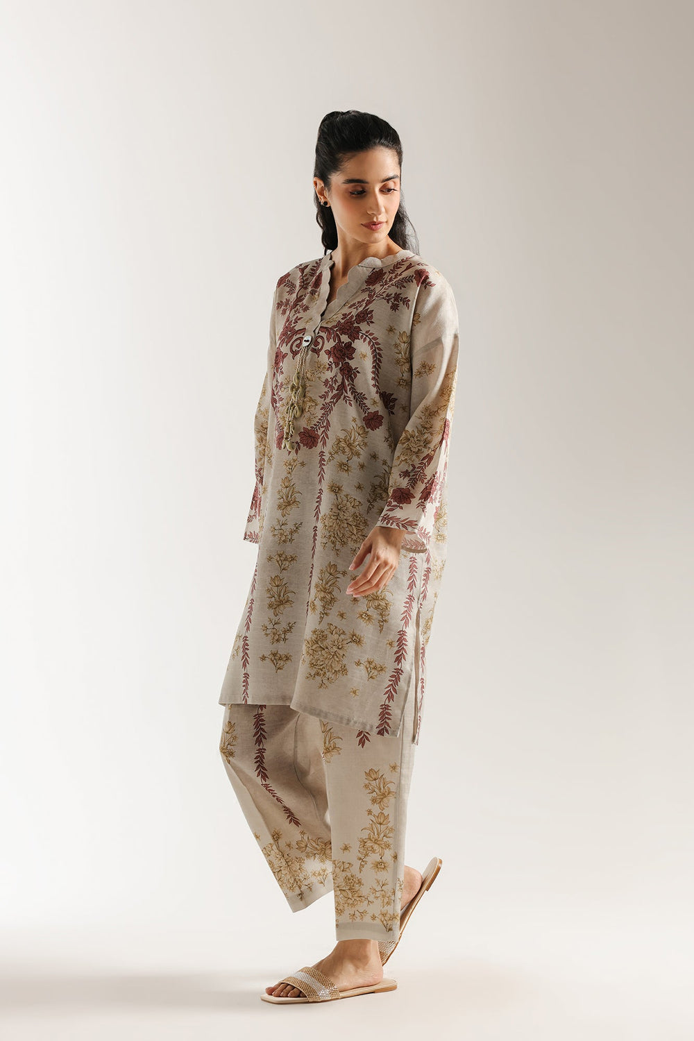 Step into timeless elegance with this exquisite printed suit. This two-piece ensemble features a beautifully designed kurta adorned with intricate floral and vine patterns in rich shades of maroon, gold, and green, set against a delicate beige background. The coordinating trousers boast a matching print, creating a harmonious and sophisticated look. With its graceful silhouette and captivating details, this suit is a perfect blend of tradition and modern style.