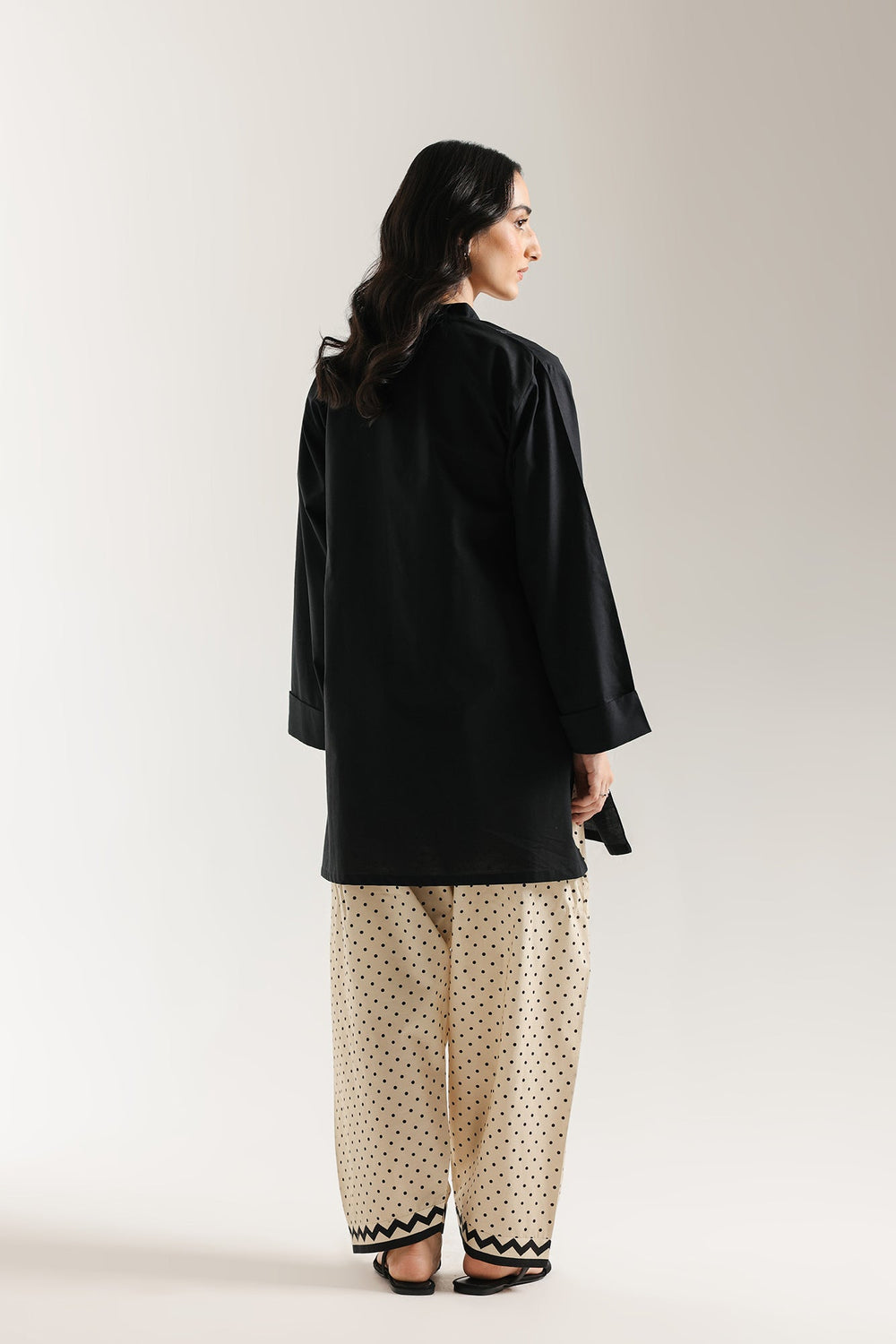 Make a statement in this striking printed suit, which effortlessly blends modern minimalist style with a playful print. The black, A line-cut kurta features a flattering V-neckline with contrasting white stitch detailing that traces the edges and a simple front button placket. The top is paired with chic, wide-leg shalwar in a beautiful beige color adorned with an all-over black polka-dot print and a bold, chevron-patterned border at the hem, creating a unique and sophisticated contrast.