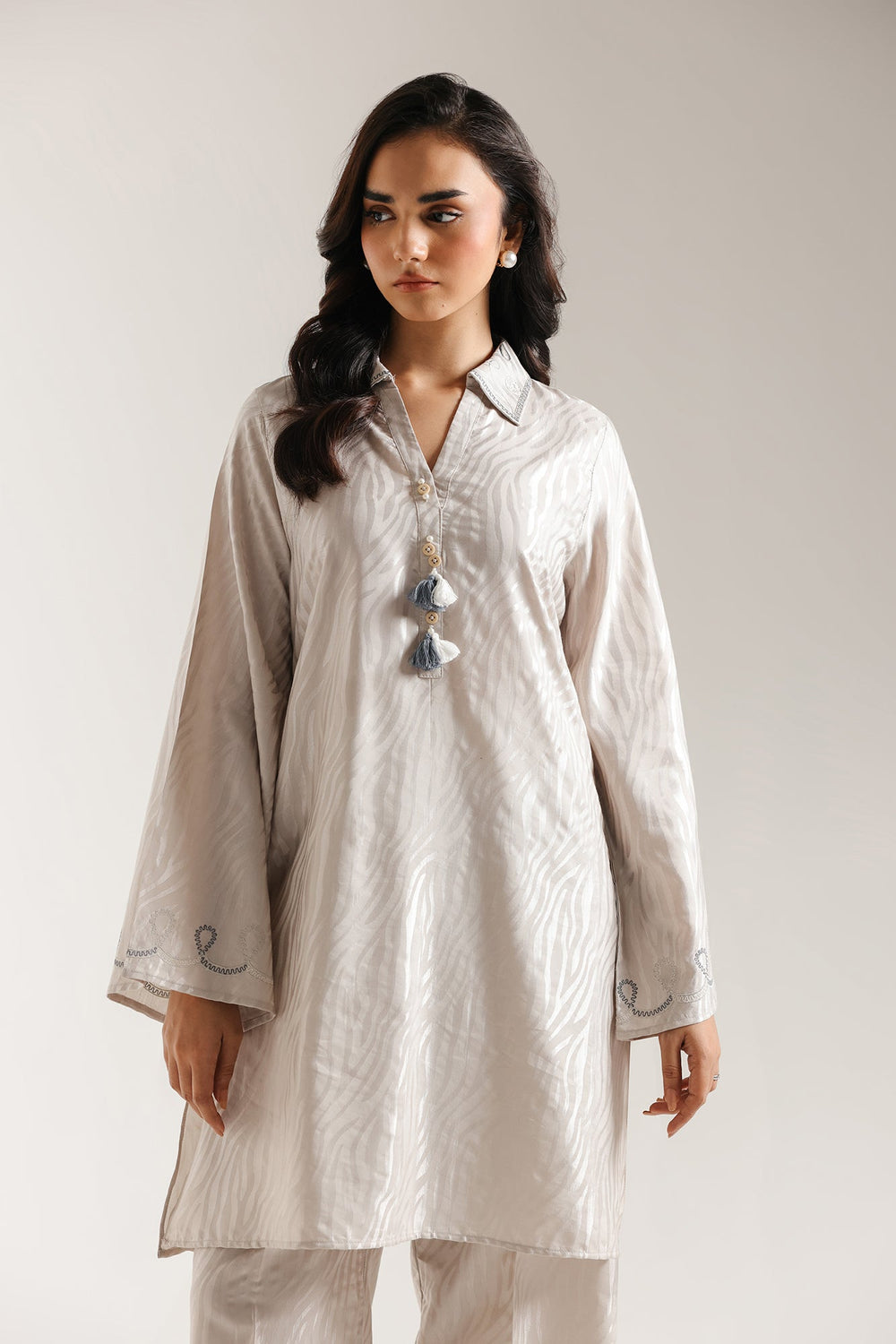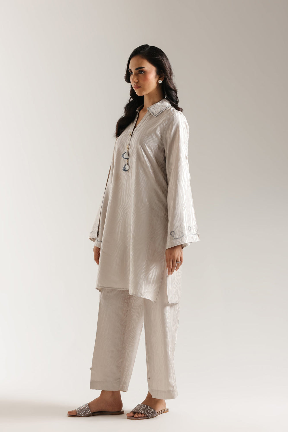Envelop yourself in shimmering sophistication with this graceful two piece suit. The ensemble features a short kurti in a luminous stone grey fabric. The fabric has a subtle sheen and a delicate zebra wave jacquard texture throughout. The shirt is accented at the V-neckline with a decorative neckline featuring charming tassels and delicate tonal embroidery around the cuffs and collar. It is paired with perfectly matching straight-cut trouser, continuing the same rich, textured fabric for a chic monochromatic look. This suit offers a sophisticated and elevated ensemble for any modern occasion.