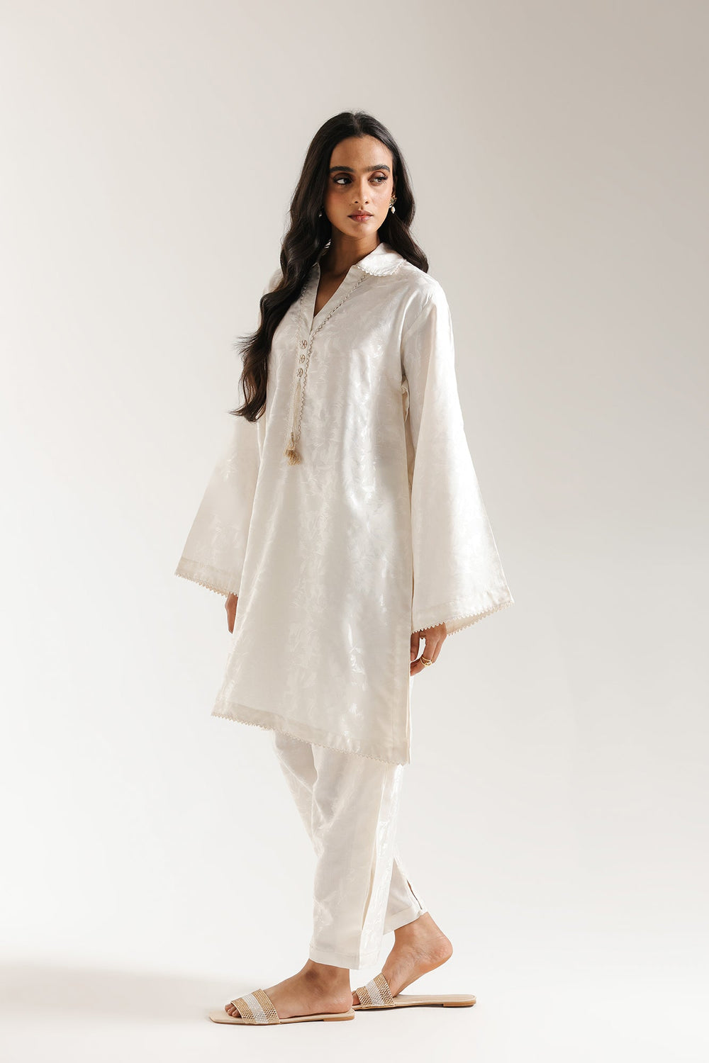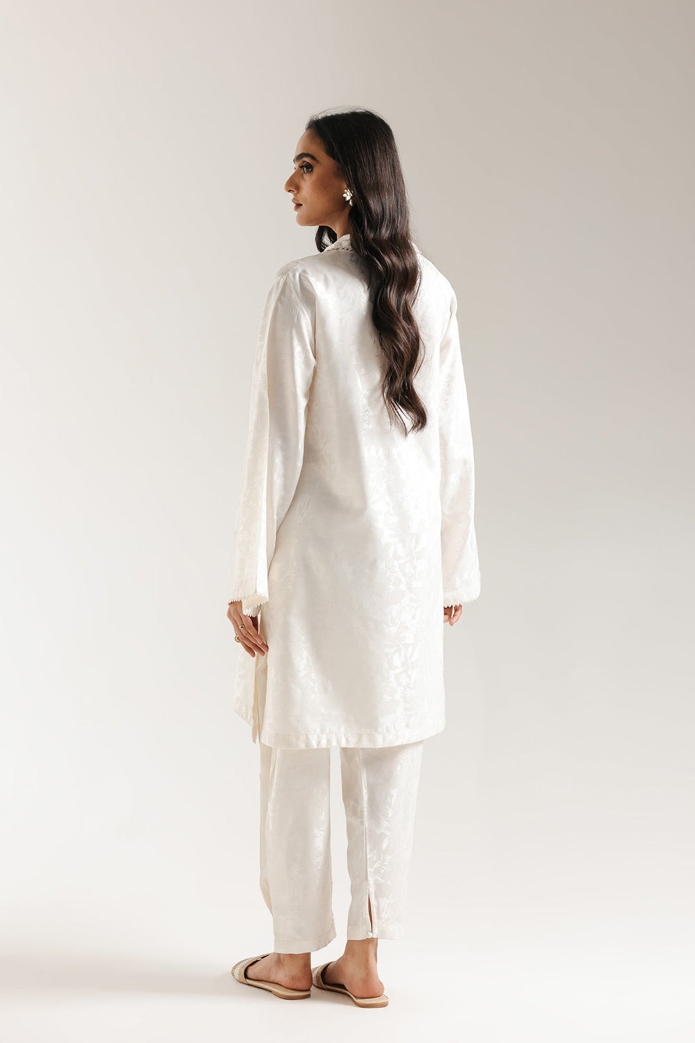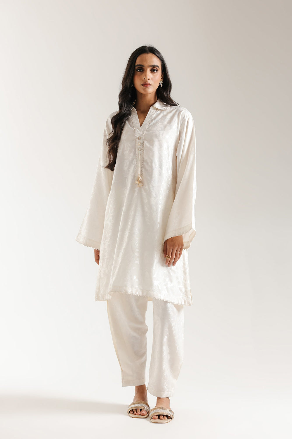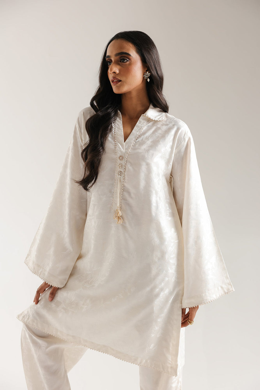 Step out in ethereal grace with this stunning white solid suit. This elegant monochromatic ensemble is crafted from a luminous, textured fabric that features a beautiful tonal jacquard floral pattern throughout. The A line -cut kurti has a delicate V-slit neckline, accented with a small buttons and gold tassels, and is finished with subtle lace detailing on the cuffs and along the hem. The matching shalwar complete this luxurious and sophisticated outfit, perfect for evening wear or special occasions.