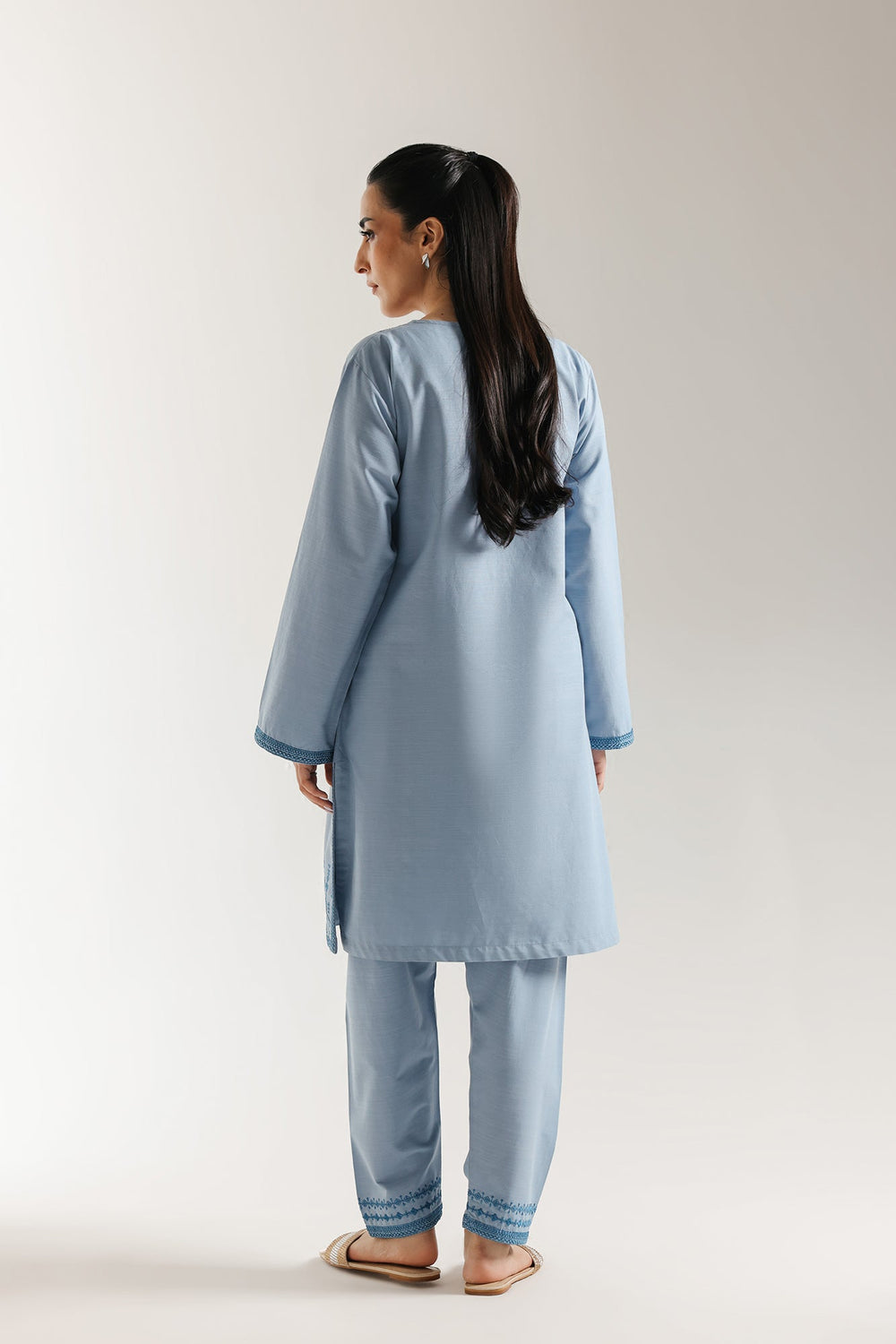 Immerse yourself in the serene elegance of this soft blue embroidered suit. The short, straight-cut kurta is crafted from a light, airy blue fabric and features beautiful, minimalist thread embroidery in a complementary blue hue. The design focuses on striking geometric patterns across the yoke and down the central panel, blending traditional motifs with a clean, contemporary aesthetic. It features a flattering V-neckline with subtle trim and full sleeves. The ensemble is completed by coordinating blue shalwar in the same shade, creating a comfortable and sophisticated monotone look.