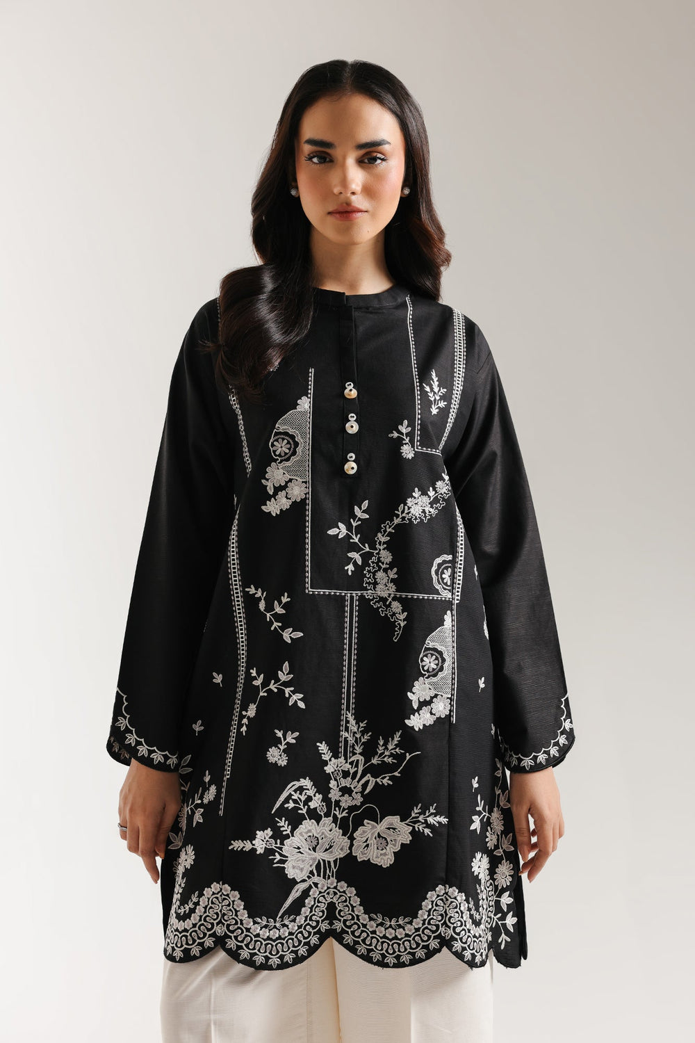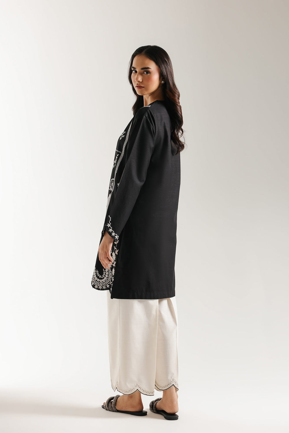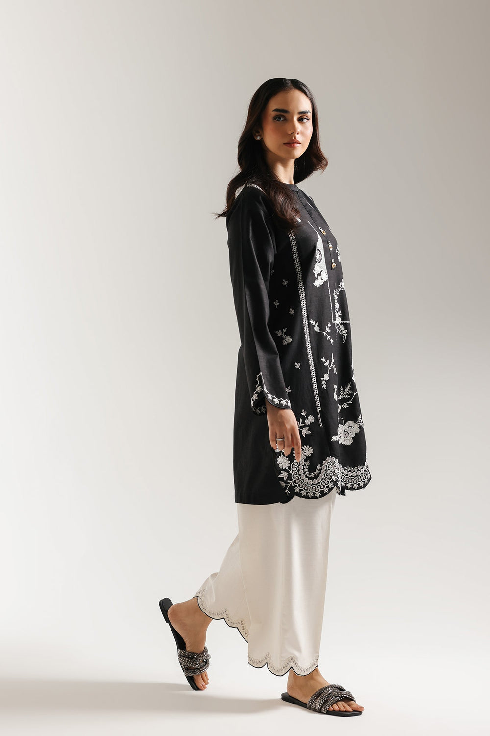 Envelop yourself in classic monochrome elegance with this refined black embroidered suit. The ensemble features a short kurti in a striking solid black fabric. It is beautifully embellished with white embroidery. The embroidery forms intricate floral and geometric patterns that adorn the neckline, front panels, and the wide sleeves. The shirt has a band collar and a placket, complemented by wide, flowing sleeves. This versatile piece is paired with solid white straight trouser, completing a sophisticated and timeless look.