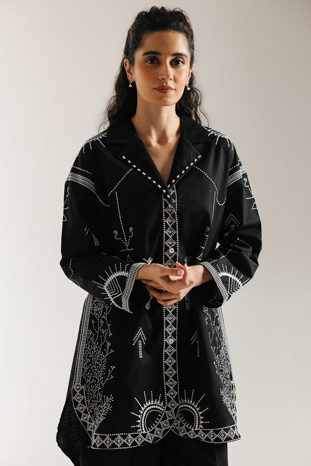 Dive into sharp, monochromatic style with this dramatic black and white embroidered suit. The short, straight-cut kurta is crafted from a deep black fabric, featuring striking white thread embroidery in a folk-art-inspired geometric and stylized bird motif. The V-neckline has a classic notch collar and button accents, while the round hemline is beautifully finished with embroidered border. The ensemble is completed by coordinating trouser in the same deep black. The trouser feature matching white embroidery detail near the hem, creating a comfortable, cohesive, and visually impactful traditional look.