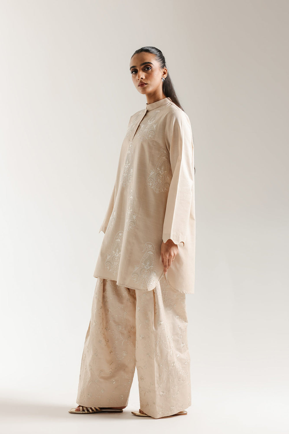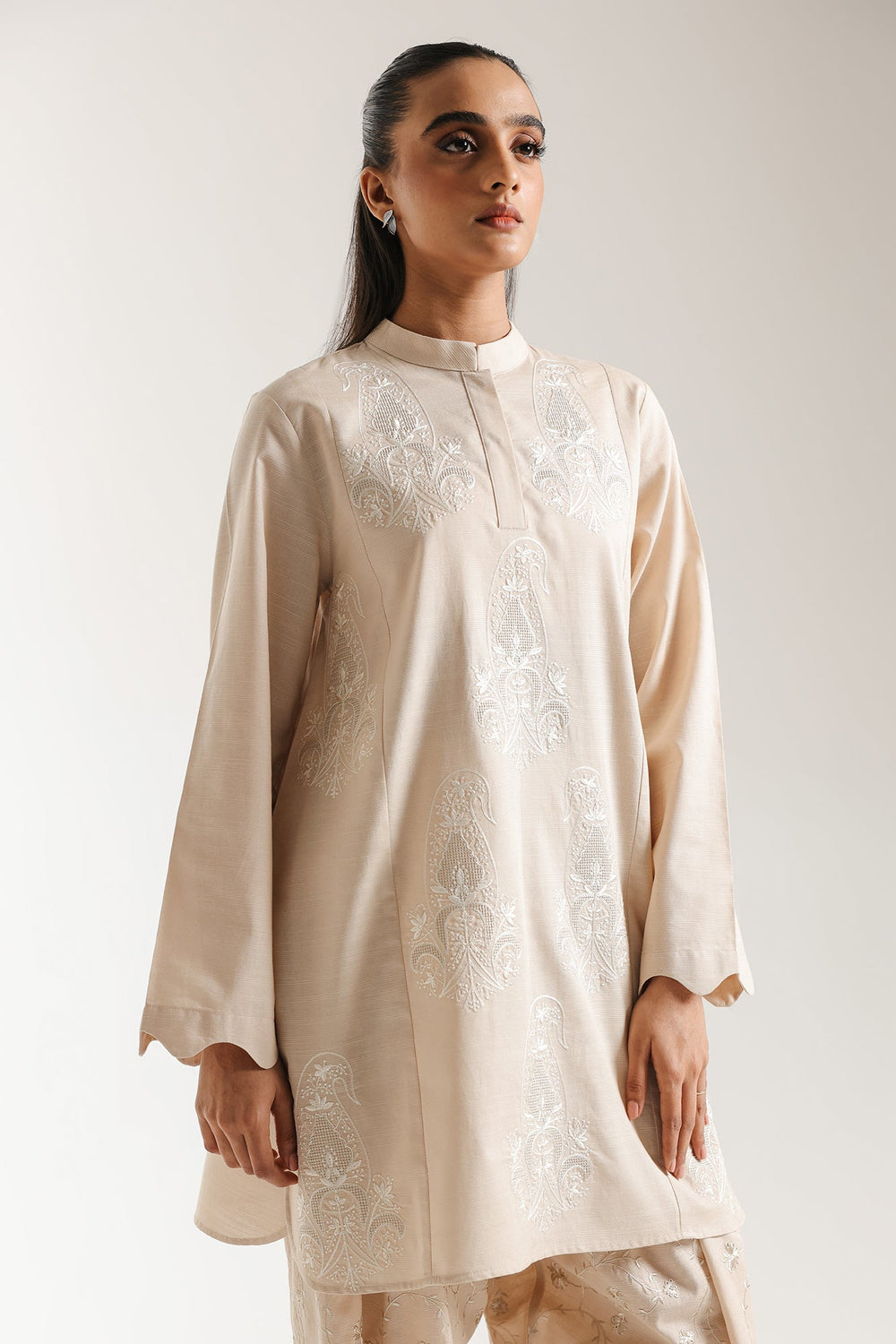 Channel serene sophistication with this stunning off white embroidered suit. The relax fit kurti is crafted from a light, subtle beige fabric and features intricate white thread embroidery in a dense, regal motif across the yoke and chest area. The kurti has a band collar neckline and is finished with an elegant scalloped edge on the cuffs. Completing the graceful ensemble is coordinating wide leg shalwar adorned with matching scattered white embroidery, making this an exquisite and luminous choice for any formal occasion.