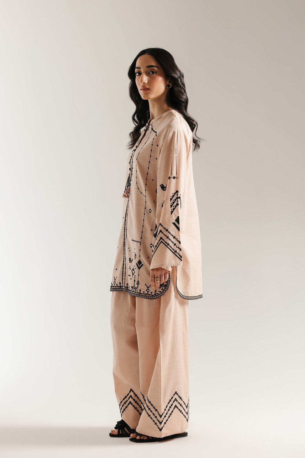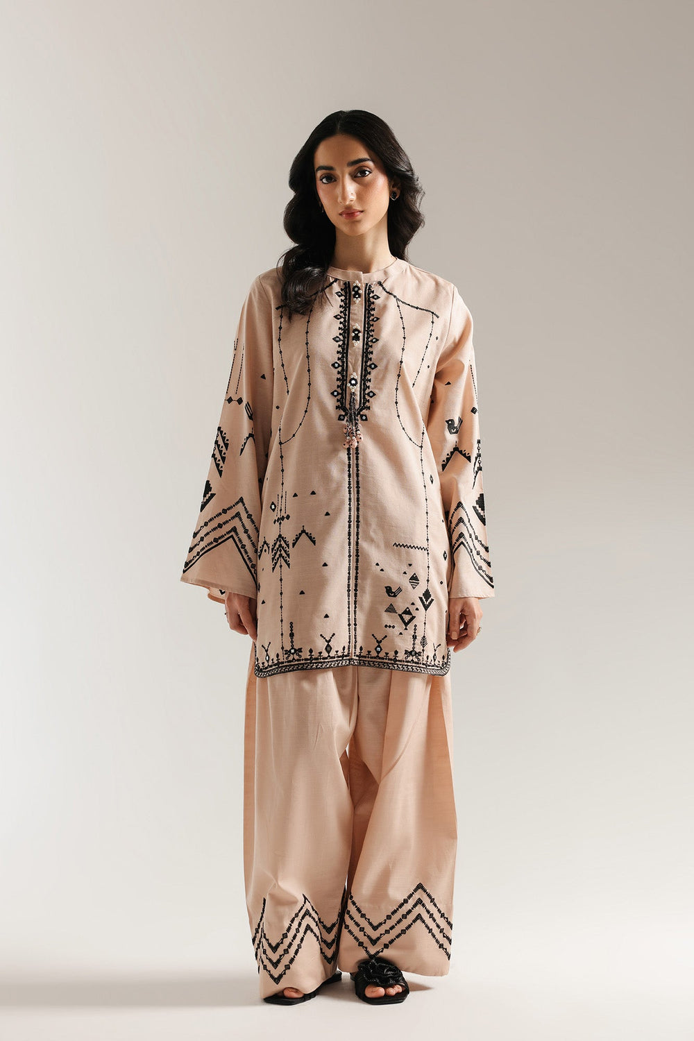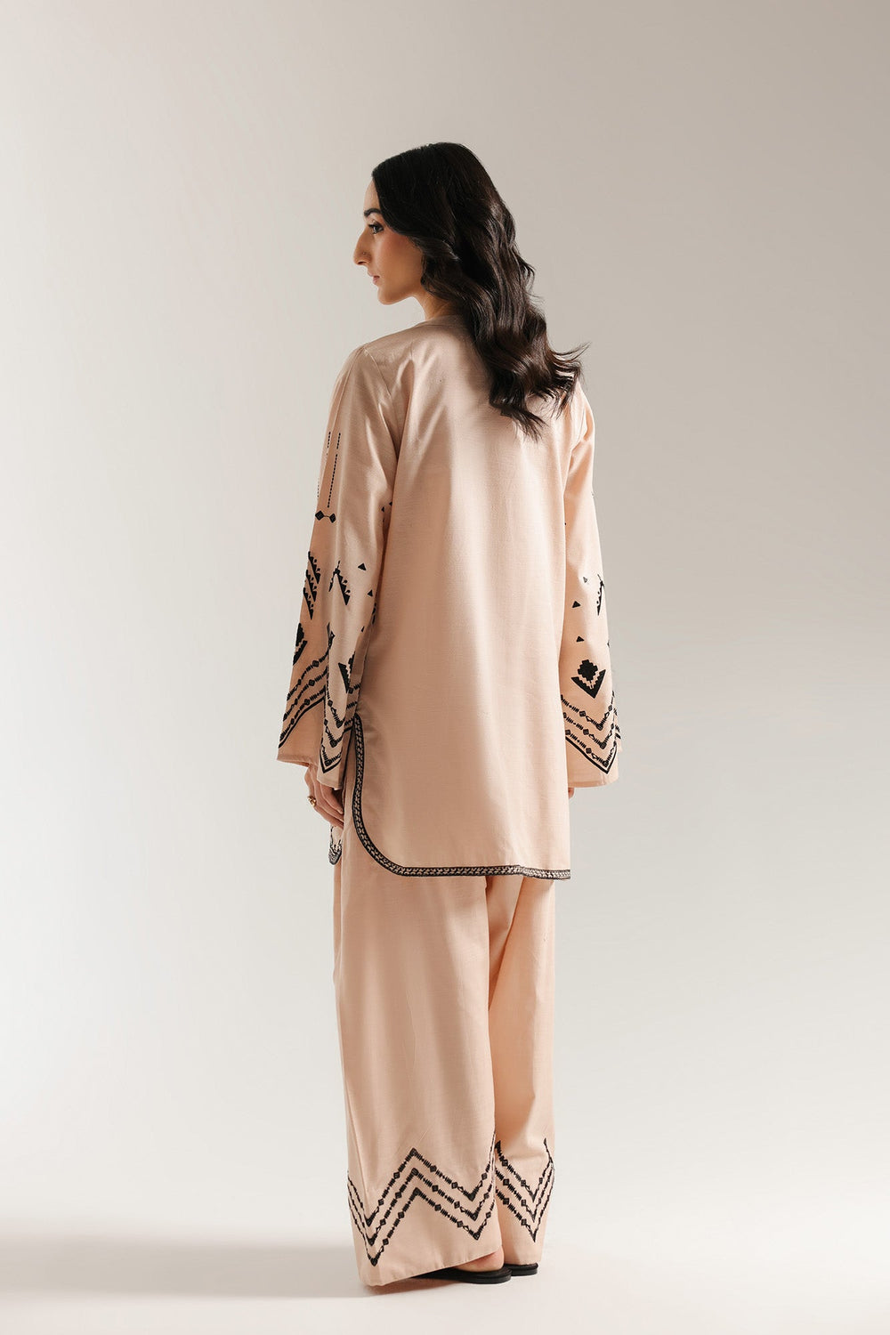 Discover the serene elegance of this beautiful embroidered suit. This two-piece ensemble is a true masterpiece of intricate design. The soft peach base of the shirt serves as a graceful canvas for the elaborate black geometric and floral embroidery. The detailed patterns on the neckline, front, and sleeves create a truly mesmerizing look. The suit is completed with matching shalwar, making it a perfect choice for any occasion.