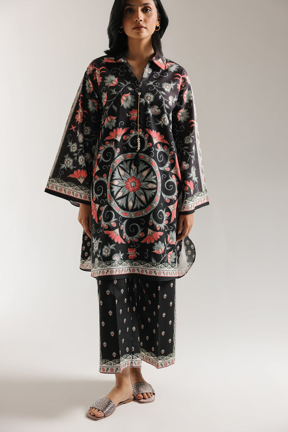 Indulge in the graphic beauty of this striking black printed suit. This chic ensemble features a medium-length kurti and matching straight trouser, both crafted in a rich black base fabric. The shirt is adorned with a captivating digital print featuring ornate, stylized floral and swirling motifs in striking coral-pink, soft green, and ivory, centered around a large circular pattern on the front. It features a smart shirt collar with a V-split, accented by delicate detailing. The coordinating trouser feature an all-over smaller repeating print. This piece effortlessly combines modern graphic style with traditional patterns for a dramatic and polished look.