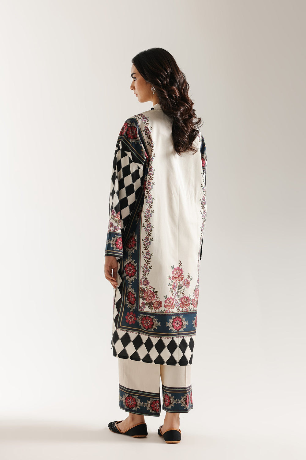 Make a striking statement with this stunning printed suit, which boldly combines traditional motifs with graphic modern elements. The straight-cut kurta features a beautiful off-white canvas with a vibrant floral wreath print across the front and hem in shades of pink, red, and blue. This romantic print is sharply contrasted by a bold black and white harlequin diamond pattern that frames the sides and wide sleeves. The ensemble is perfectly completed with tailored off-white trouser that feature a coordinating geometric and floral border print at the hem, creating an unforgettable, high-impact look.