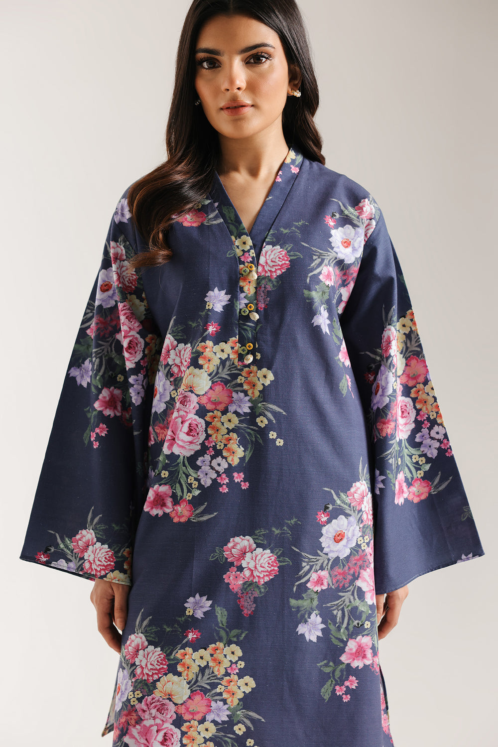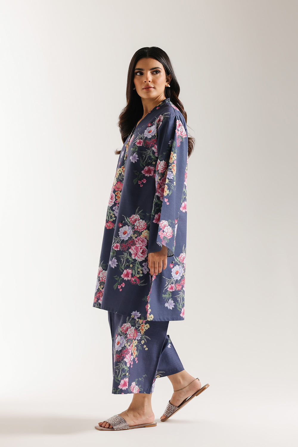 Adorn yourself in the beauty of a garden with this striking navy blue printed suit. The set features a shirt in a rich, dark navy blue fabric, completely blanketed in an all-over vivid floral print. The print showcases large, realistic blooms in shades of blush pink, mauve, yellow, and green. The shirt has a flattering V-neckline and wide, comfortable sleeves. It is perfectly paired with coordinated culotte trouser in the matching floral print. This bold and beautiful ensemble is ideal for a vibrant, coordinated look at any social or festive occasion.