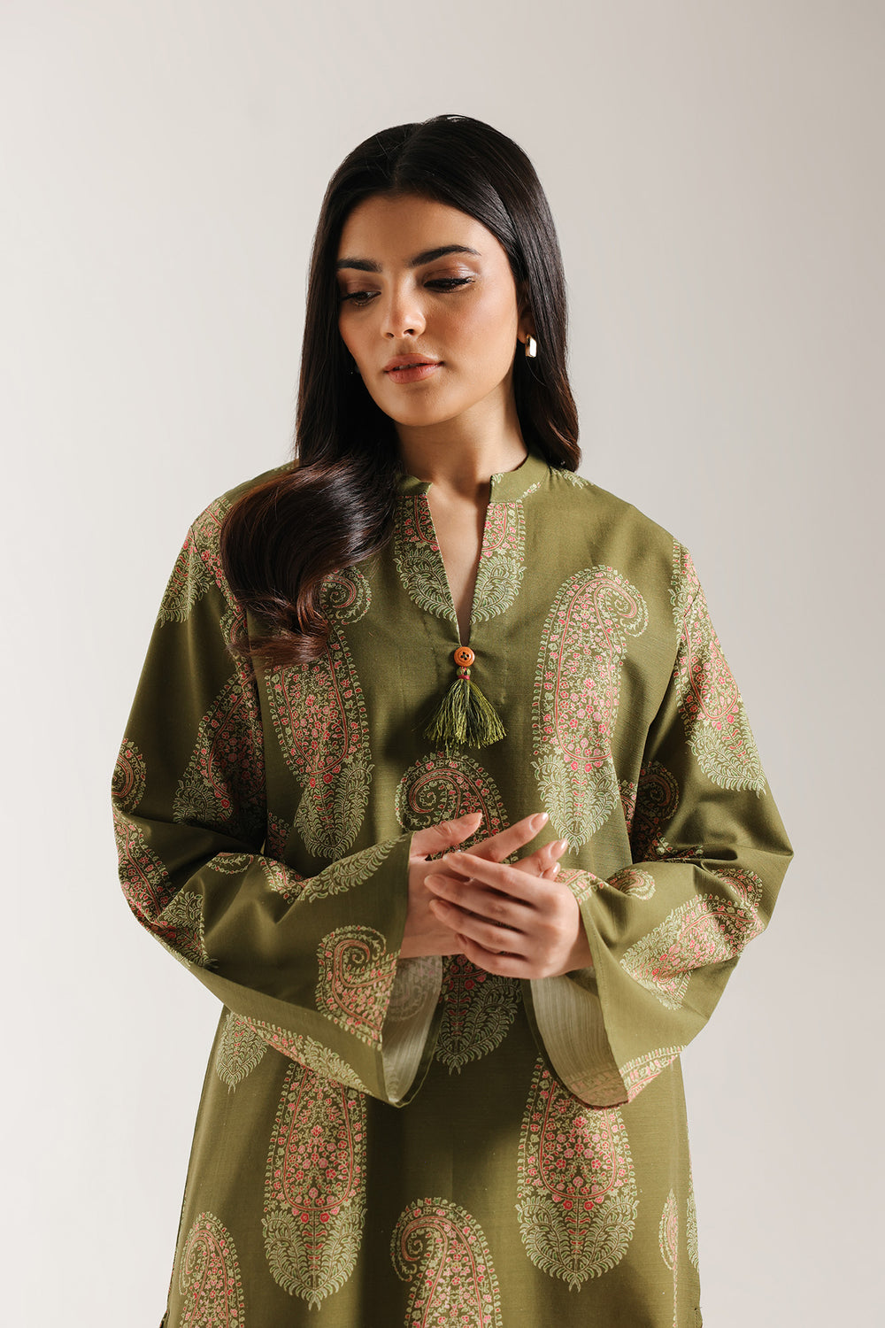 Wrap yourself in rich, earthy tones with this beautifully contrasted printed suit. The set features a shirt in a deep, olive green fabric, adorned with an all-over paisley motif in contrasting shades of pink and beige. The shirt maintains a relaxed, straight silhouette with a slit neckline, decorated with a small tassel accent, and wide, comfortable sleeves. It is paired with shalwar in a striking red and white chevron ikat print, offering a vibrant and playful contrast to the paisley tunic. This ensemble is a fashionable choice for a statement look at any casual or semi-formal event.